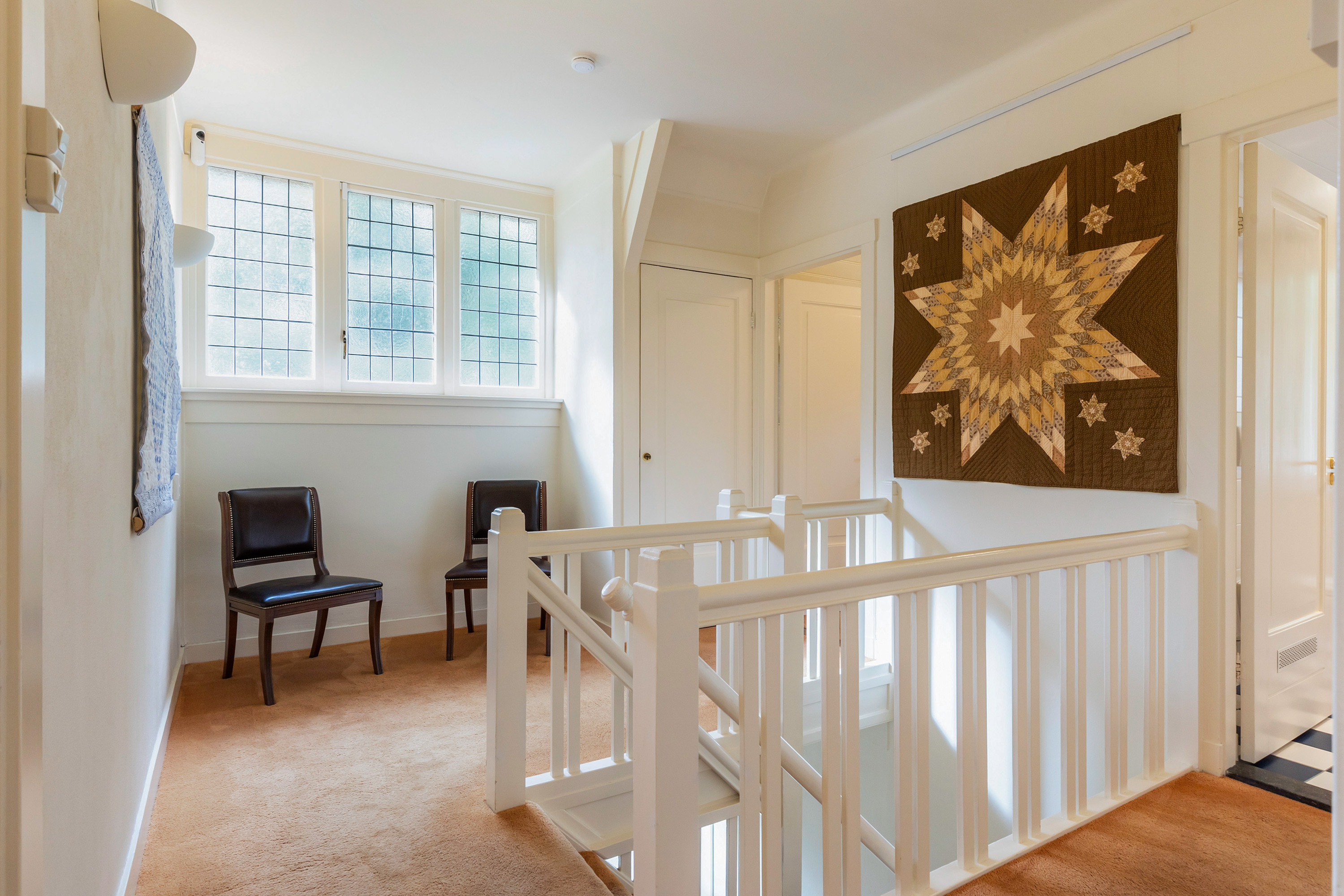 The staircase in the central hall leads to the landing, where a three-part stained glass window casts a play of coloured light.