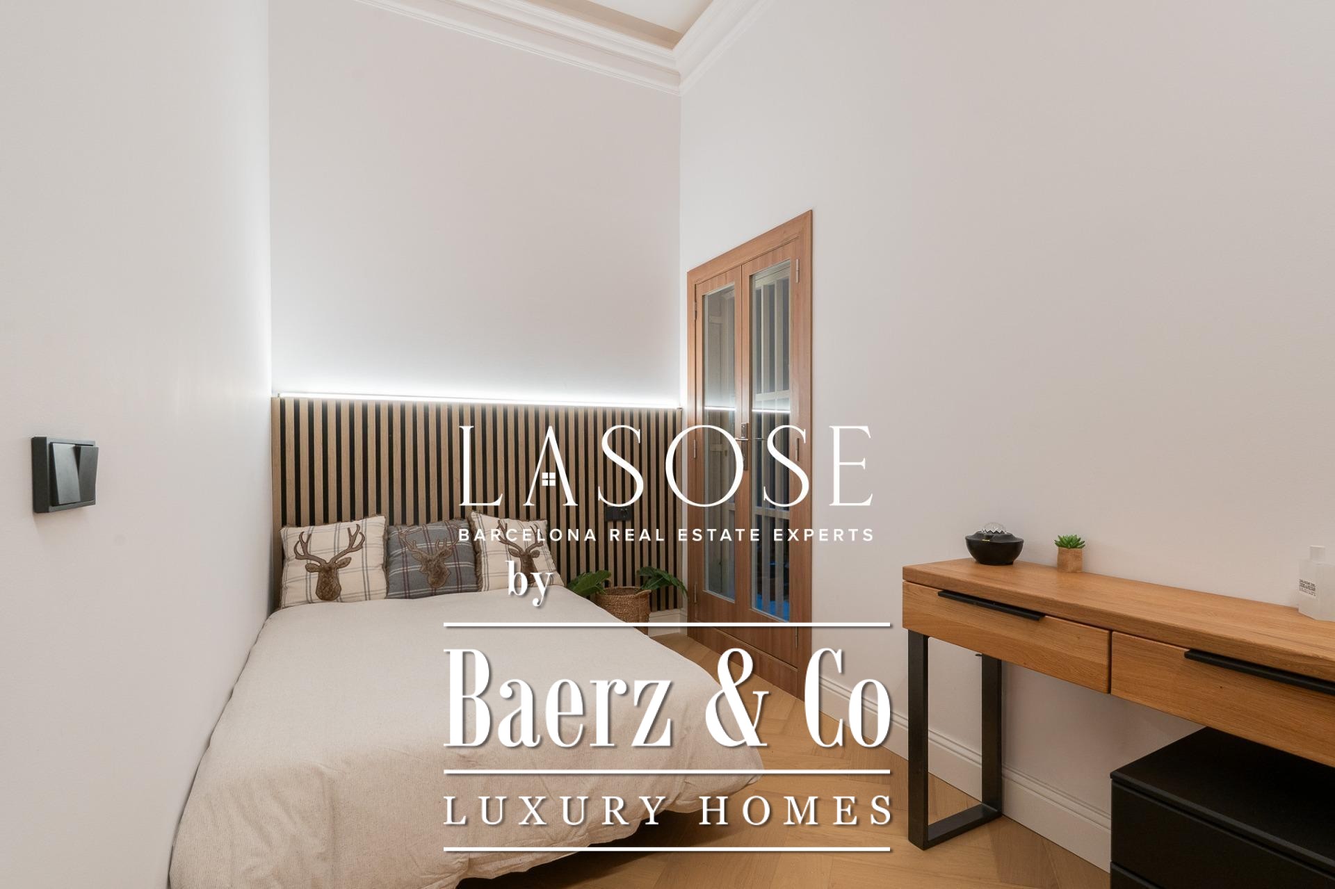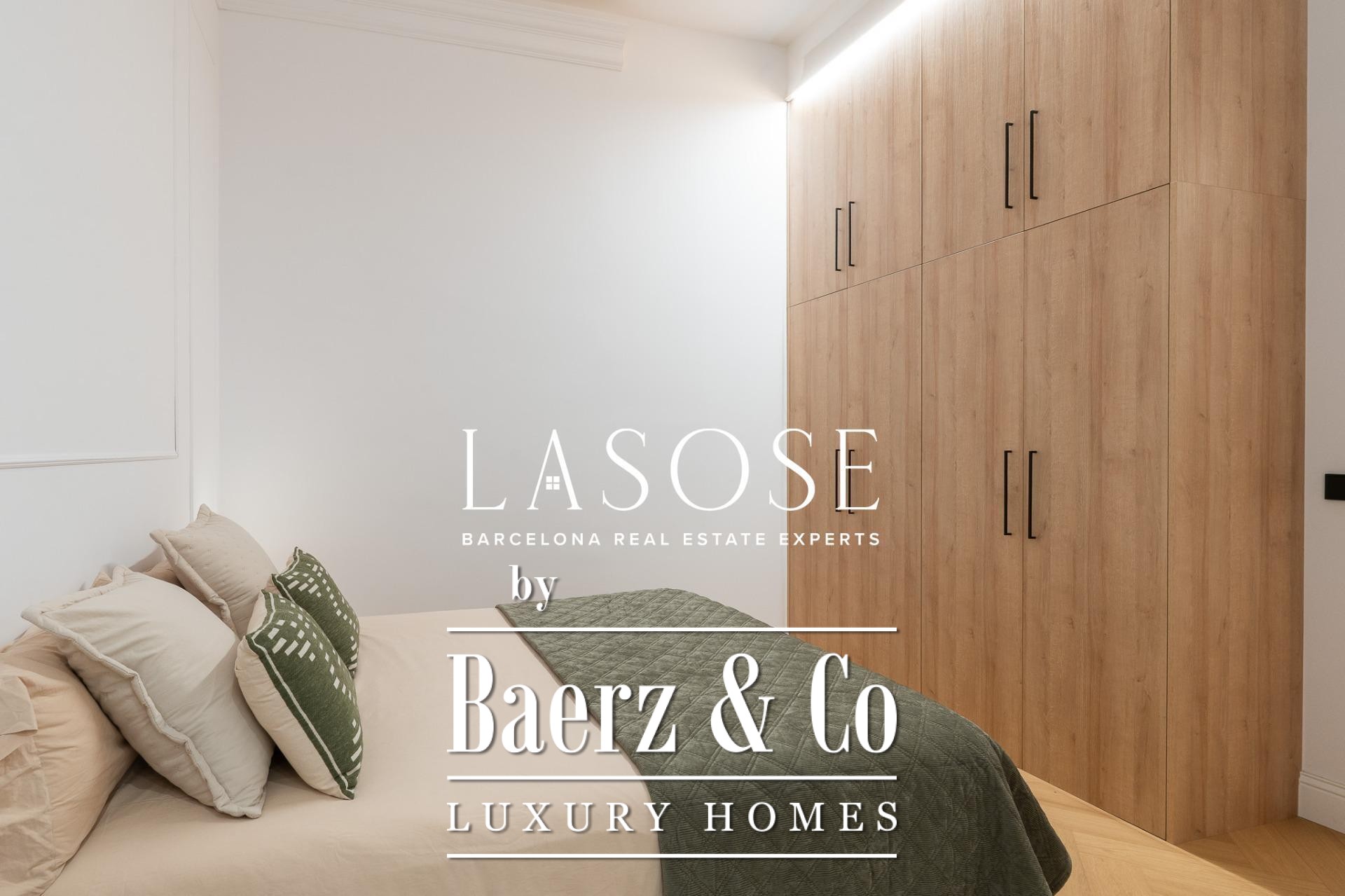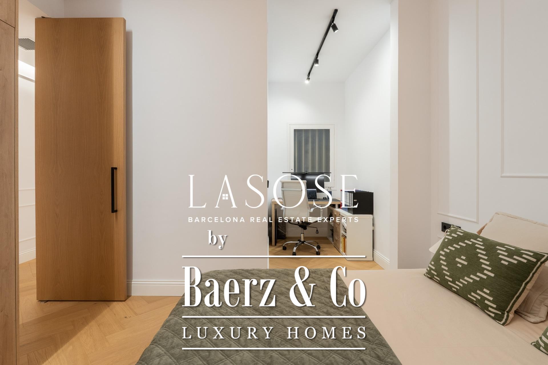 The apartment’s layout is defined by a spacious independent living and dining room with high ceilings, three bedrooms—including a refined en-suite, one double, and one single—and two full bathrooms. A fully equipped kitchen features contemporary design with premium materials, providing a seamless blend of modernity and tradition. A balcony of about 4.61 square meters offers light, city views, and a direct connection to the atmosphere of Carrer de Casp.