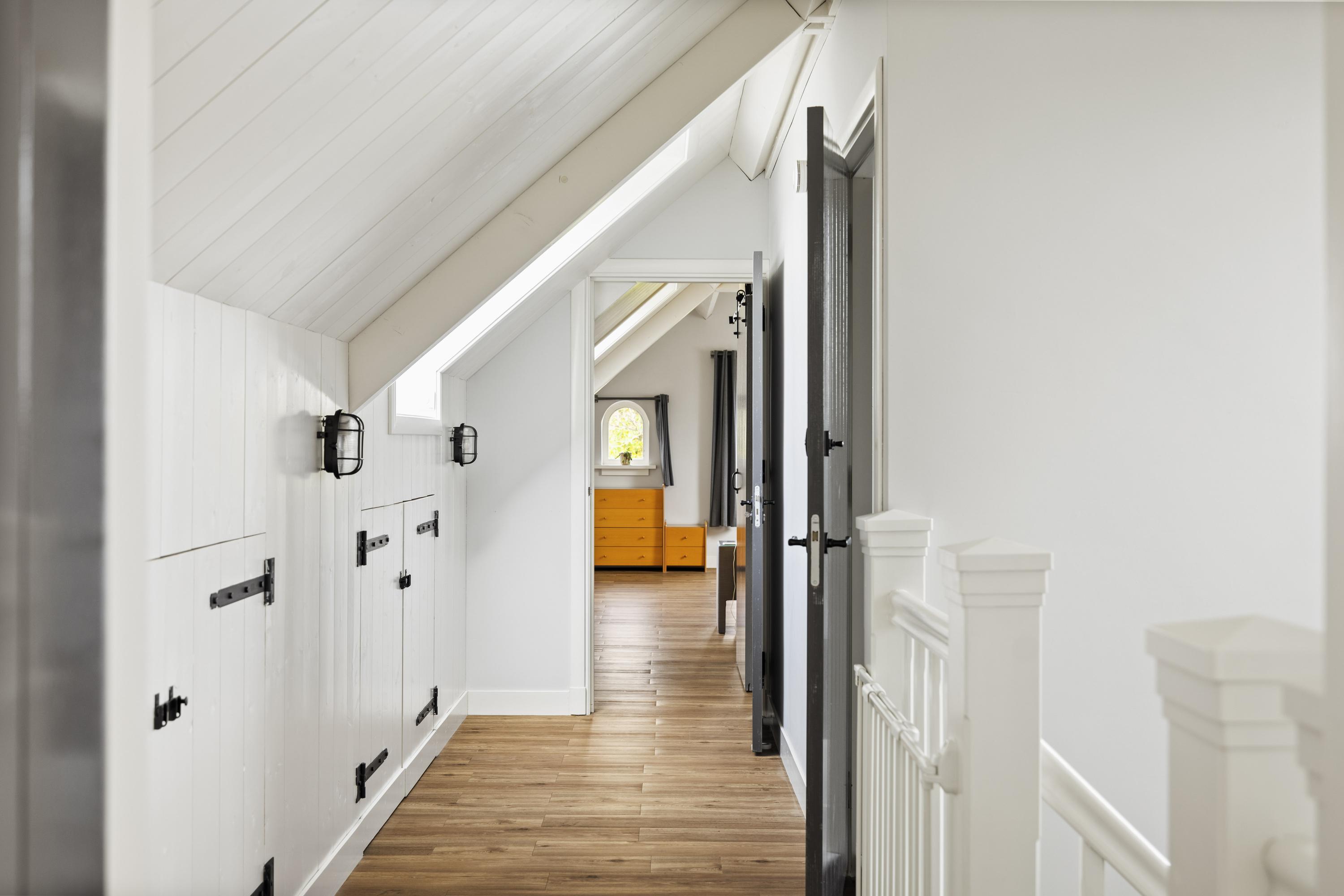 Upstairs is a spacious landing with plenty of storage space and two lovely bedrooms, also with plenty of storage space and each with its own bathroom. The walls with concrete Ciré give the rooms a chic and contemporary look. Both bathrooms have a spacious walk-in shower, toilets with Wisa non-touch flushing system and washbasin (Grohe Sphinx).