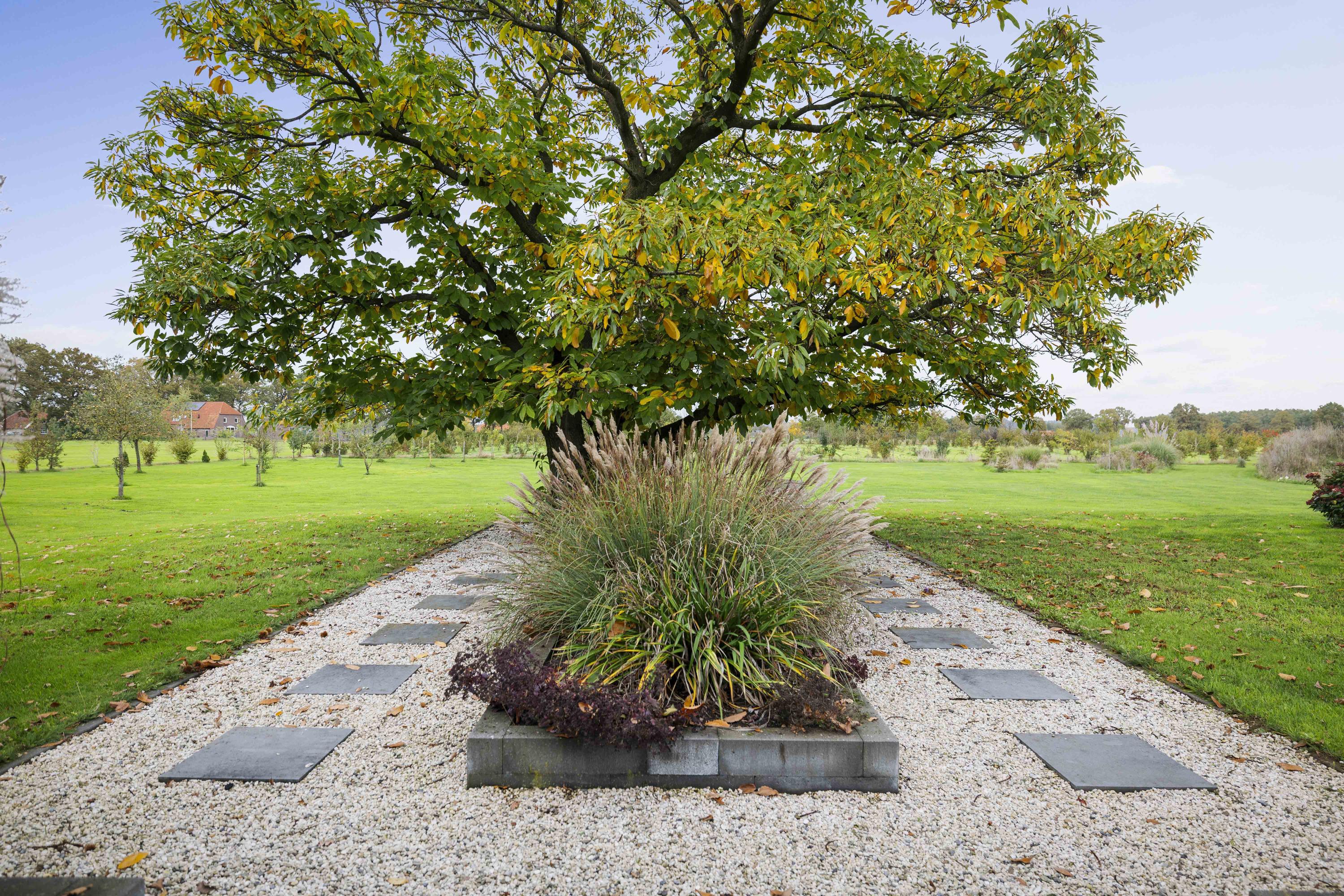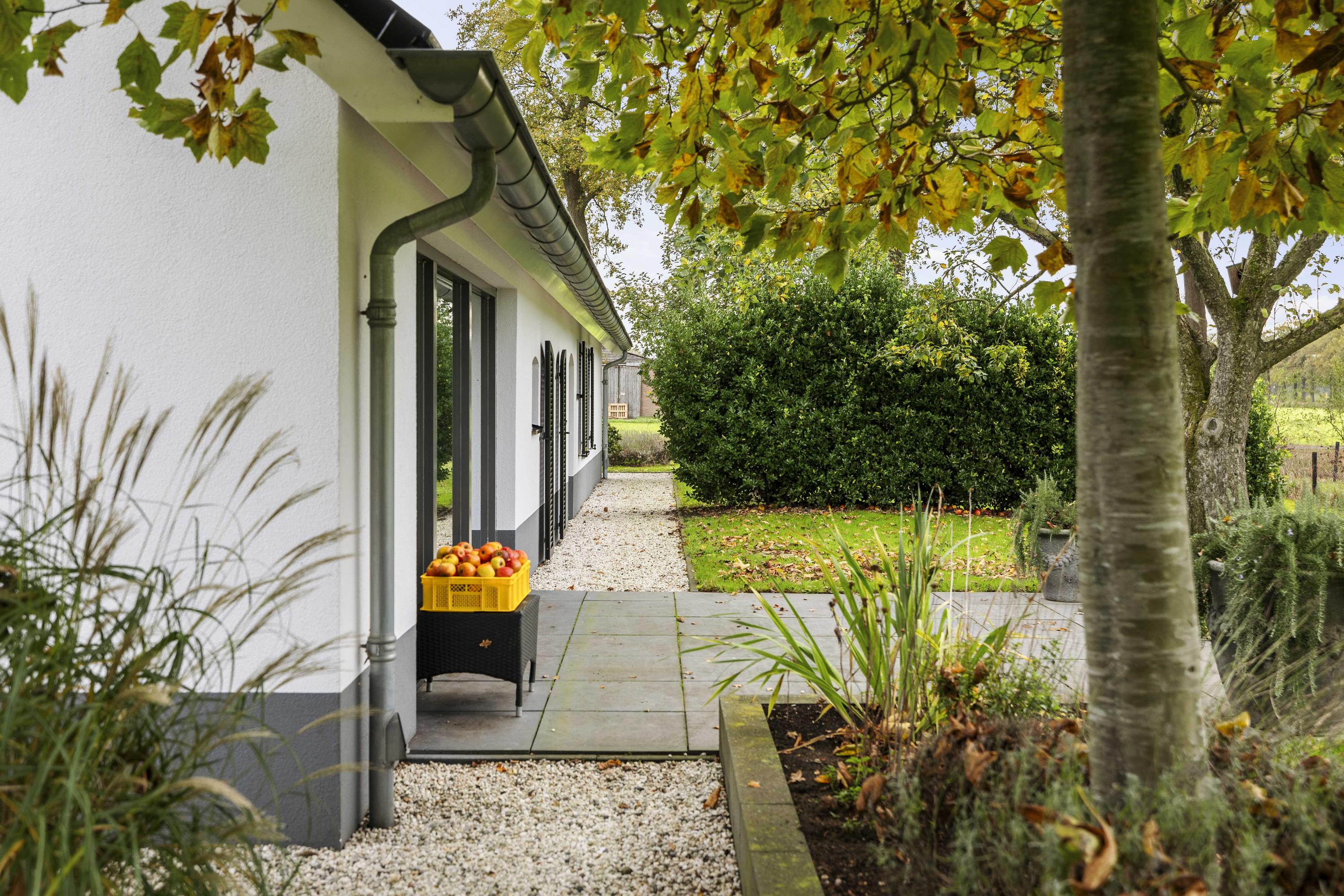 The garden is a true fairy tale; over 2 hectares in size and full of surprises. On cool evenings and mornings, the white witches, who play a starring role in Achterhoek folklore, flit between the trees and shrubs of the food forest. Roe deer, hares, squirrels, hedgehogs and all kinds of birds – from woodpeckers to owls – feel at home here. The roe deer like to come and take a drink at the water feature or enjoy the peace and quiet while grazing. The garden is based on a bio/ecological design, climate resistance and a great deal of diversity. There is a large pond of approximately 300 m² and 2 m deep, surrounded by a bee/butterfly paradise.