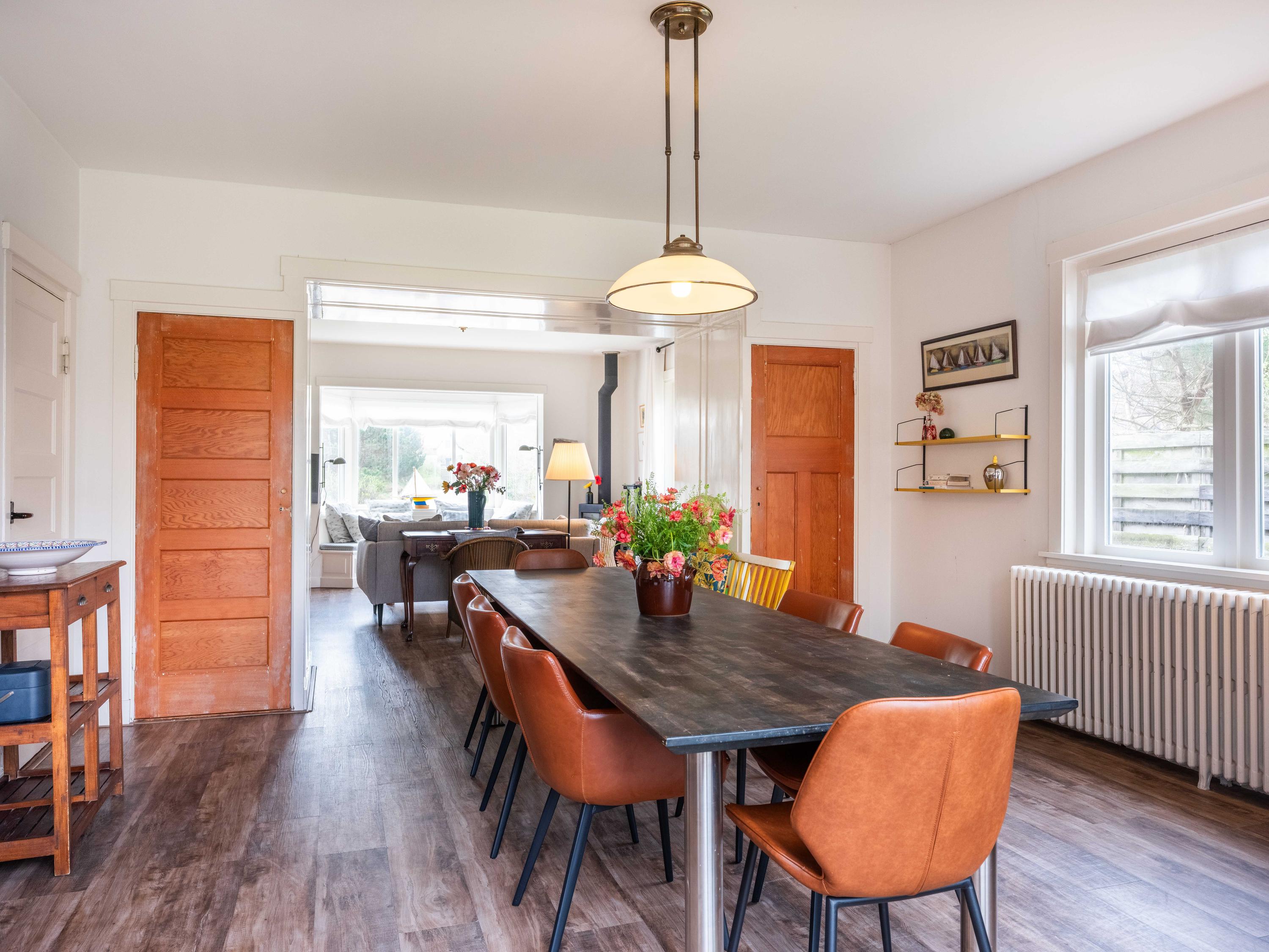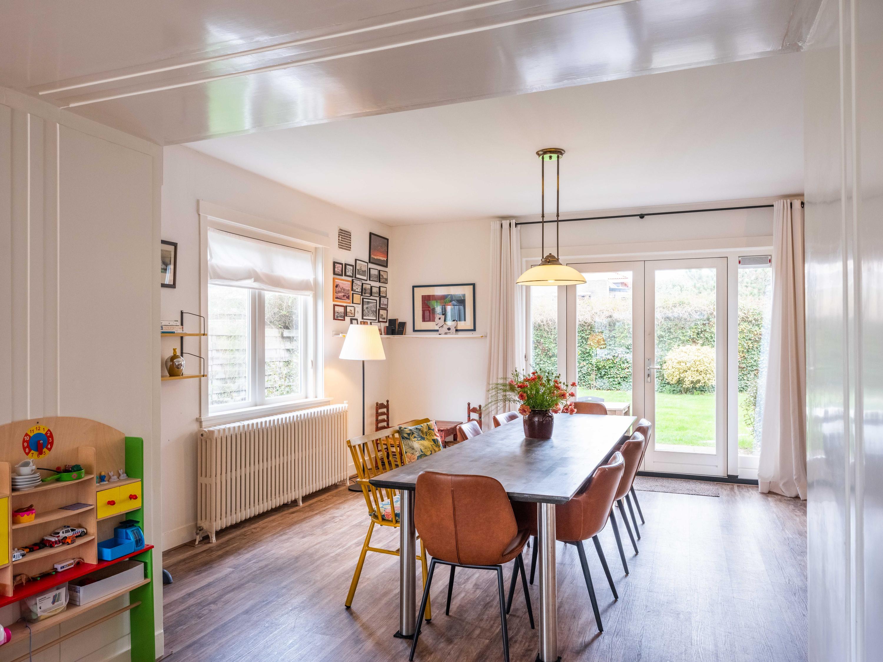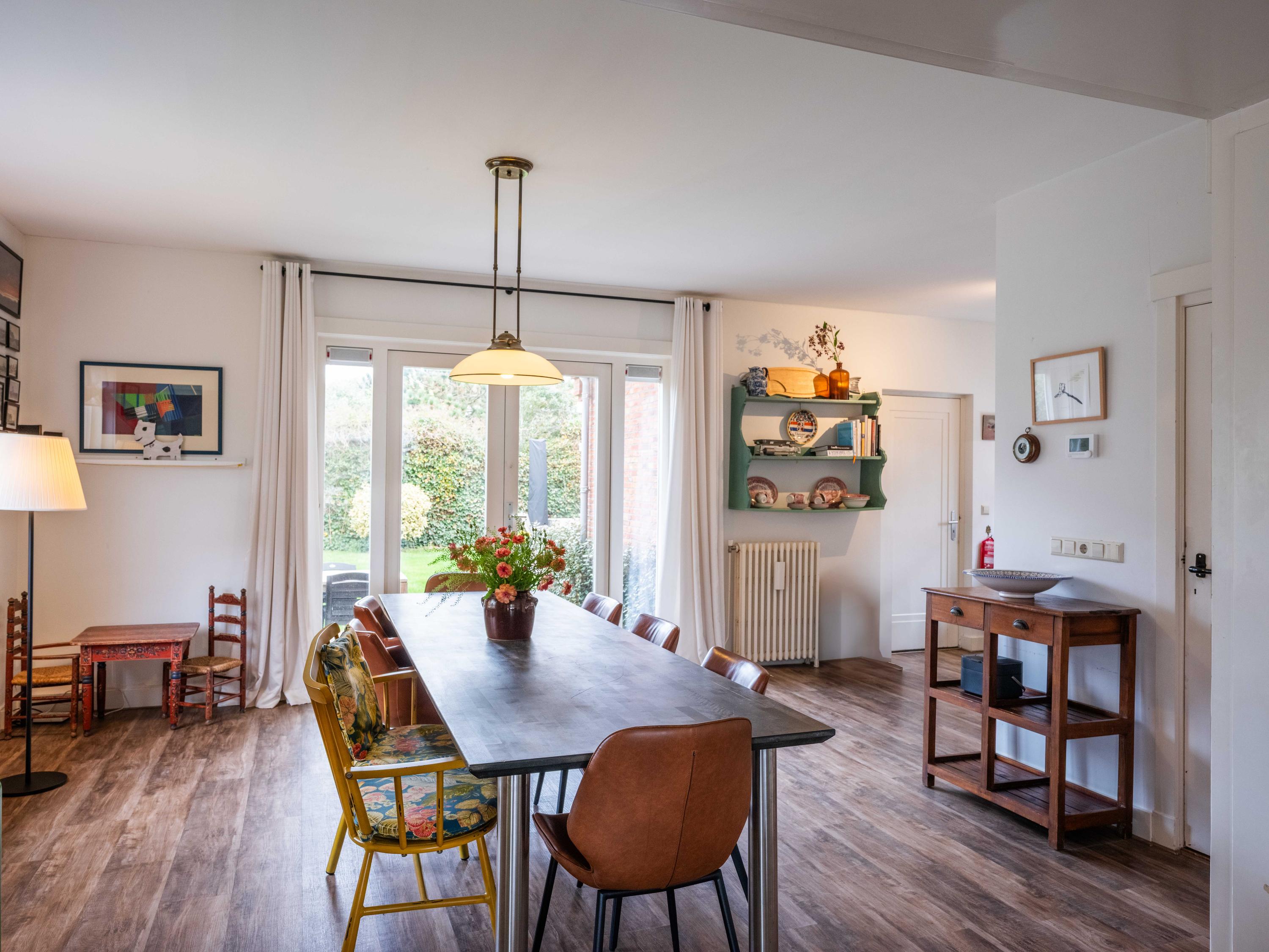 Upon entering through the draught portal, the spacious hall immediately catches the eye, with a cloakroom, meter cupboard, toilet and access to the basement. From the hall, both the living room and the dining room are accessible. The living room en-suite is bright and spacious, with a bay window, built-in cupboards and a cosy wood-burning stove. French doors give access to the garden. The adjoining dining room also has French doors.