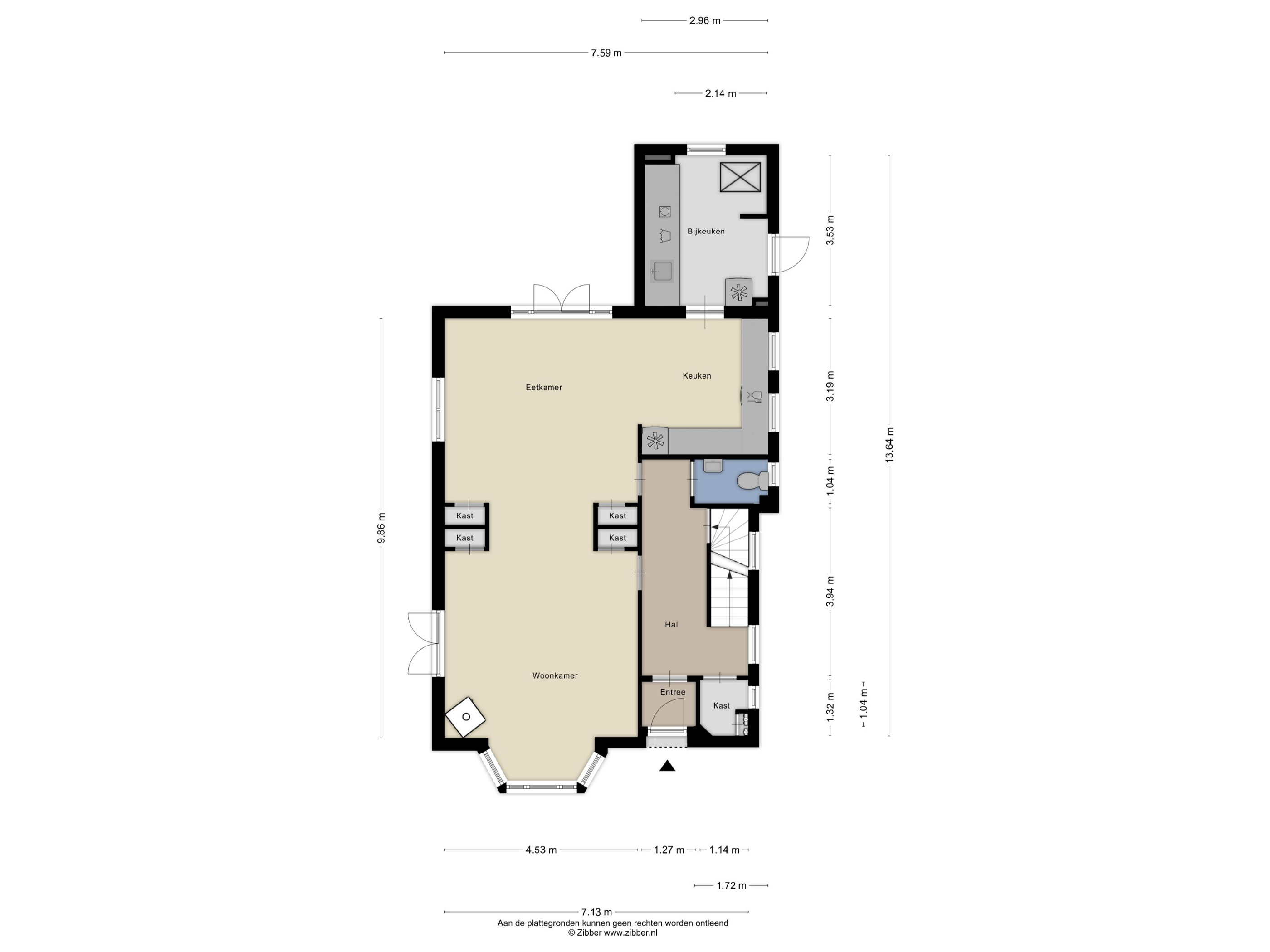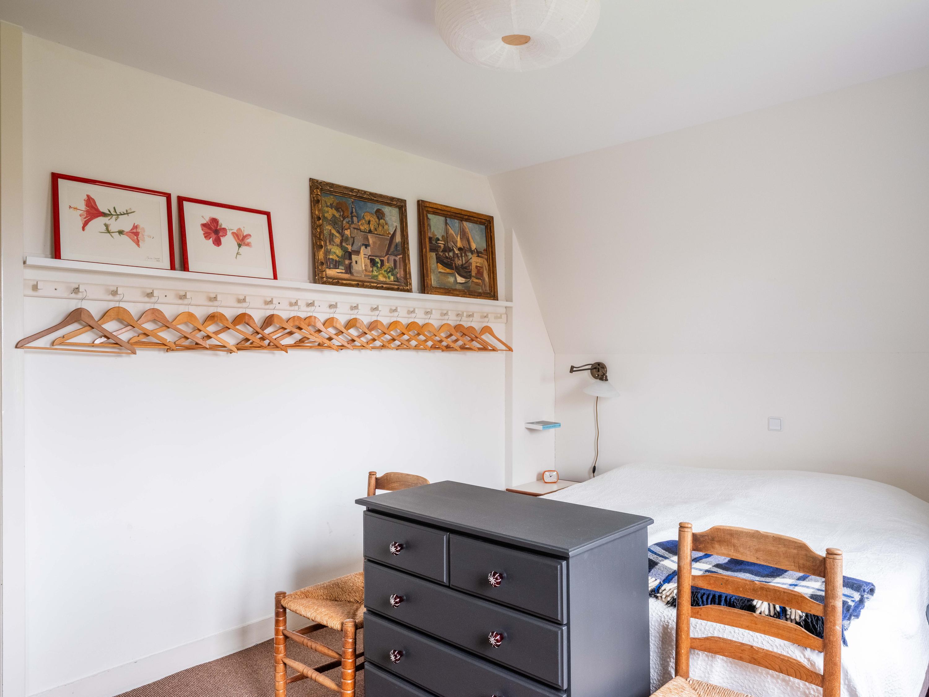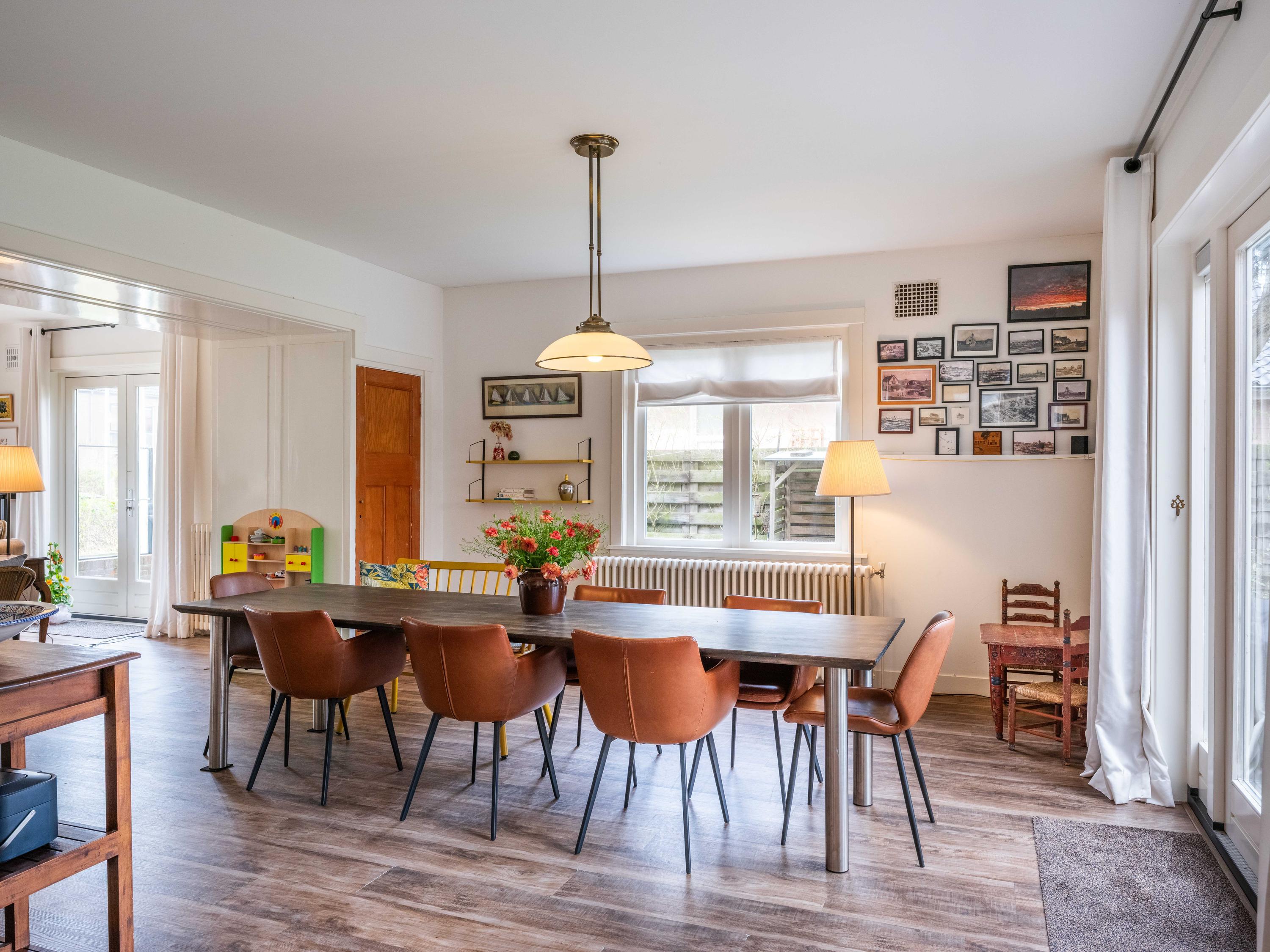 Upon entering through the draught portal, the spacious hall immediately catches the eye, with a cloakroom, meter cupboard, toilet and access to the basement. From the hall, both the living room and the dining room are accessible. The living room en-suite is bright and spacious, with a bay window, built-in cupboards and a cosy wood-burning stove. French doors give access to the garden. The adjoining dining room also has French doors.