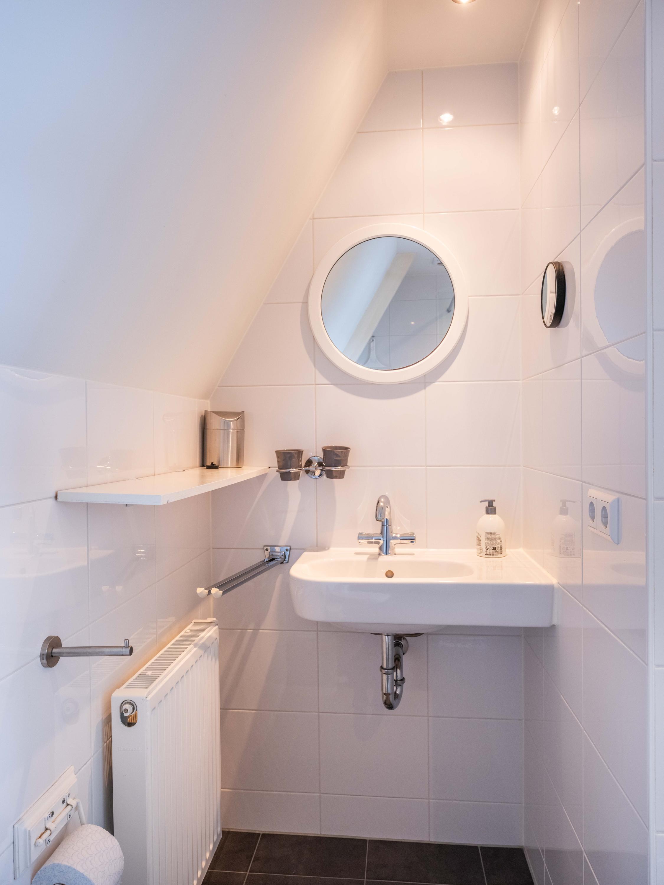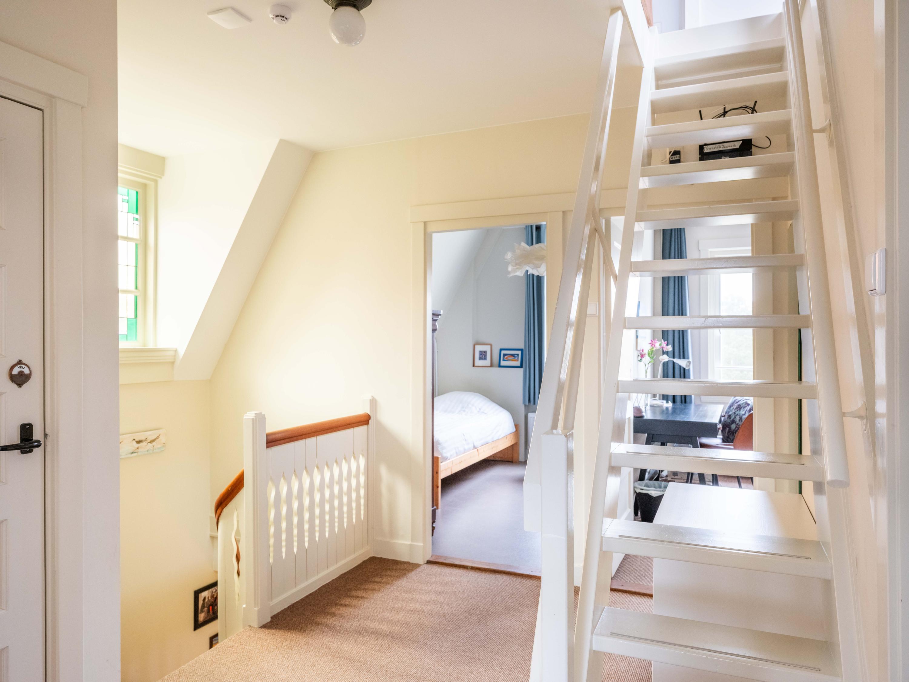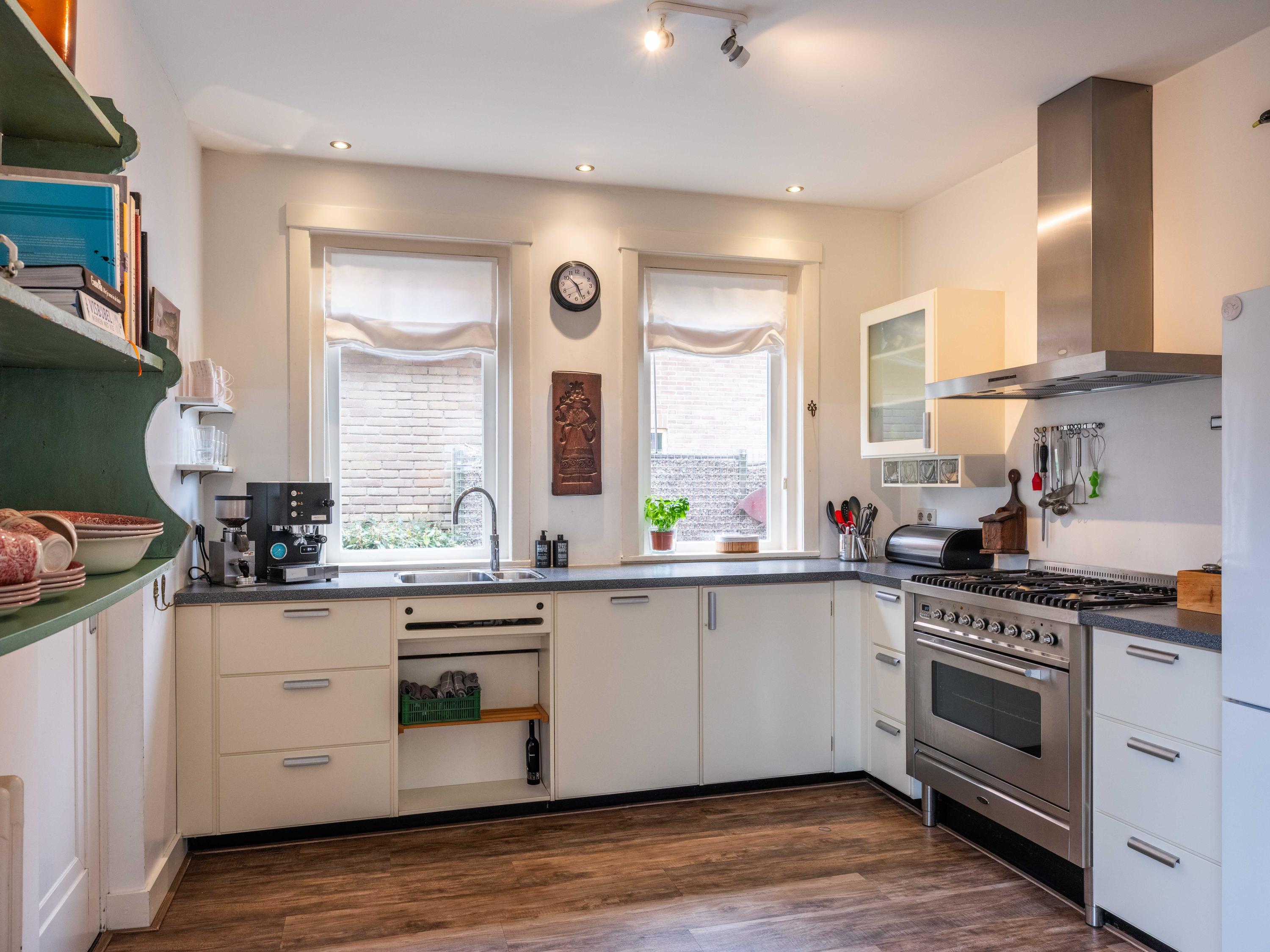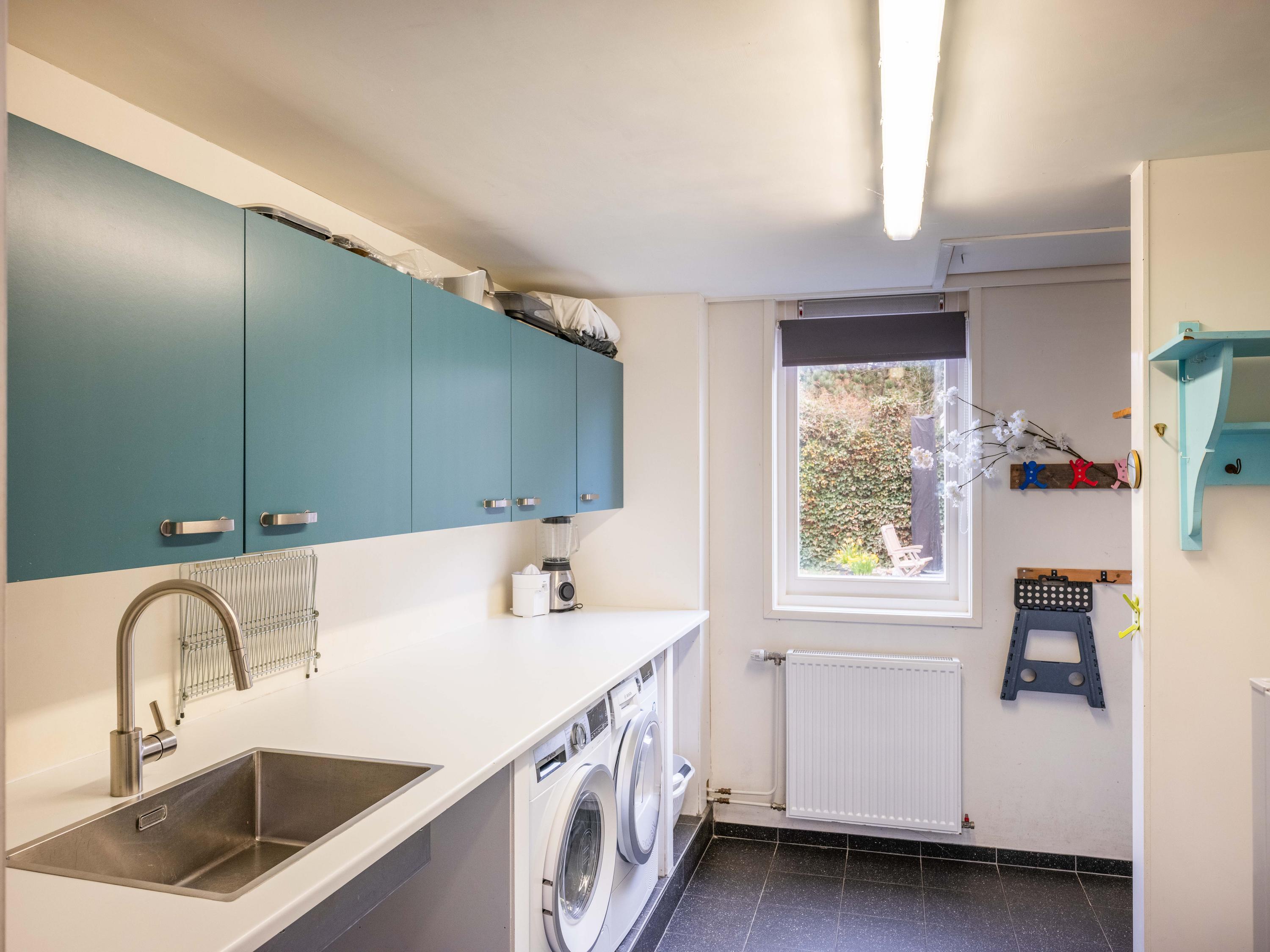 The open kitchen is equipped with built-in appliances, including a 6-burner Boretti gas hob, a Quooker and a dishwasher. Accessible from the kitchen is the utility room, with a sink, a window overlooking the garden and connections for a washing machine and dryer. Above the scullery is a practical attic space with the central heating boiler.