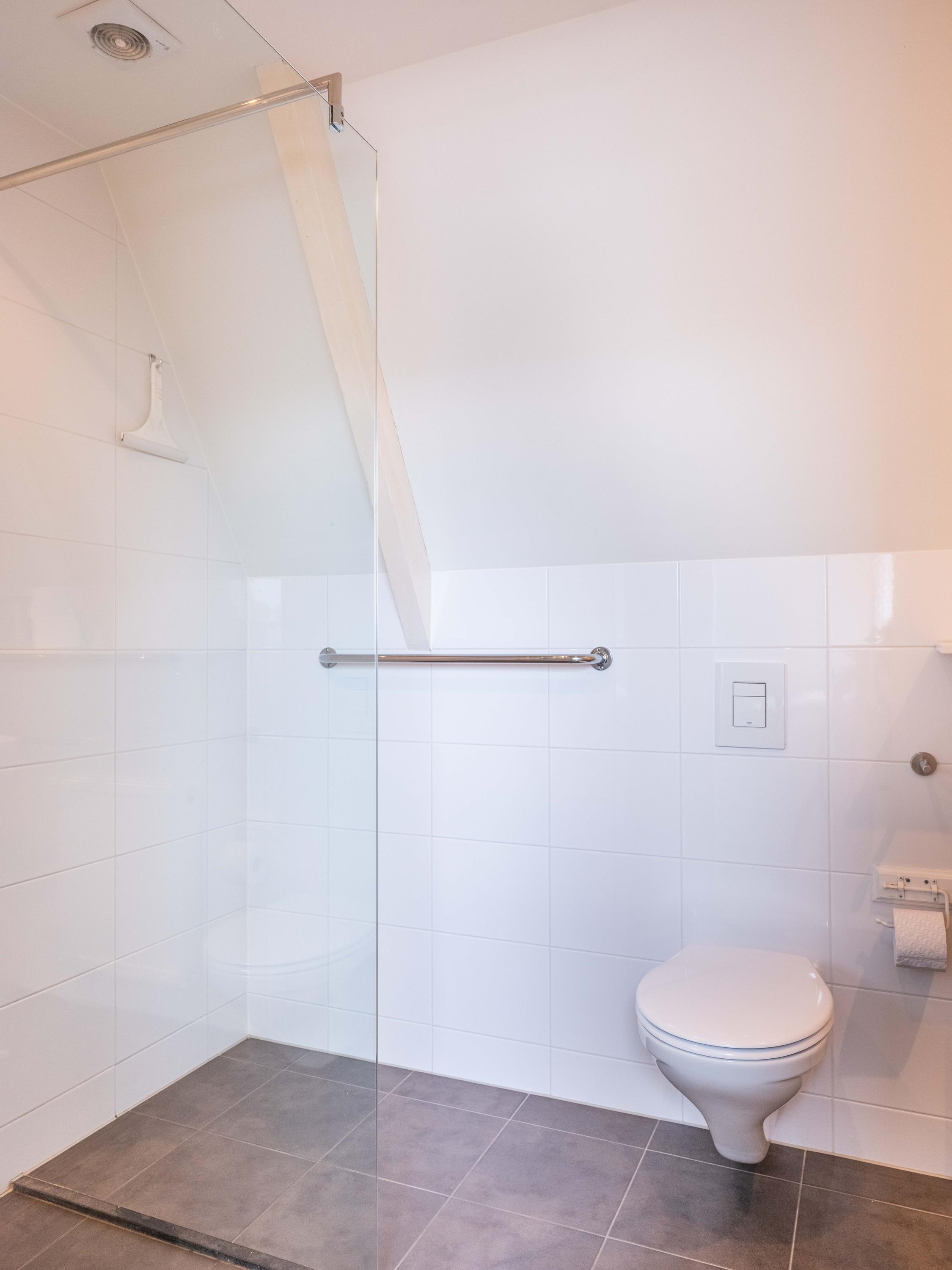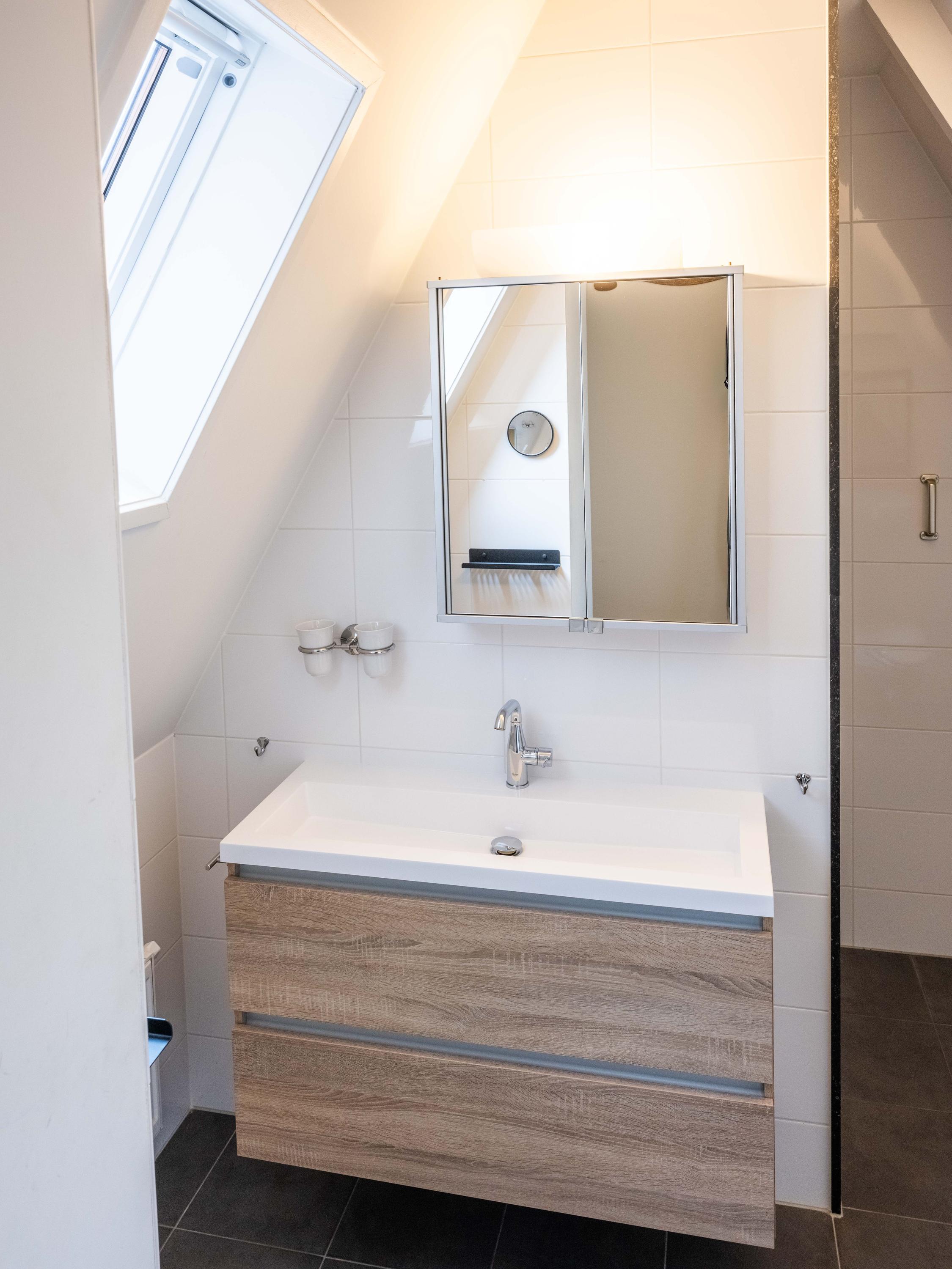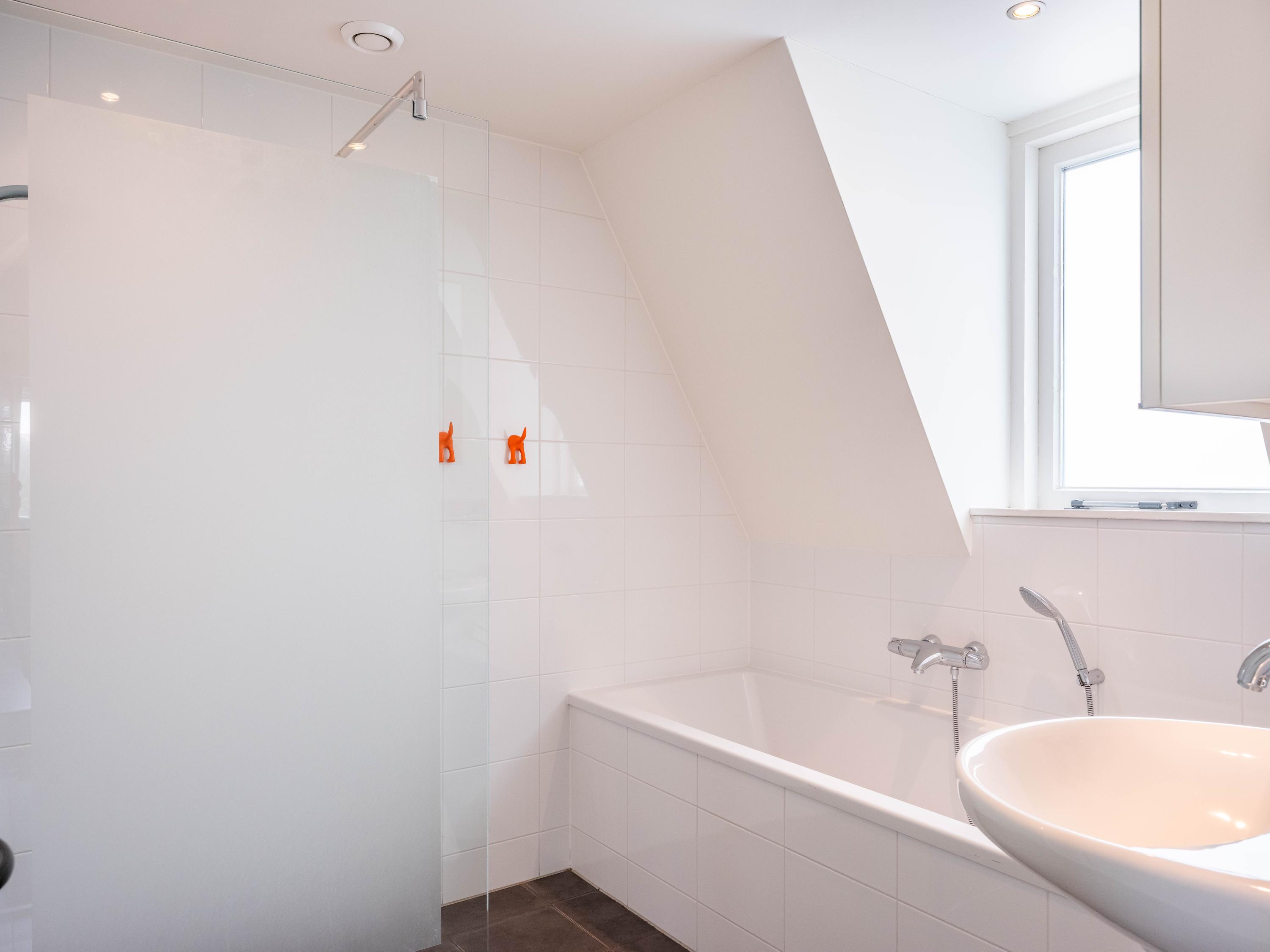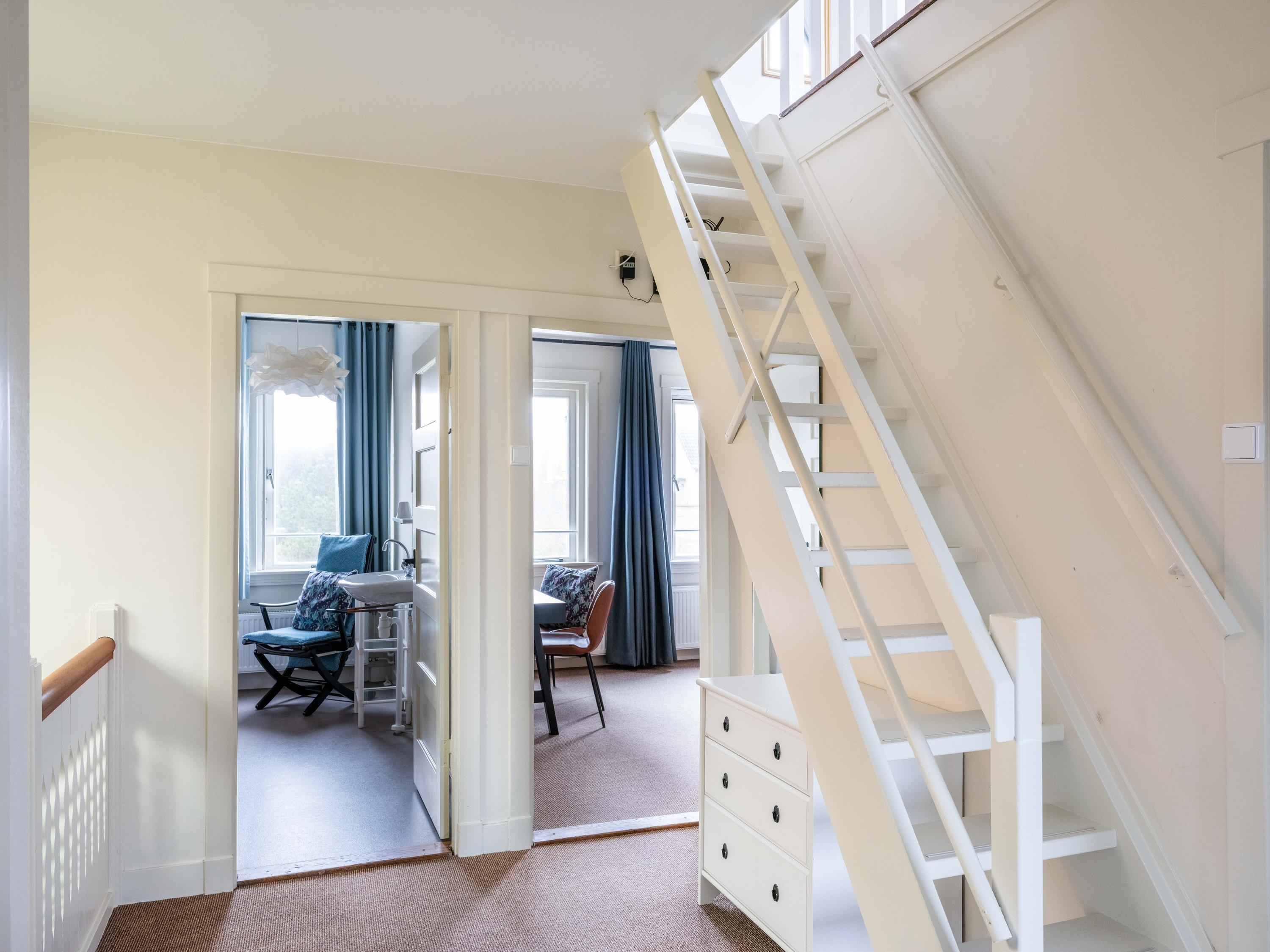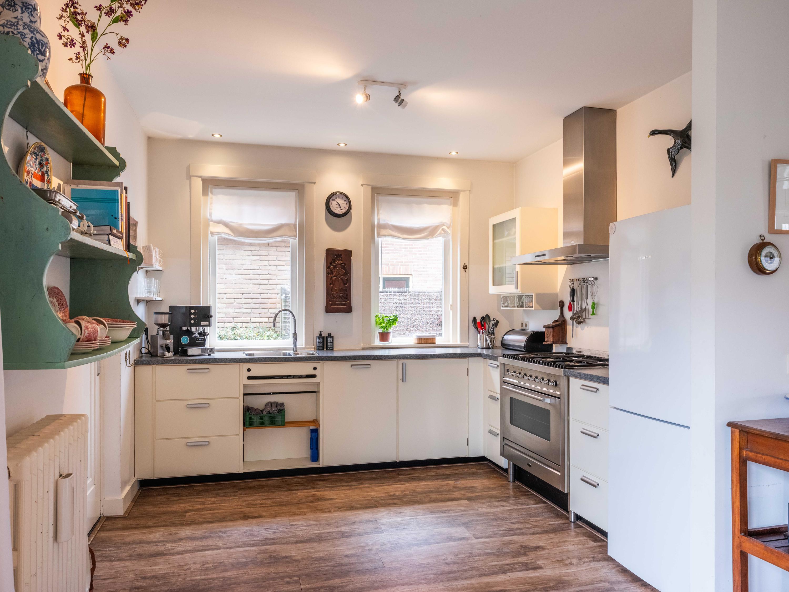The open kitchen is equipped with built-in appliances, including a 6-burner Boretti gas hob, a Quooker and a dishwasher. Accessible from the kitchen is the utility room, with a sink, a window overlooking the garden and connections for a washing machine and dryer. Above the scullery is a practical attic space with the central heating boiler.