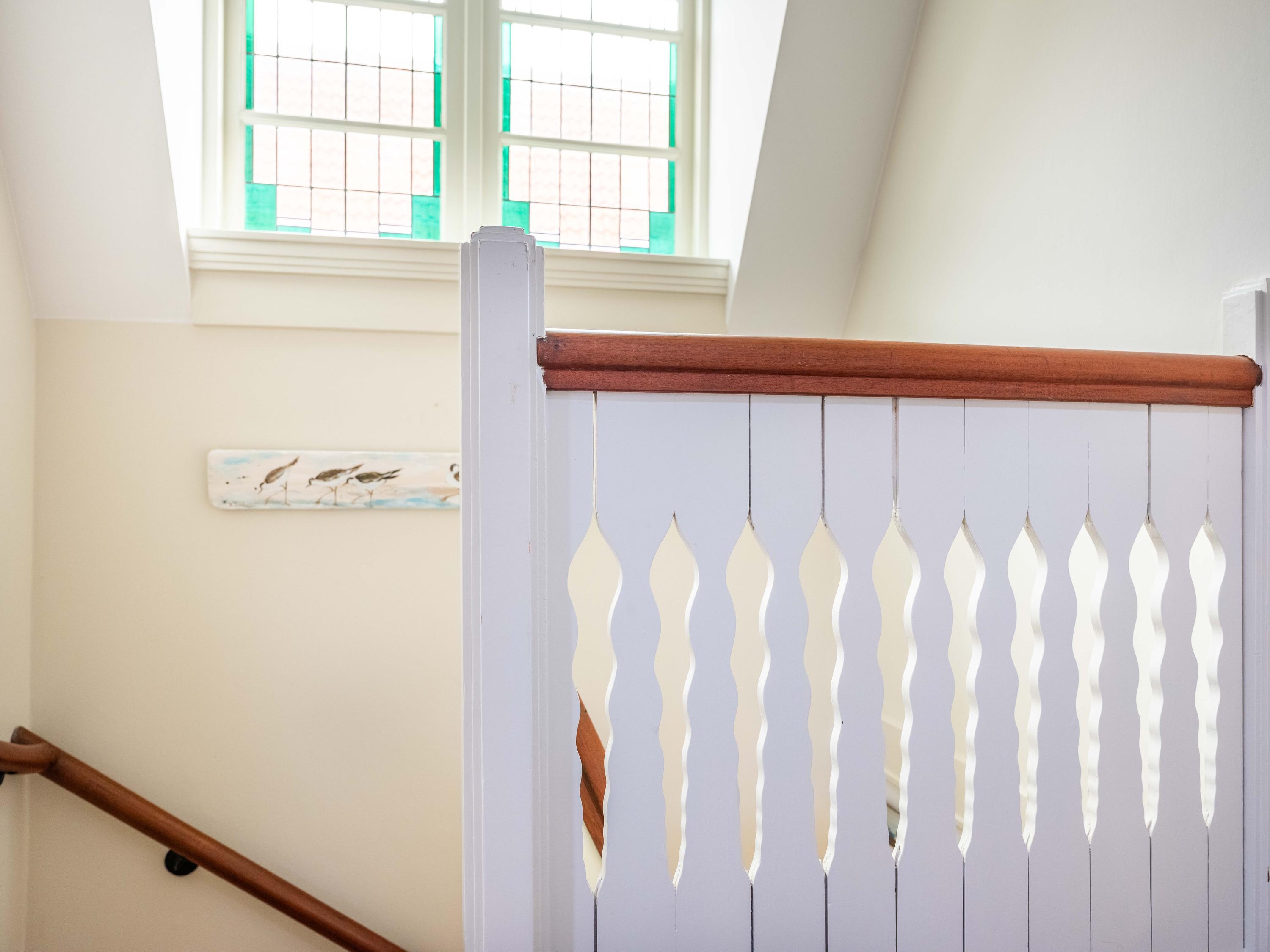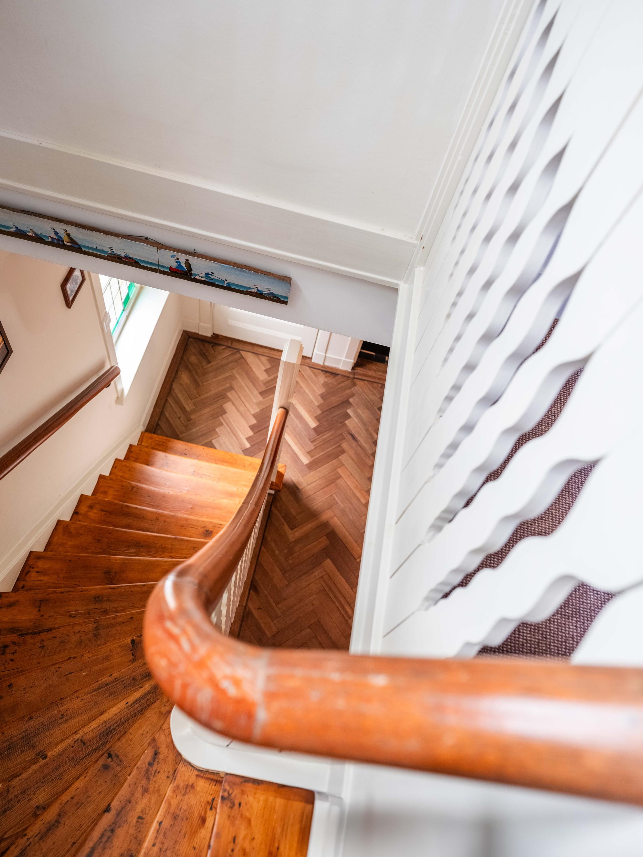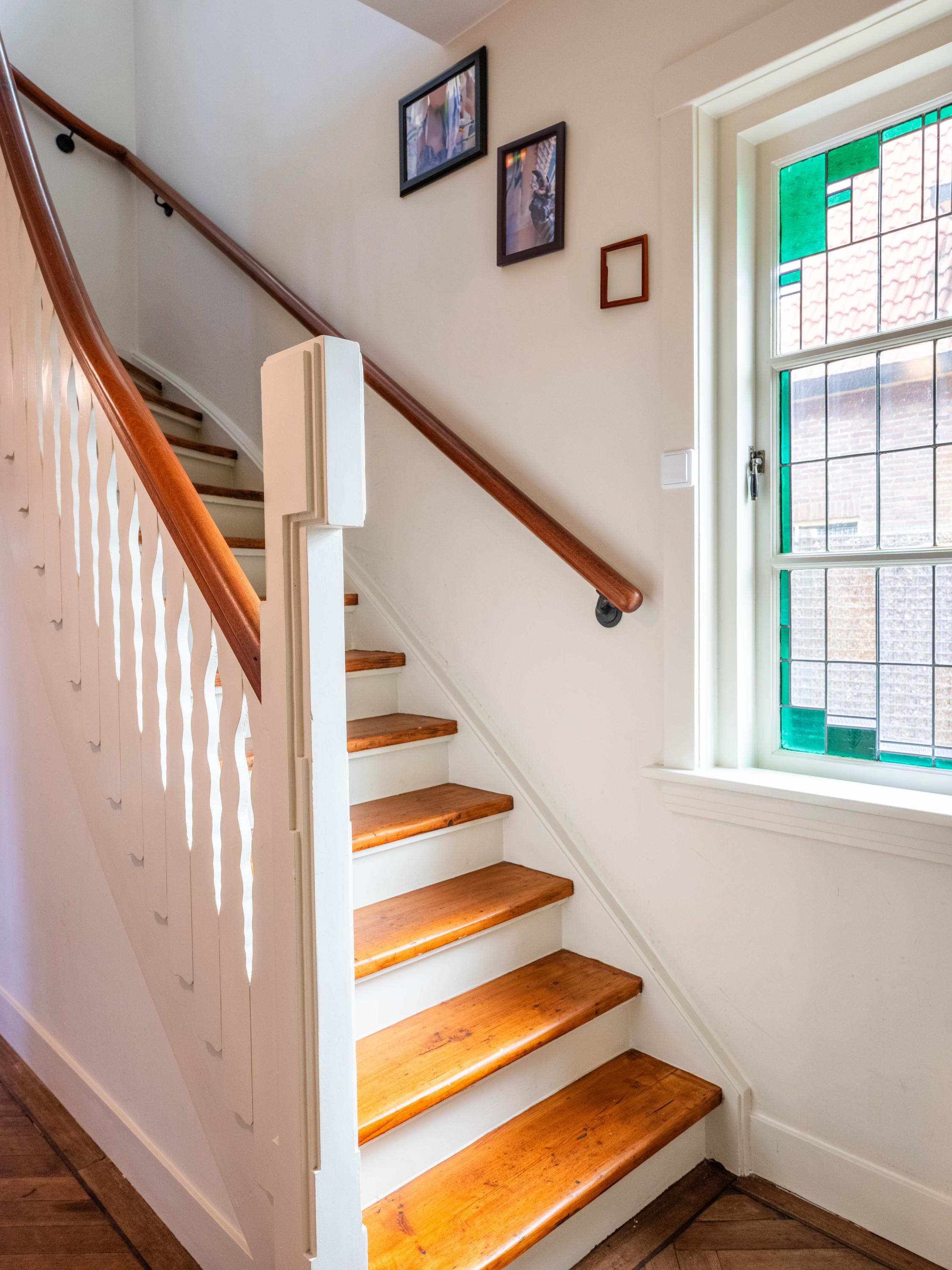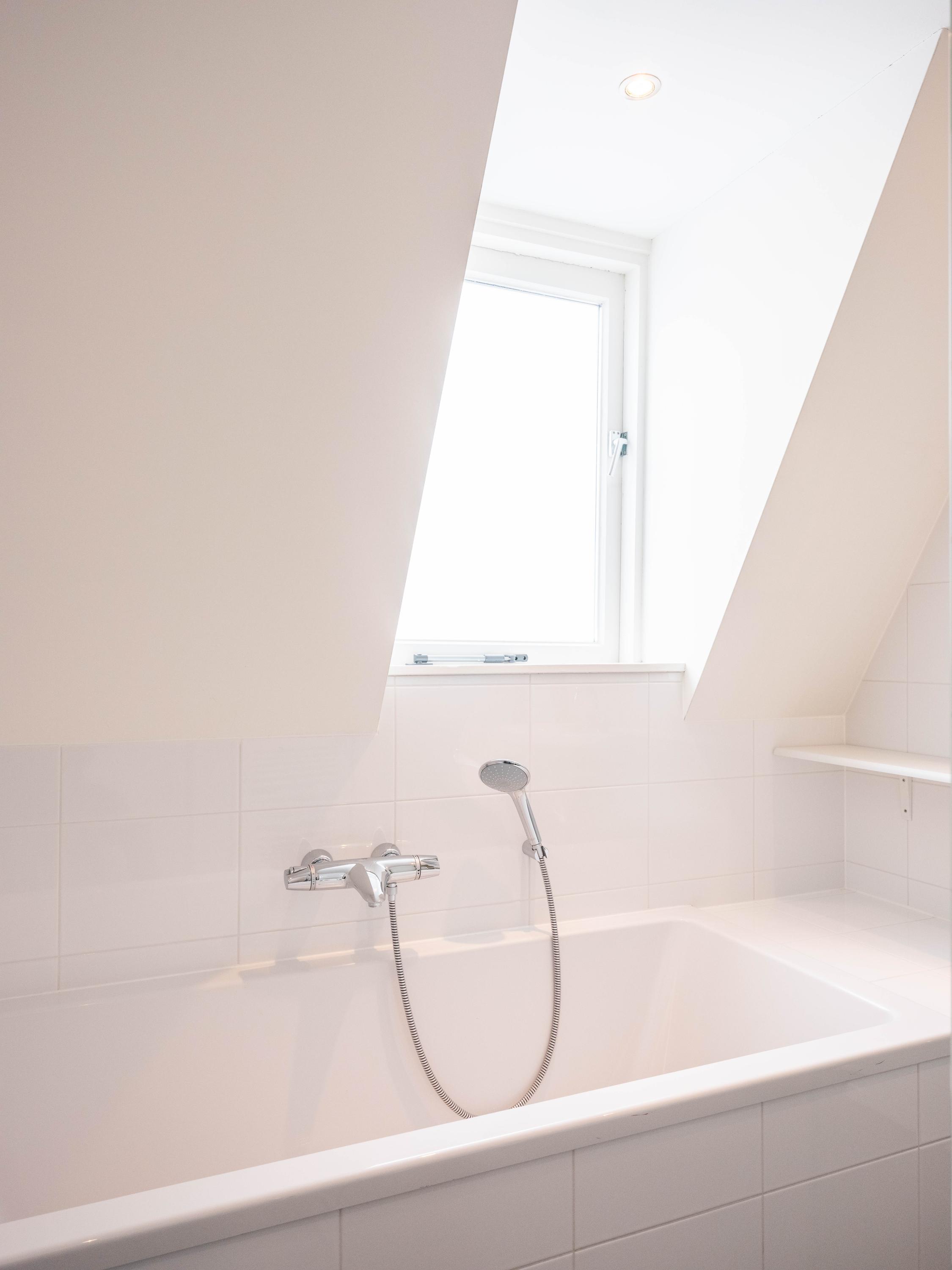 The open kitchen is equipped with built-in appliances, including a 6-burner Boretti gas hob, a Quooker and a dishwasher. Accessible from the kitchen is the utility room, with a sink, a window overlooking the garden and connections for a washing machine and dryer. Above the scullery is a practical attic space with the central heating boiler.