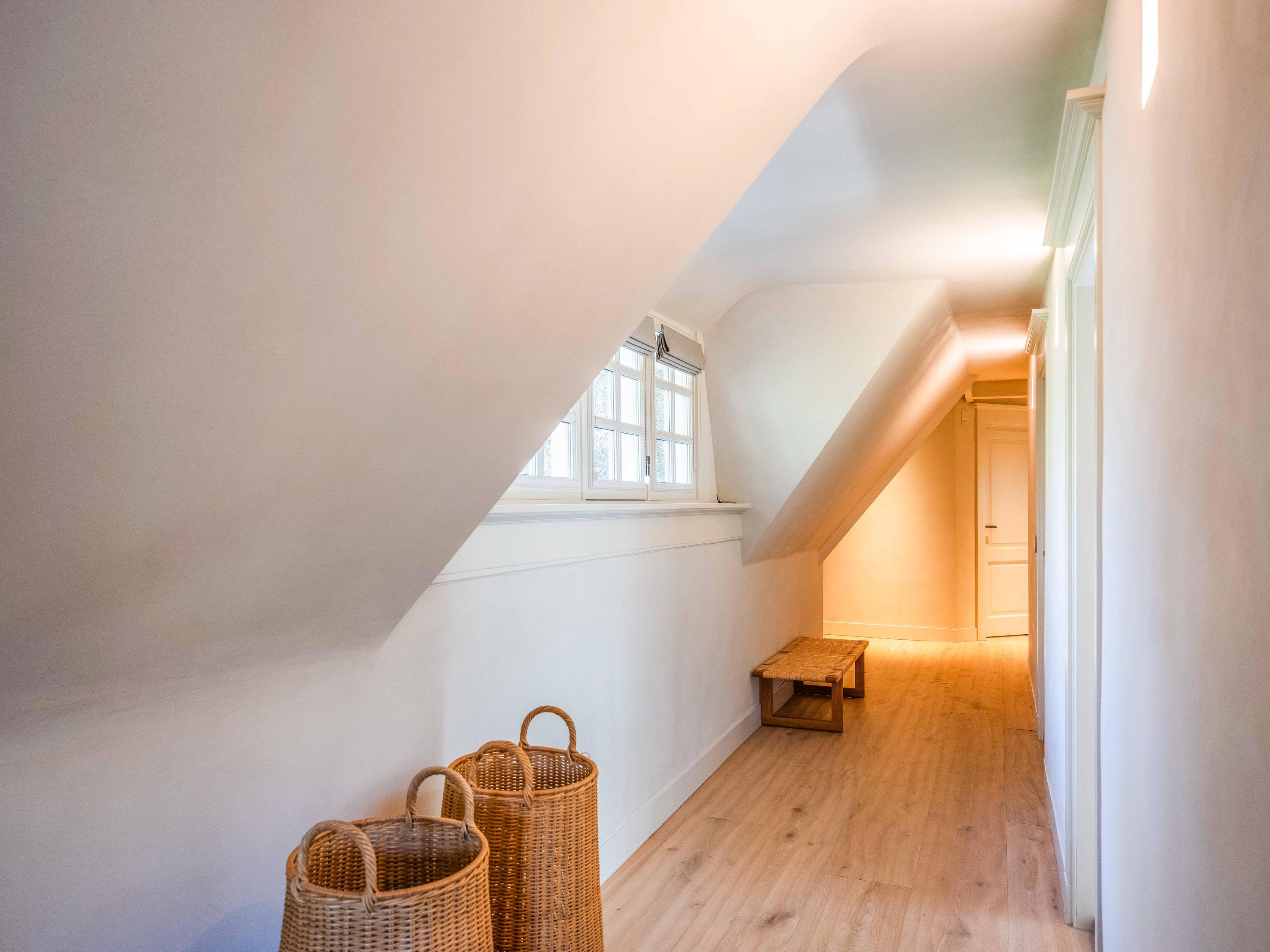 The attic, accessible via a fixed staircase, offers plenty of storage space.