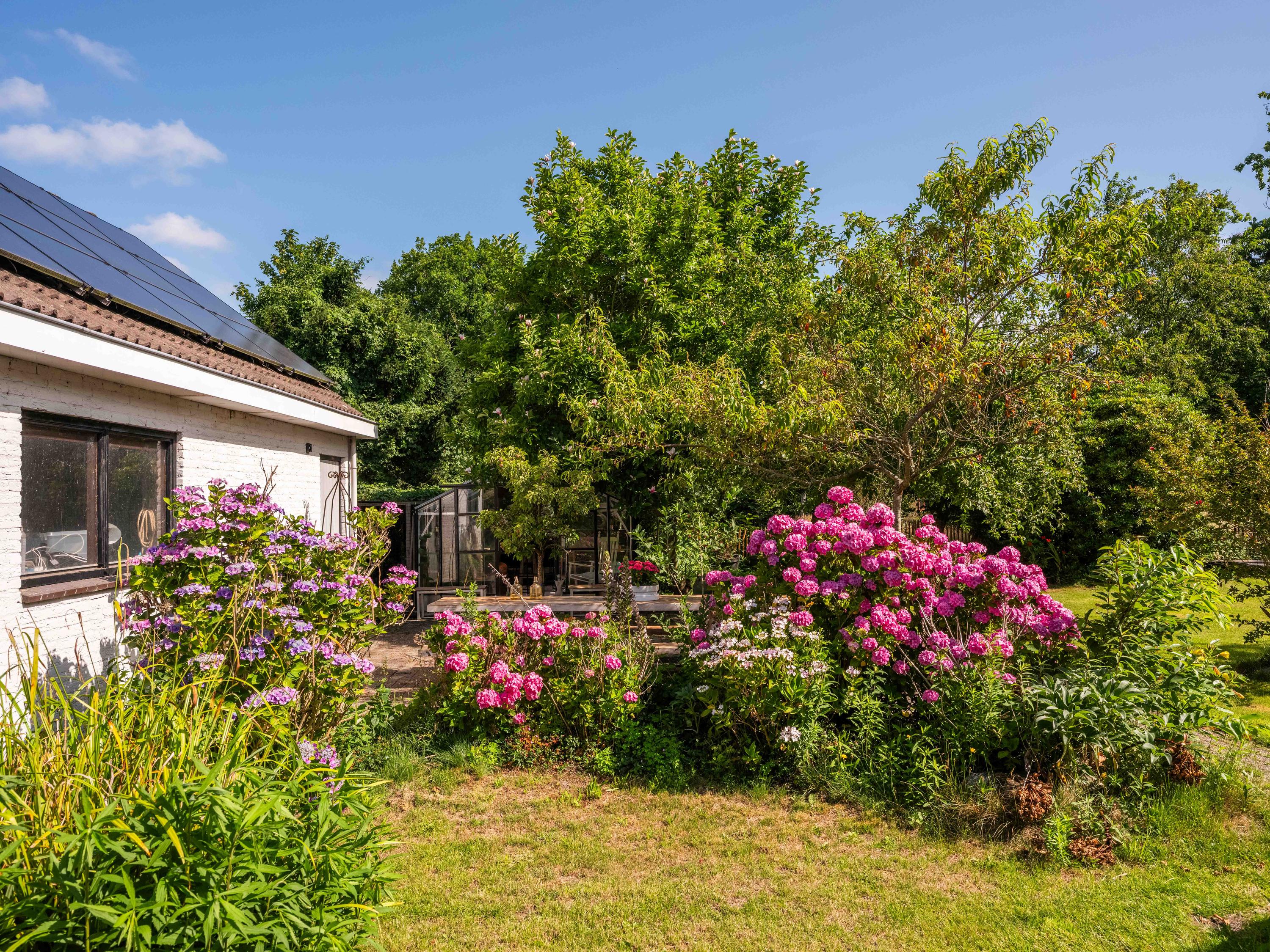 The surrounding garden offers complete privacy, with both sun and shade. A greenhouse, currently used as a cozy lounge with an outdoor fireplace, is perfect for long summer evenings with friends and family. There is also a large detached stone garage (approx. 50 m²) with storage loft, suitable for two cars.