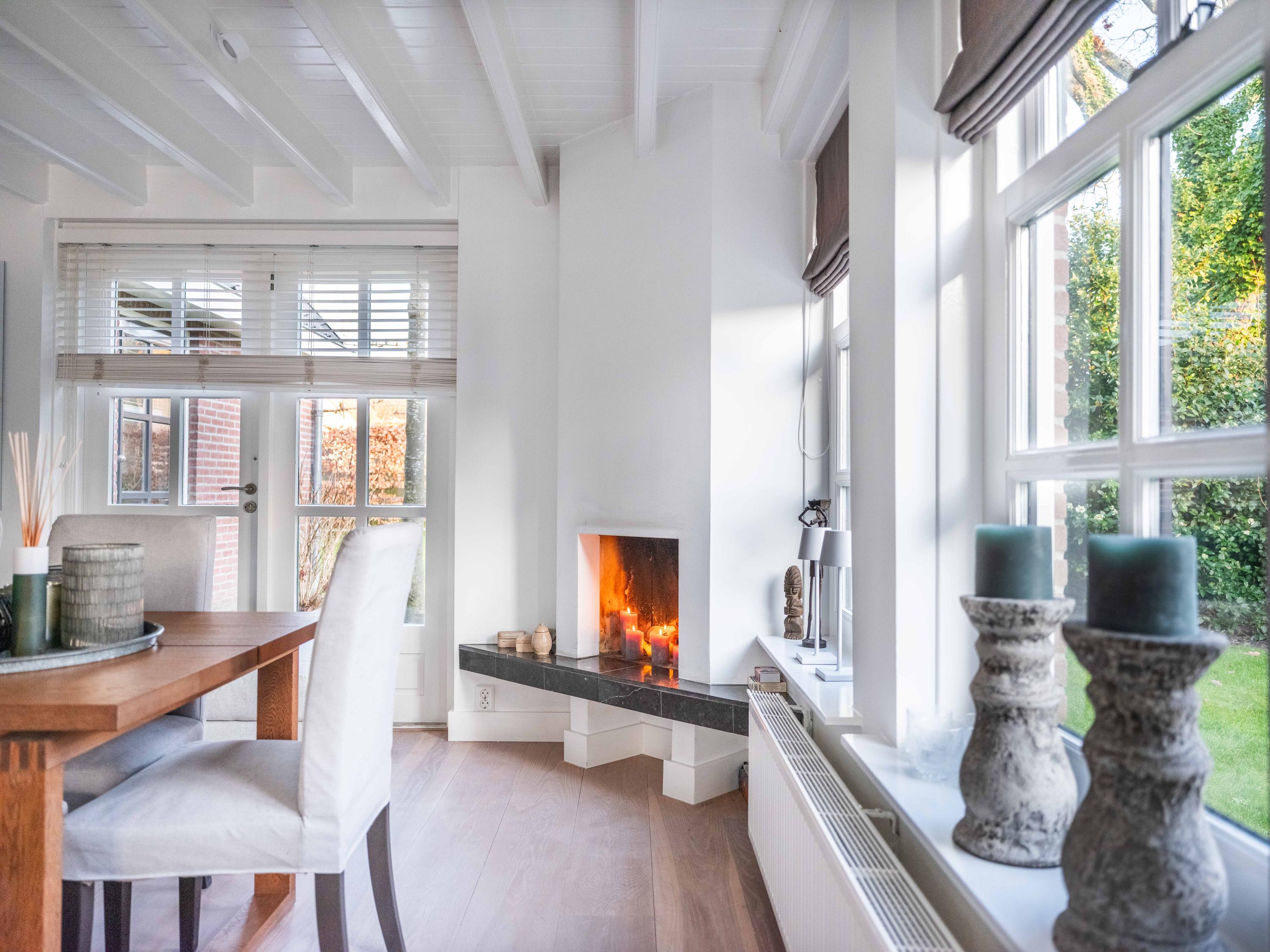 Upon entering, you immediately notice the pleasant atmosphere. The spacious hall with staircase and modern toilet provides access to the practical utility room and leads further to the dining room with fireplace. From here, double garden doors open onto the beautifully landscaped garden, allowing the indoors and outdoors to flow effortlessly into one another. The living room connects seamlessly to the designer kitchen by Piet Jan van den Kommer—a real eye-catcher that perfectly matches the country style of the house. The wooden floors and beamed ceilings enhance the feeling of warmth and character.