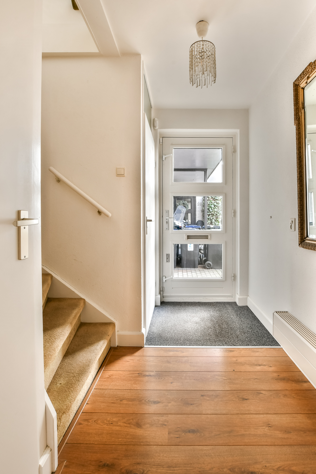 Entree/hal met meterkast, toilet, trapkast, trap naar de eerste verdieping en toegang tot de woonkamer.