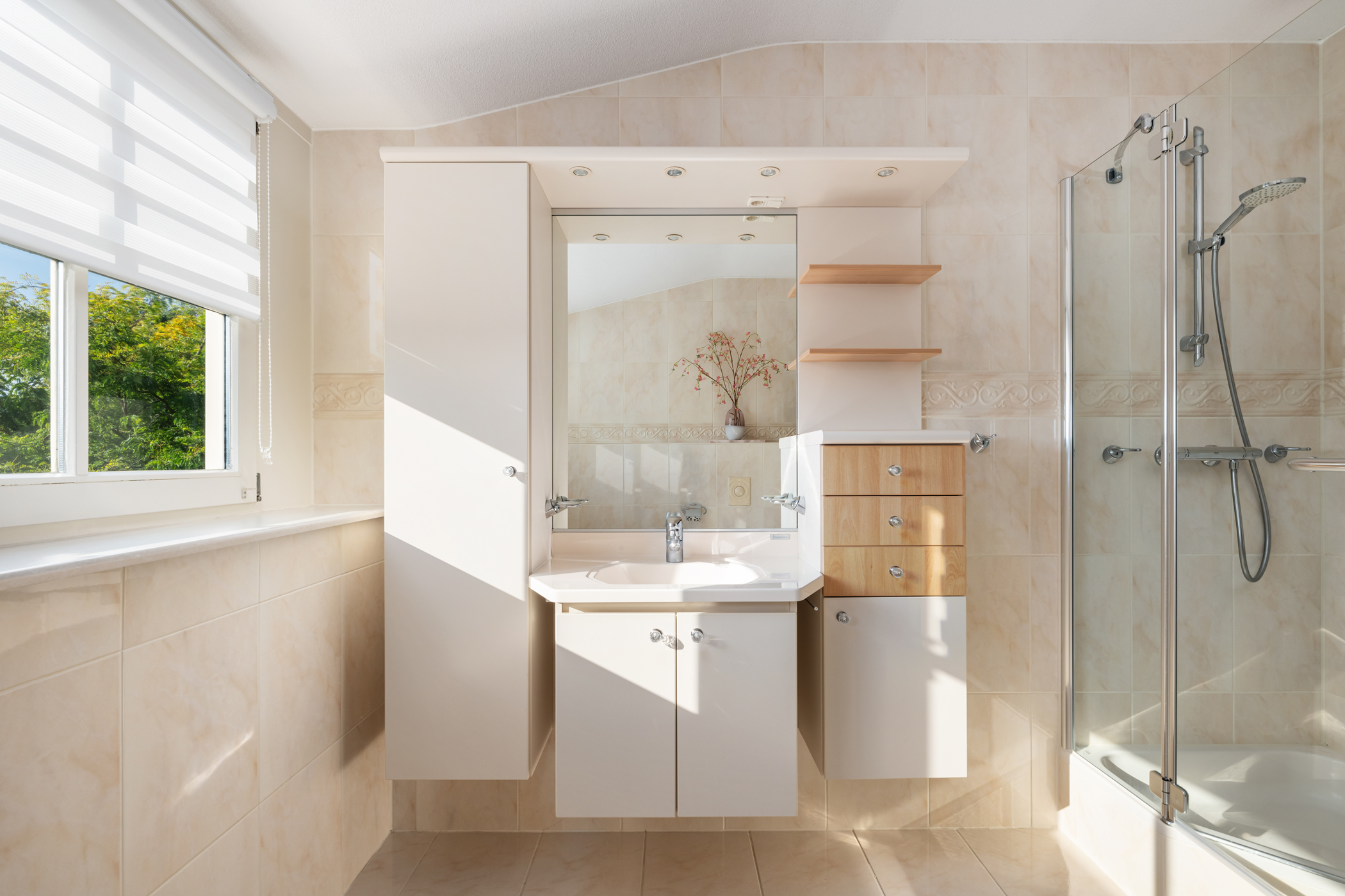 At the end of the landing is the second bathroom, fitted with a toilet, washbasin, and shower cabin.