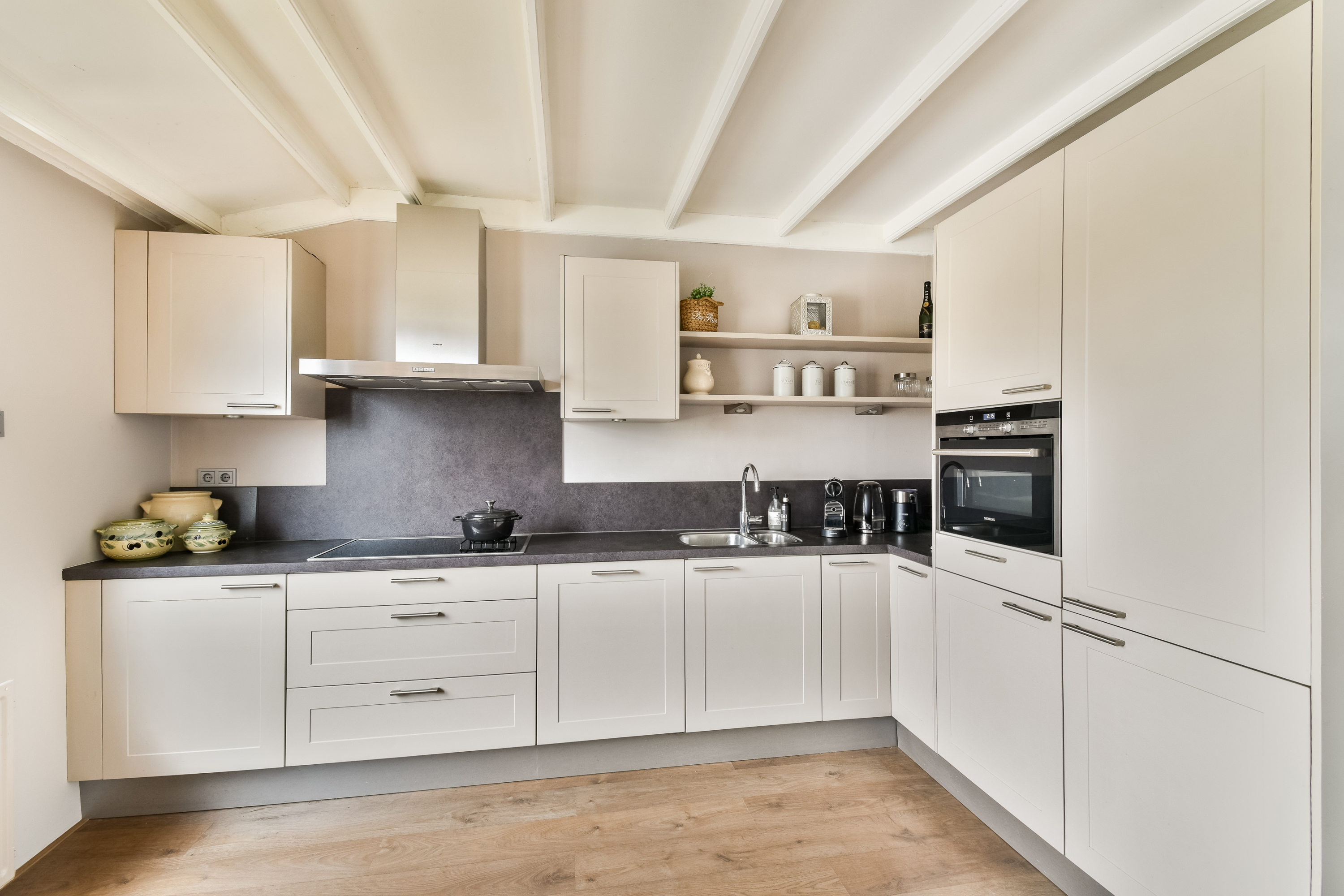 The modern kitchen is located at the front, designed in an L-shape layout and equipped with various built-in appliances, including a dishwasher, combi oven, fridge-freezer combination, induction hob, and extractor hood.