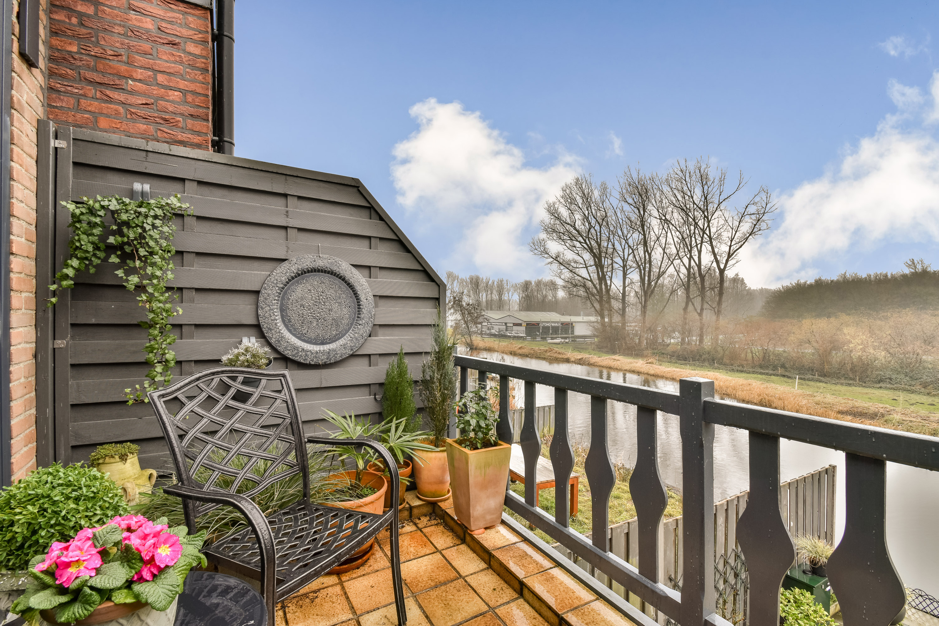 Through a sliding door, you access the balcony, which is fitted with an electric awning and offers lovely views over the nature area behind the house.