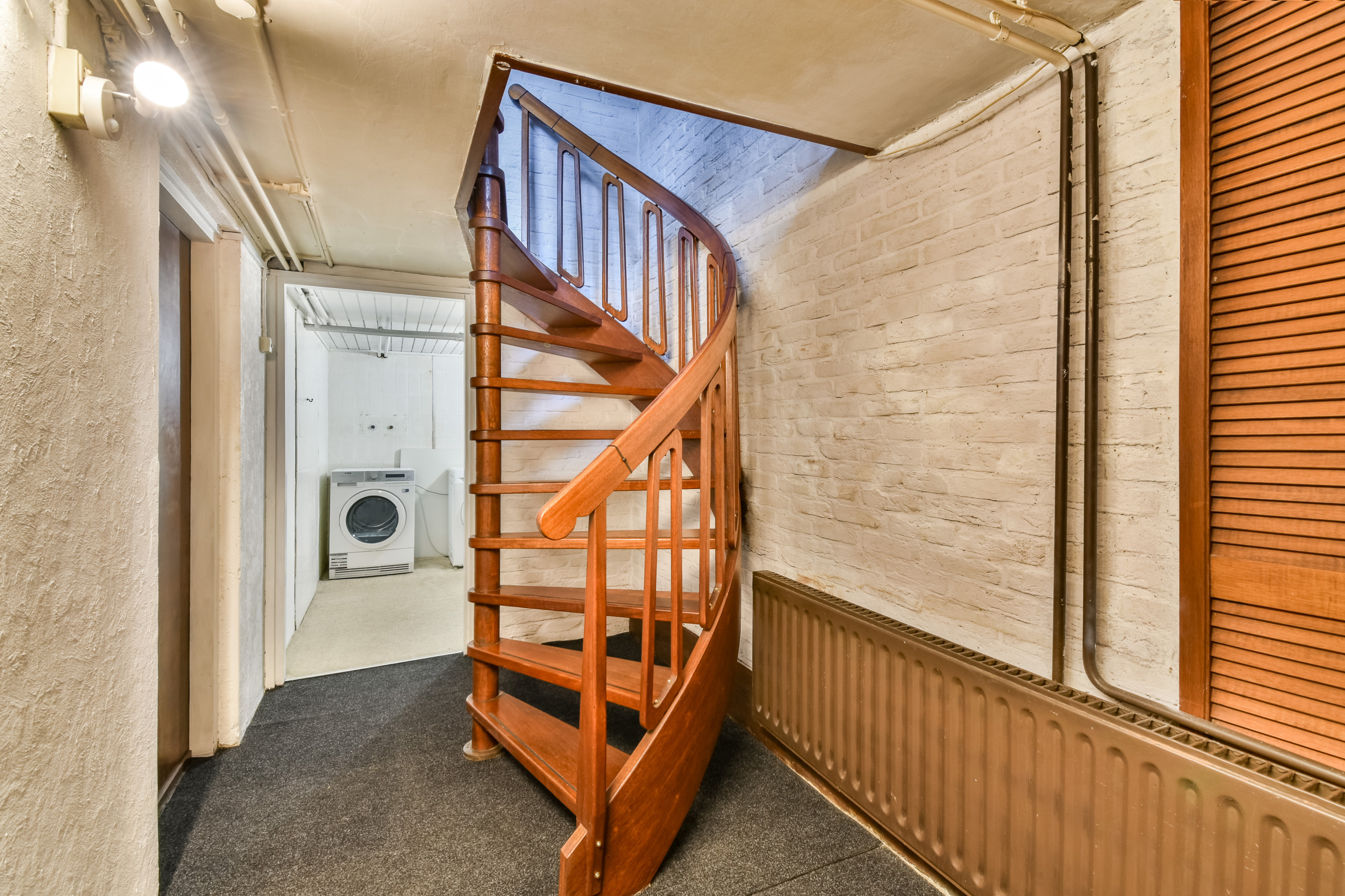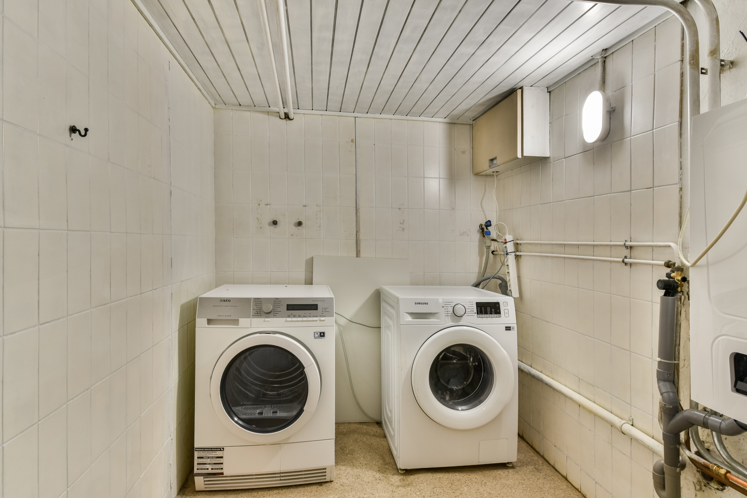 Spacious laundry room with central heating boiler installation and connections for washing machine and dryer.