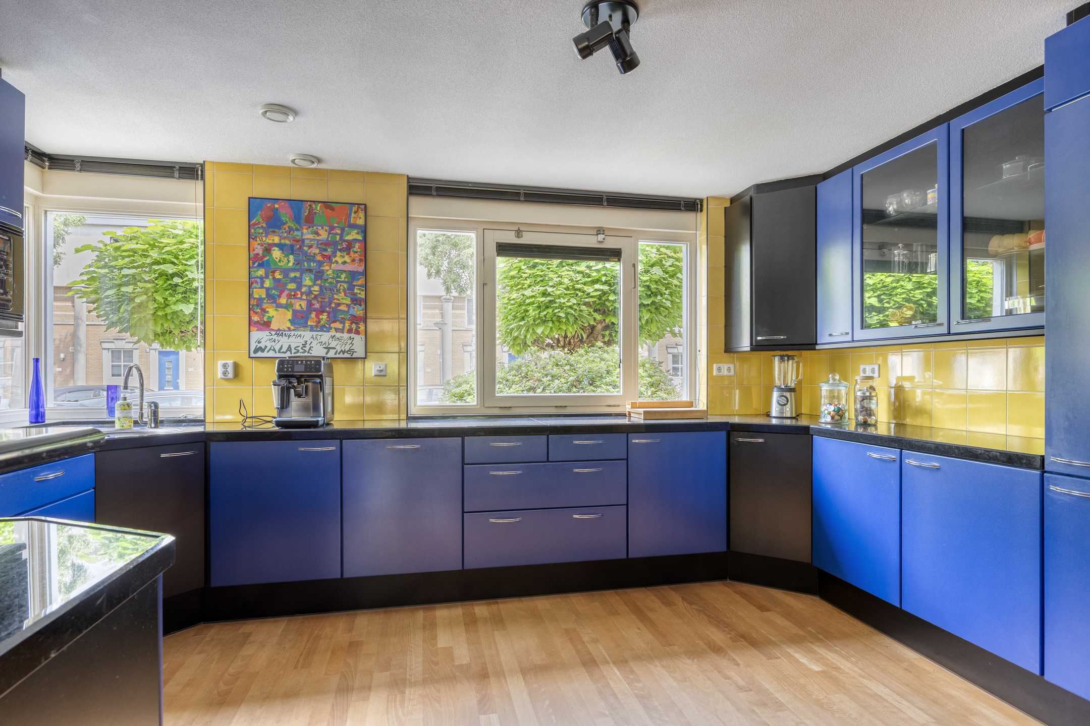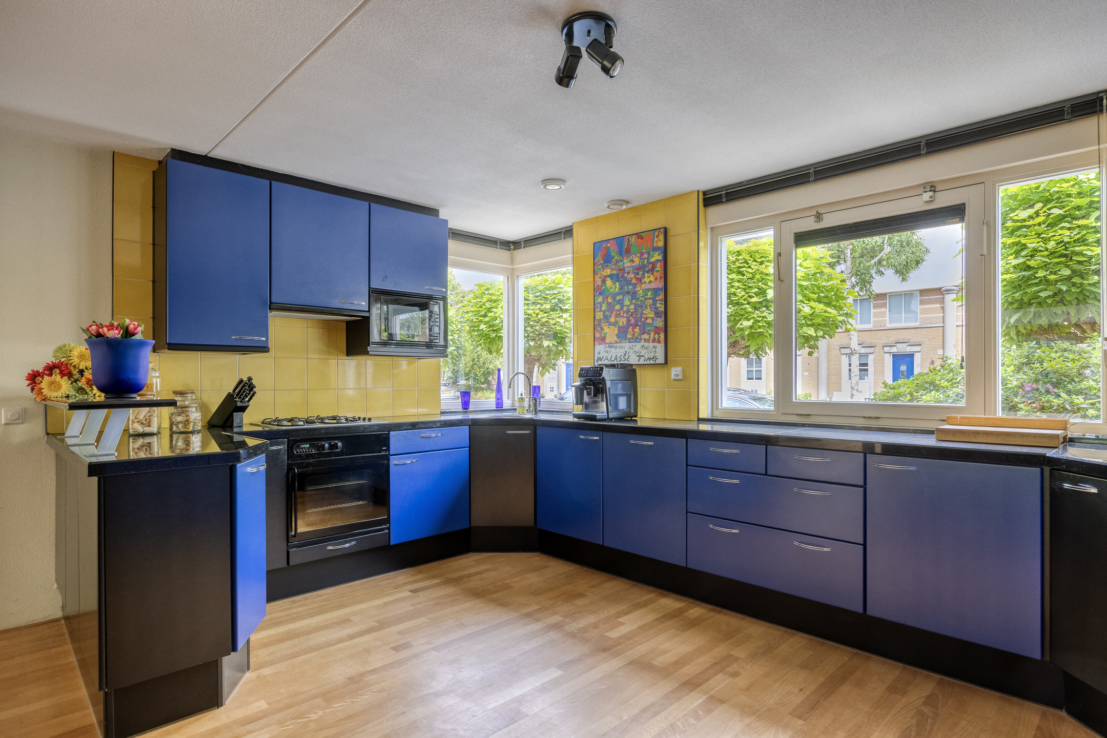 Light defines the experience here: broad windows, two skylights, and a strikingly bright living room. Four bedrooms provide flexibility for family, work, or retreat. The kitchen is appointed with a granite countertop and integrated appliances, complementing a solid wood floor throughout the ground level. On upper levels, stylish laminate echoes the home's practical elegance.