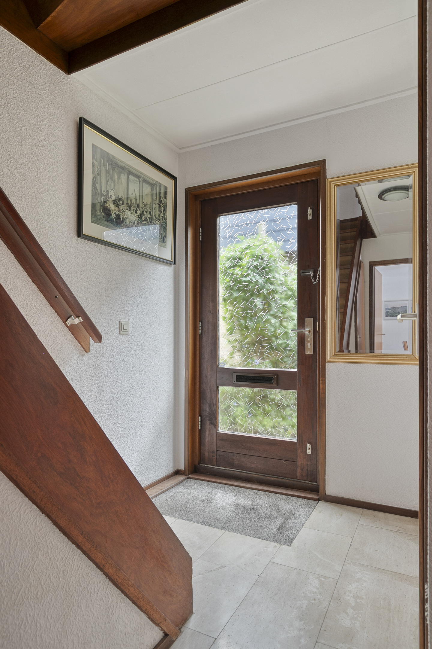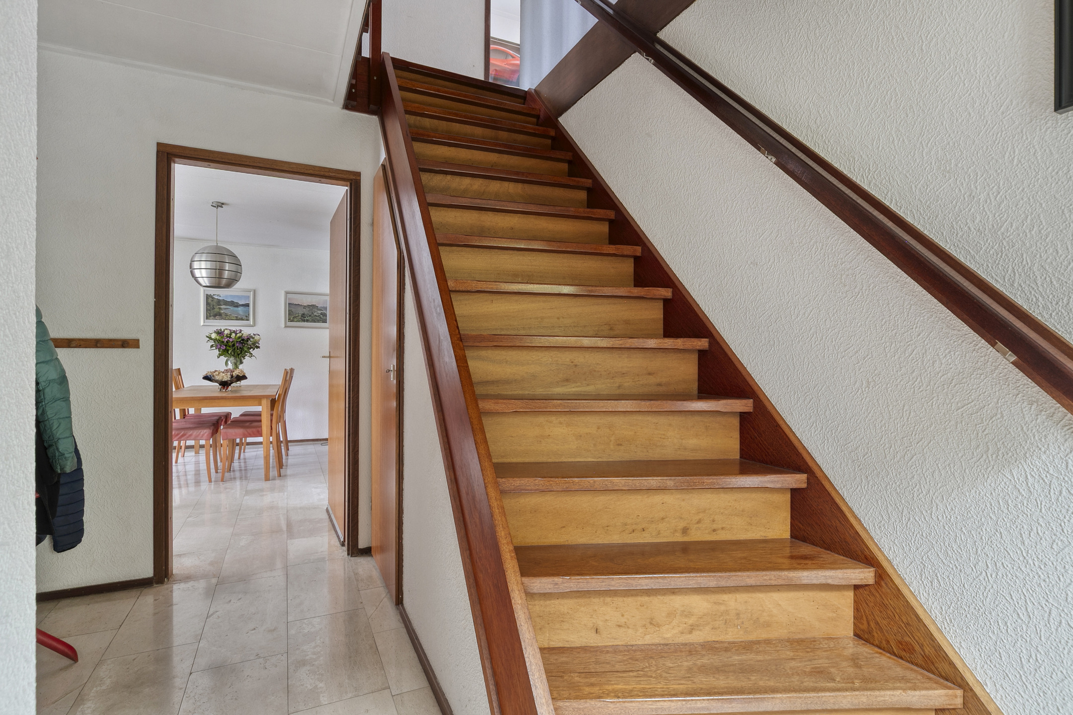 Entrance into a spacious hall with meter cupboard, toilet, staircase to the first floor, and access to the living room.