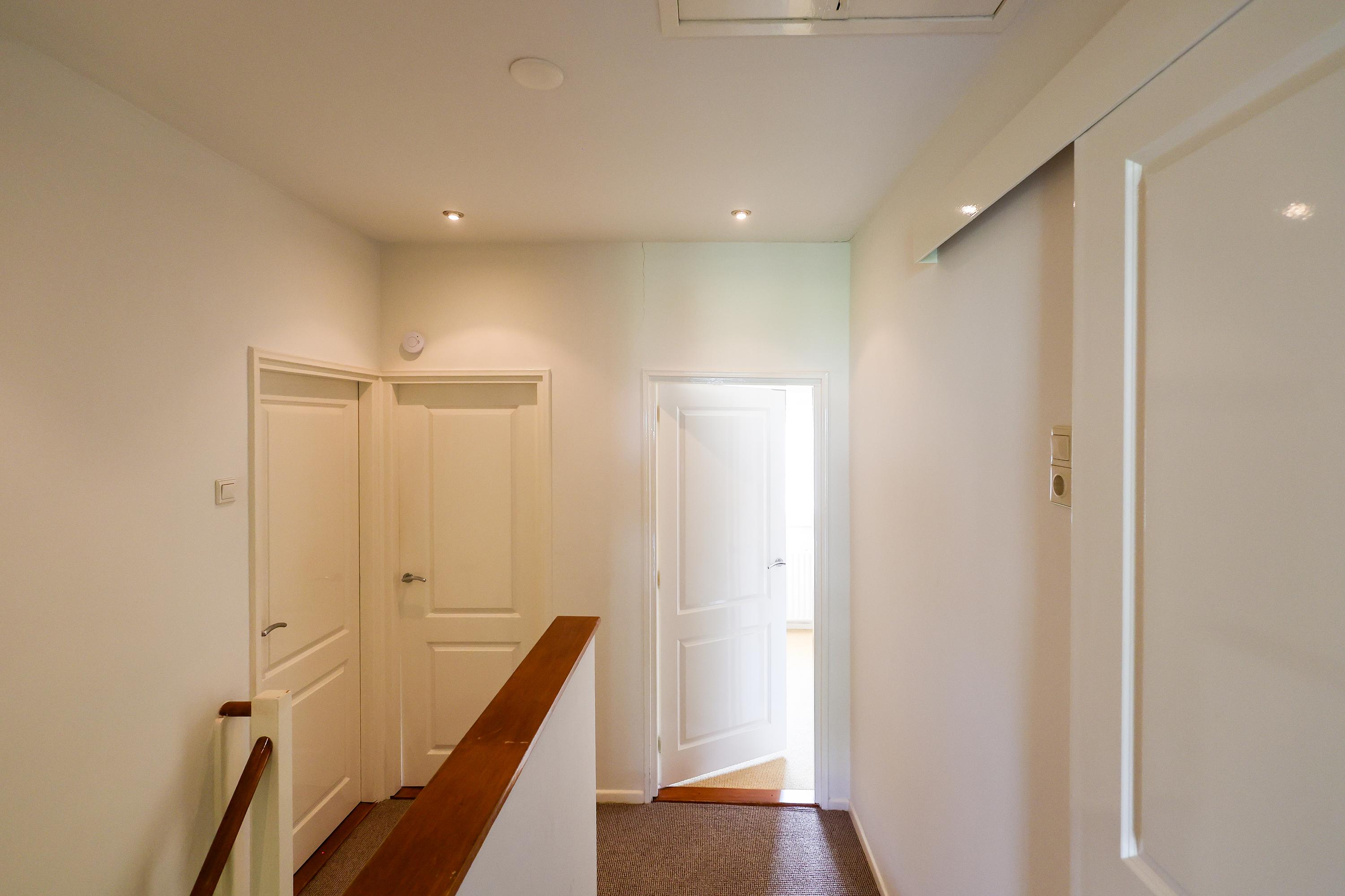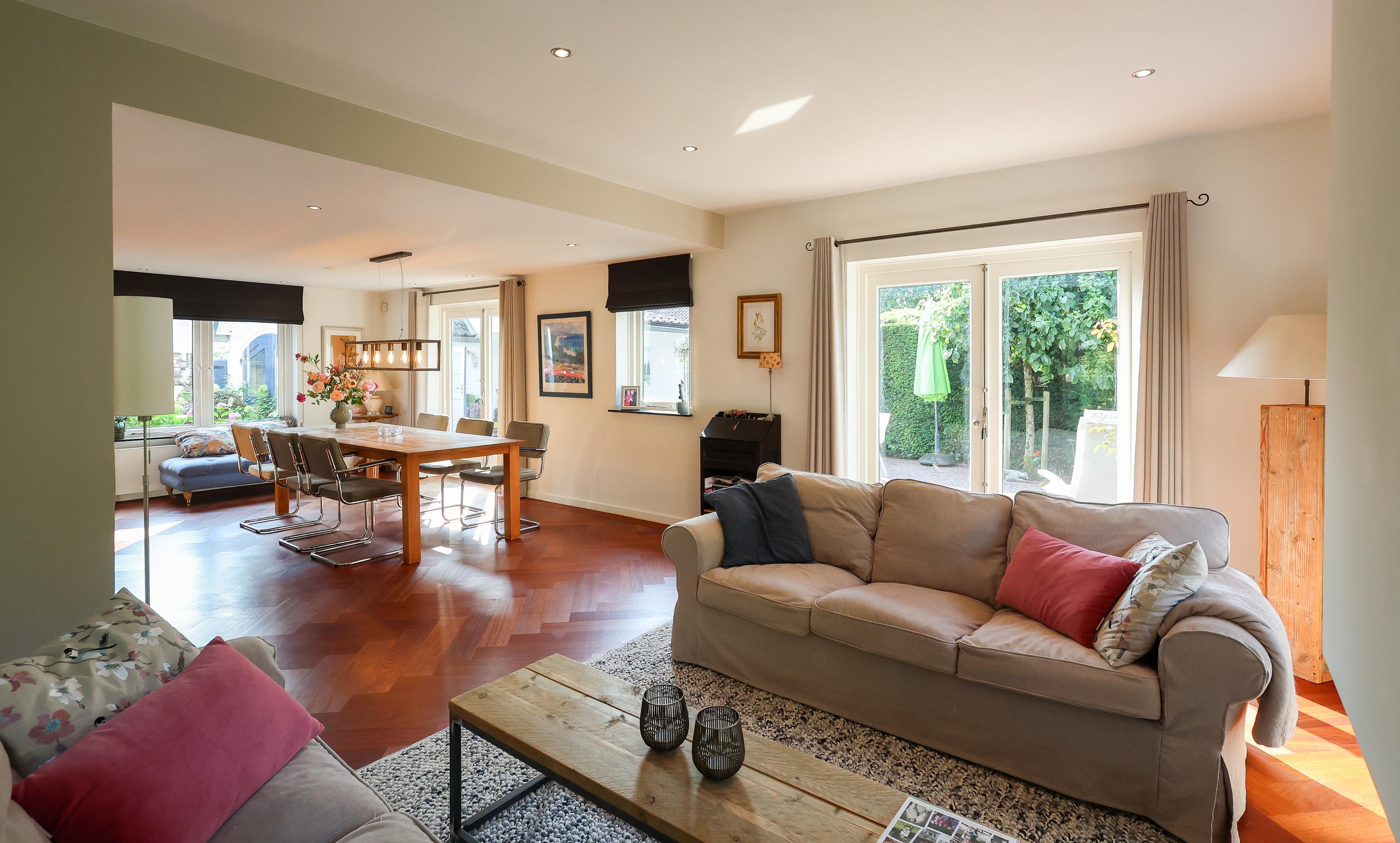 Inside, you are welcomed into a hallway with a guest toilet (although, as is customary in Blaricum, you'll likely enter through the back door). The bright L-shaped living room spans the entire rear of the house and features a parquet floor and gas fireplace perfect for long evenings or sunny afternoons with the French doors open to the garden. The open-plan kitchen is modern and functional, equipped with built-in appliances and a back door leading to the inner garden. A full-height basement offers additional storage space and room for a washer and dryer.