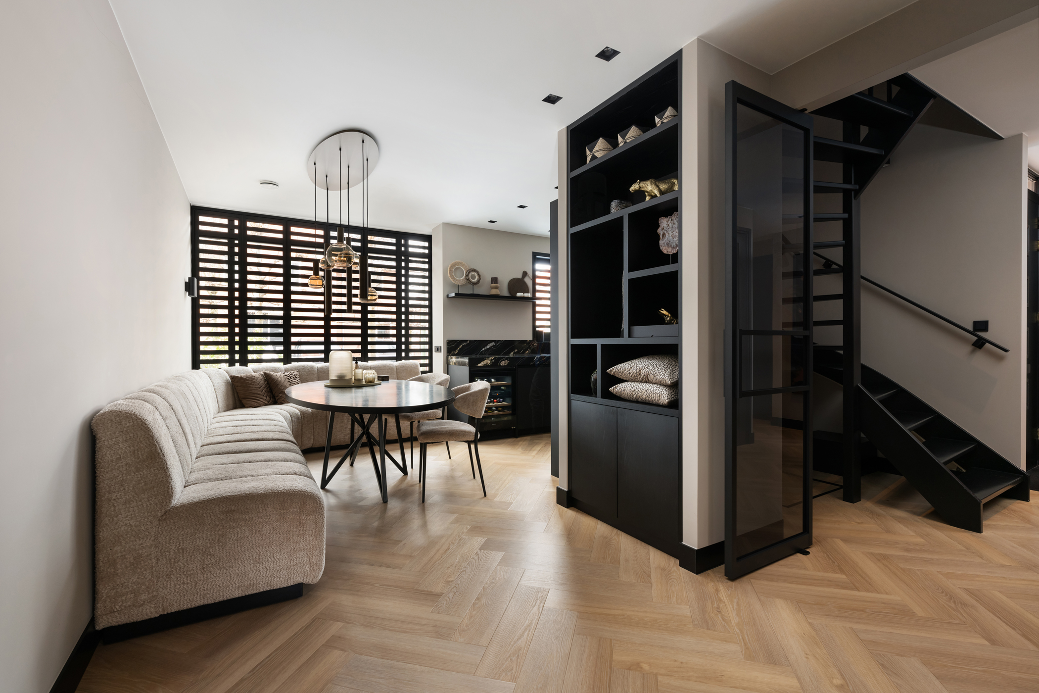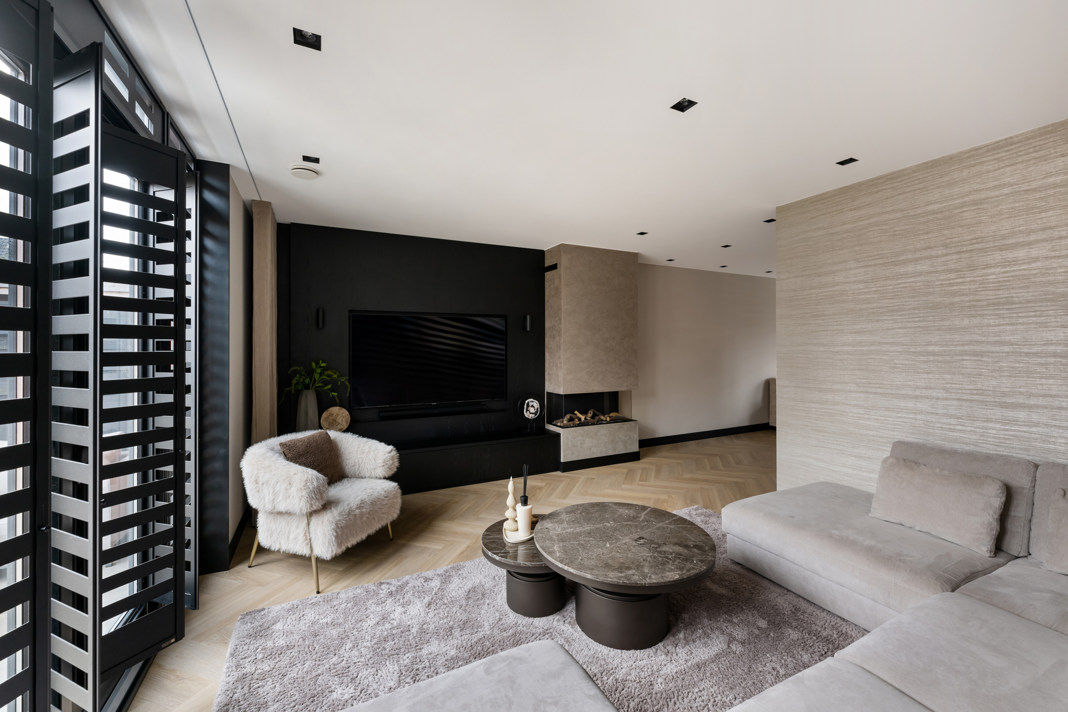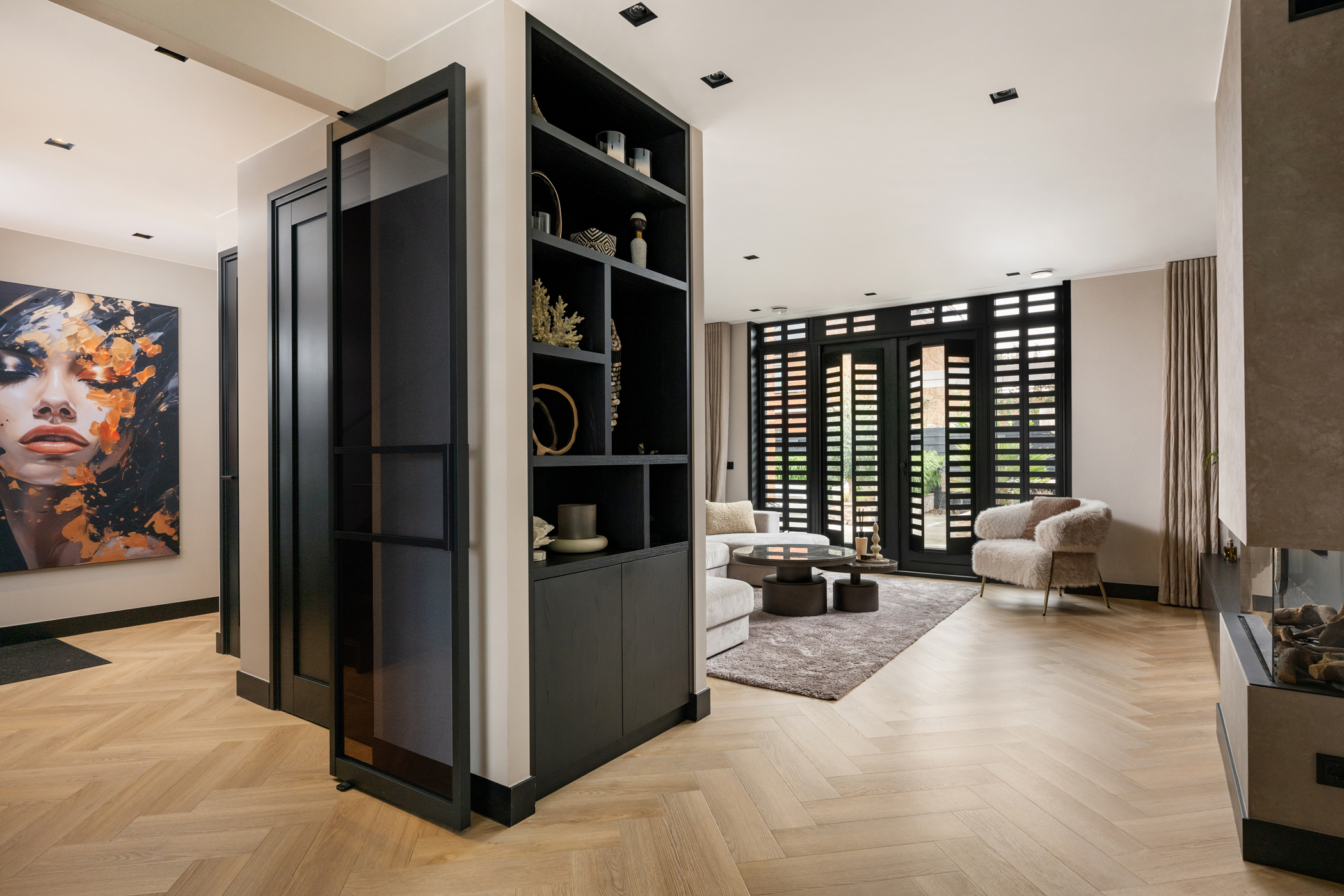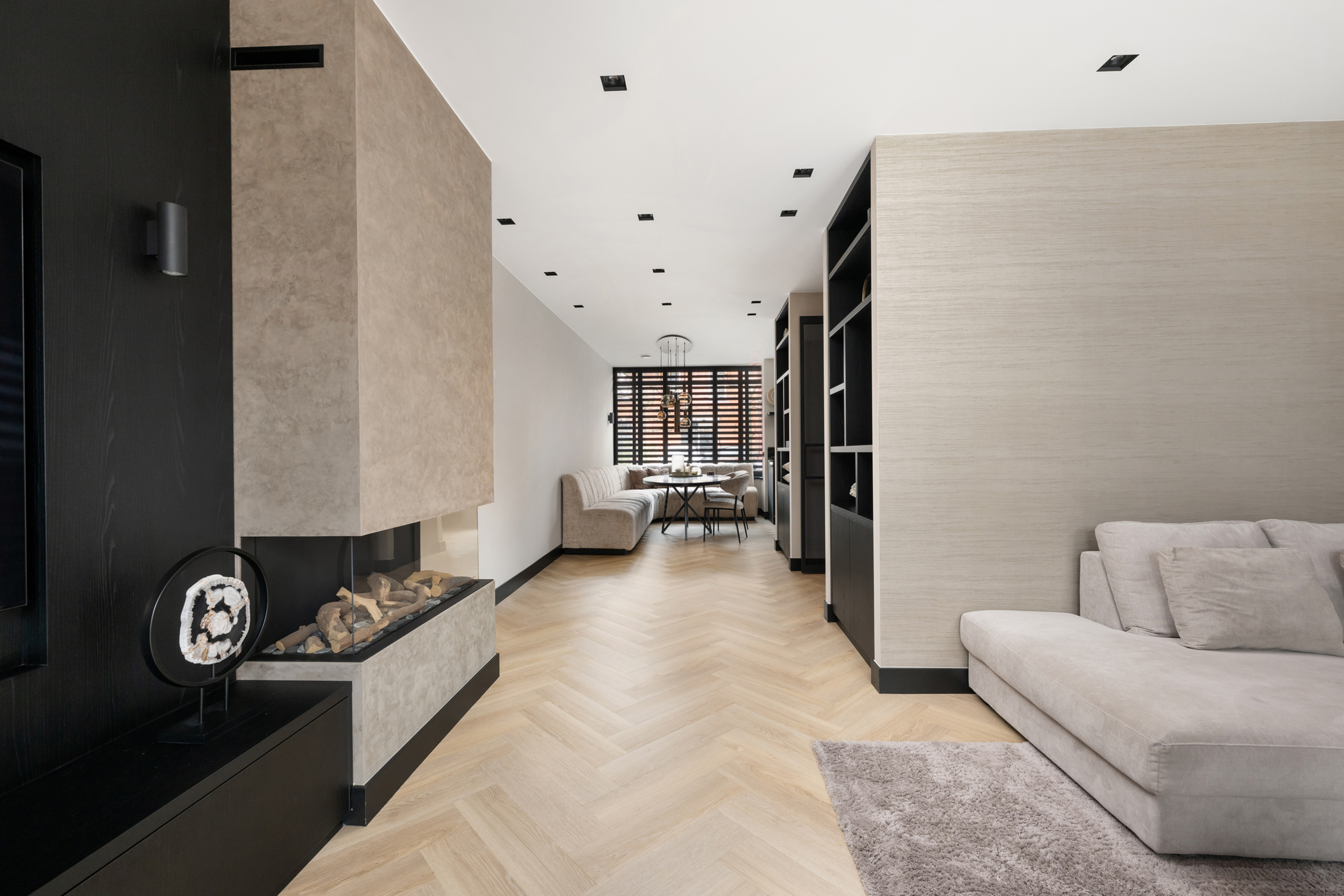 The atmospheric living room, with the seating area at the rear, features custom-built shelving units, a bespoke TV cabinet, aluminium shutters, a herringbone PVC floor with underfloor heating and a stylish gas fireplace.