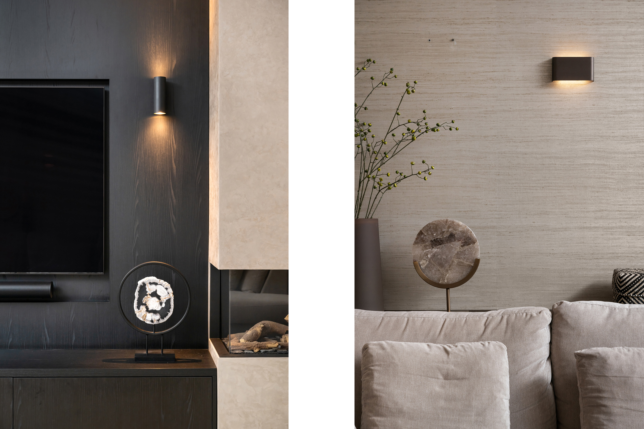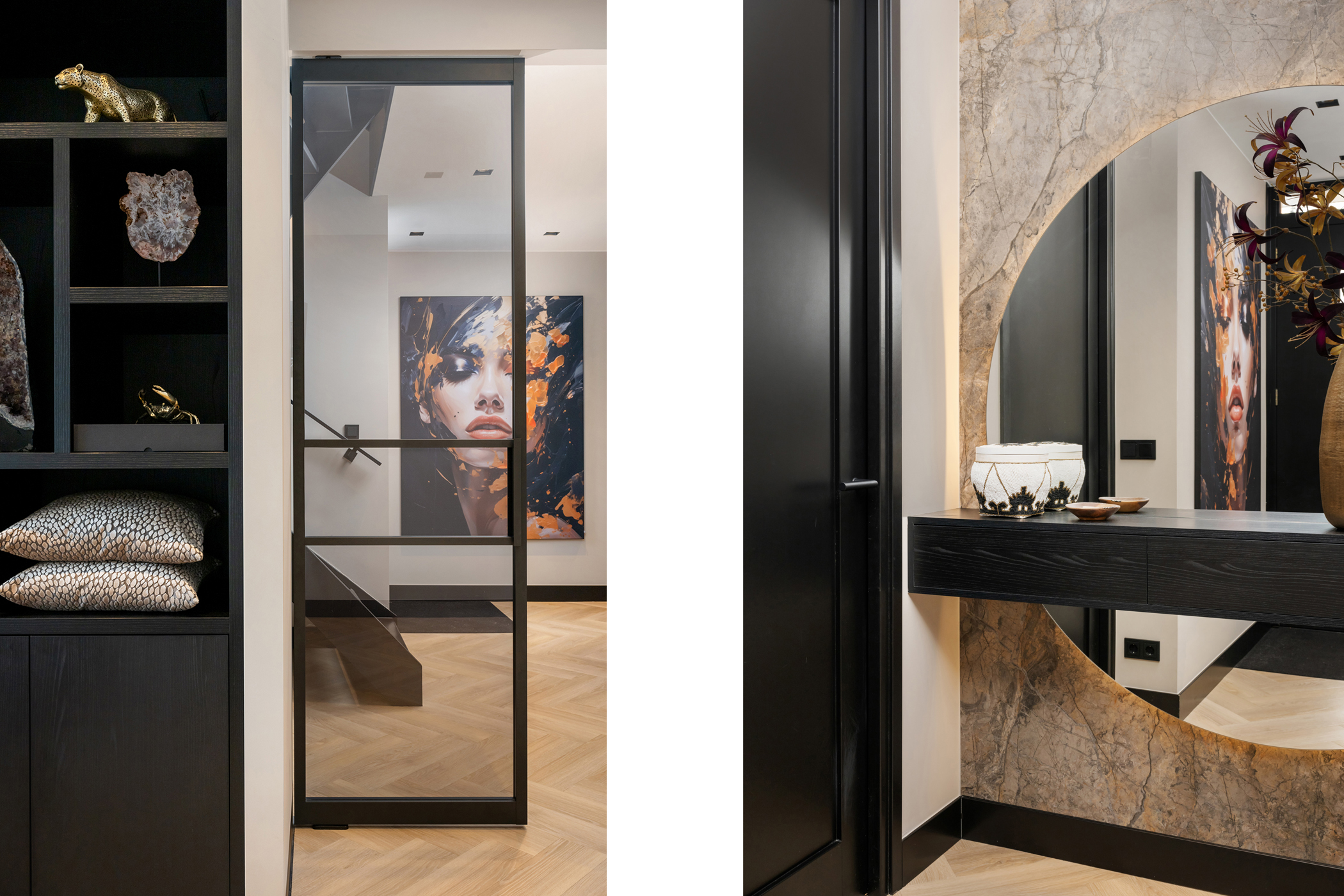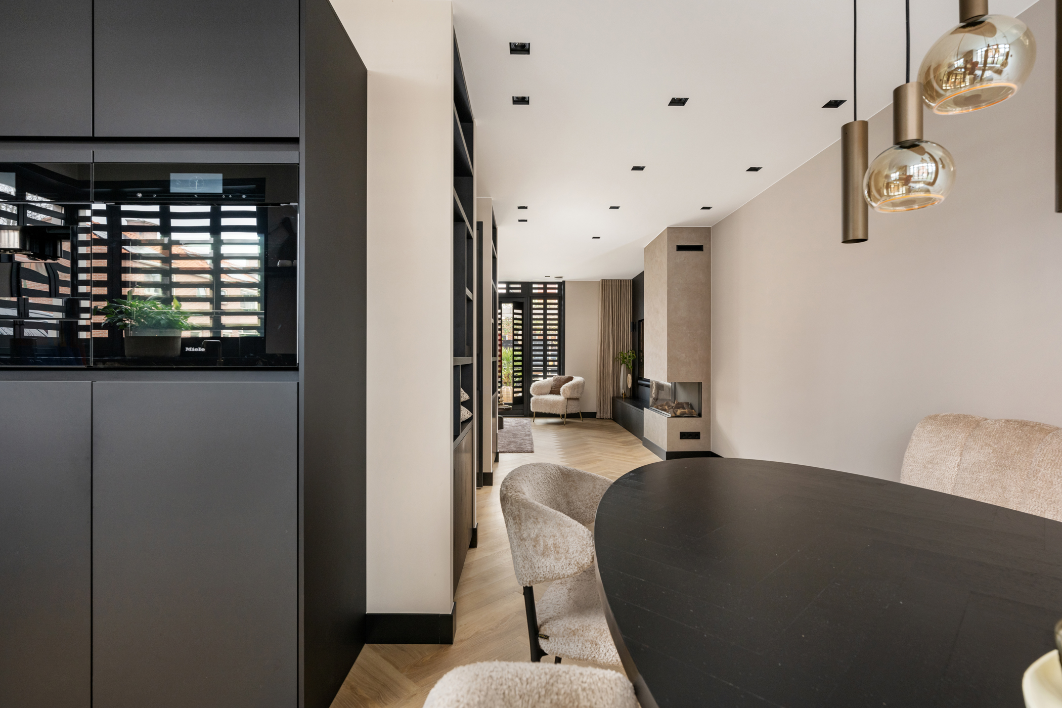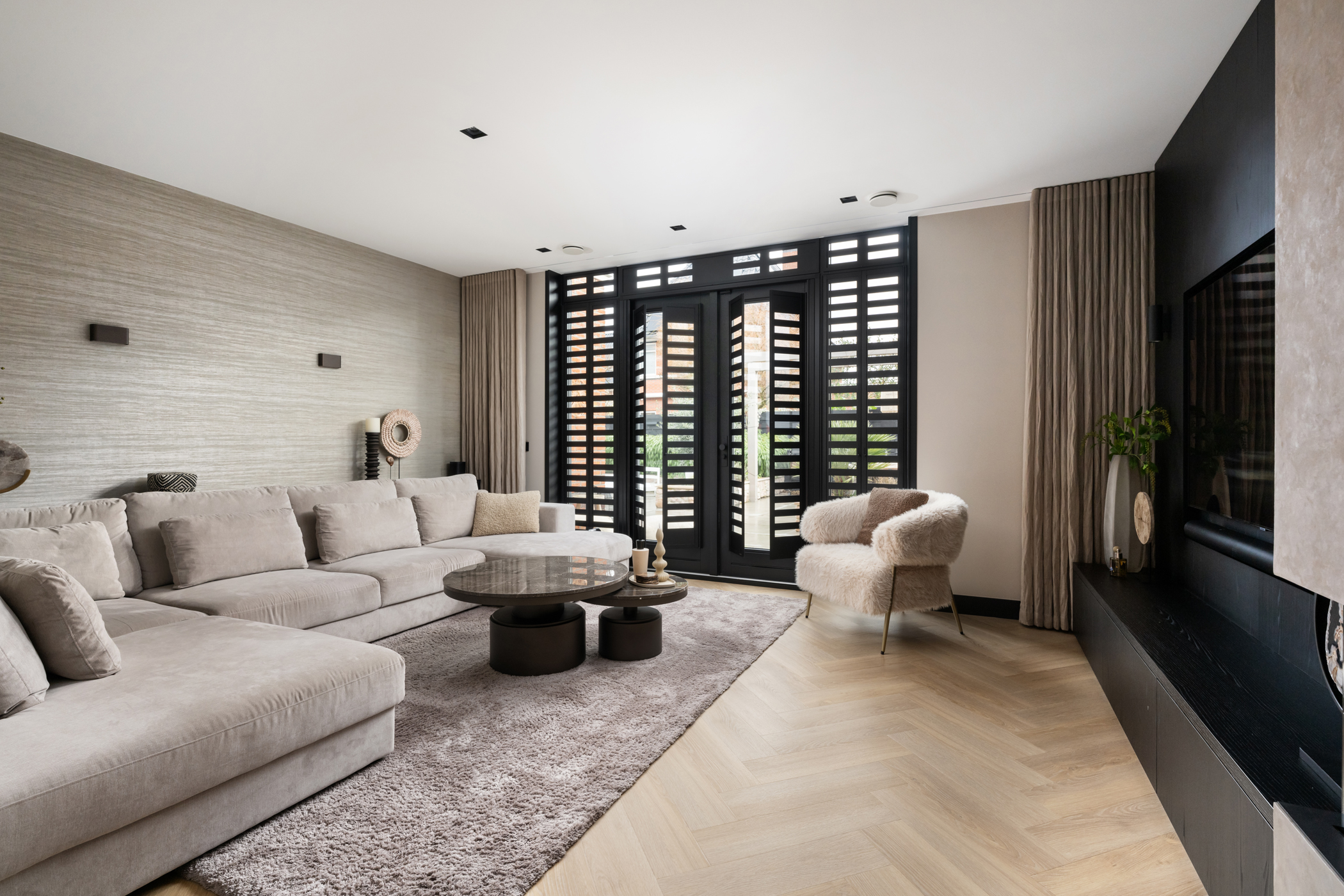 The atmospheric living room, with the seating area at the rear, features custom-built shelving units, a bespoke TV cabinet, aluminium shutters, a herringbone PVC floor with underfloor heating and a stylish gas fireplace.