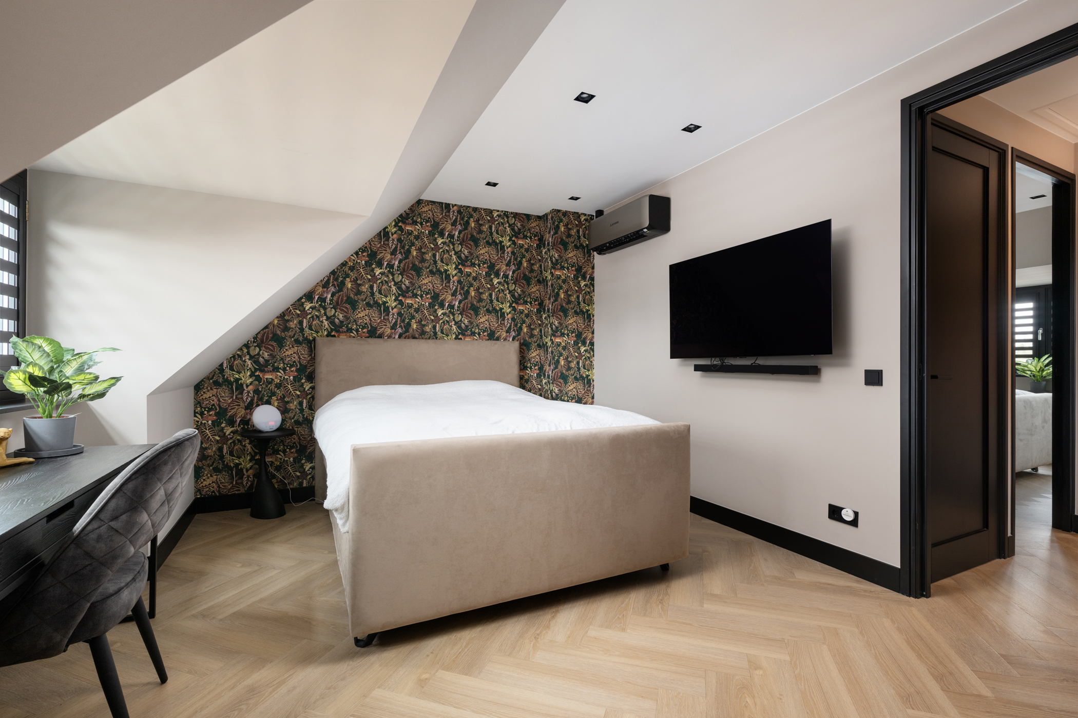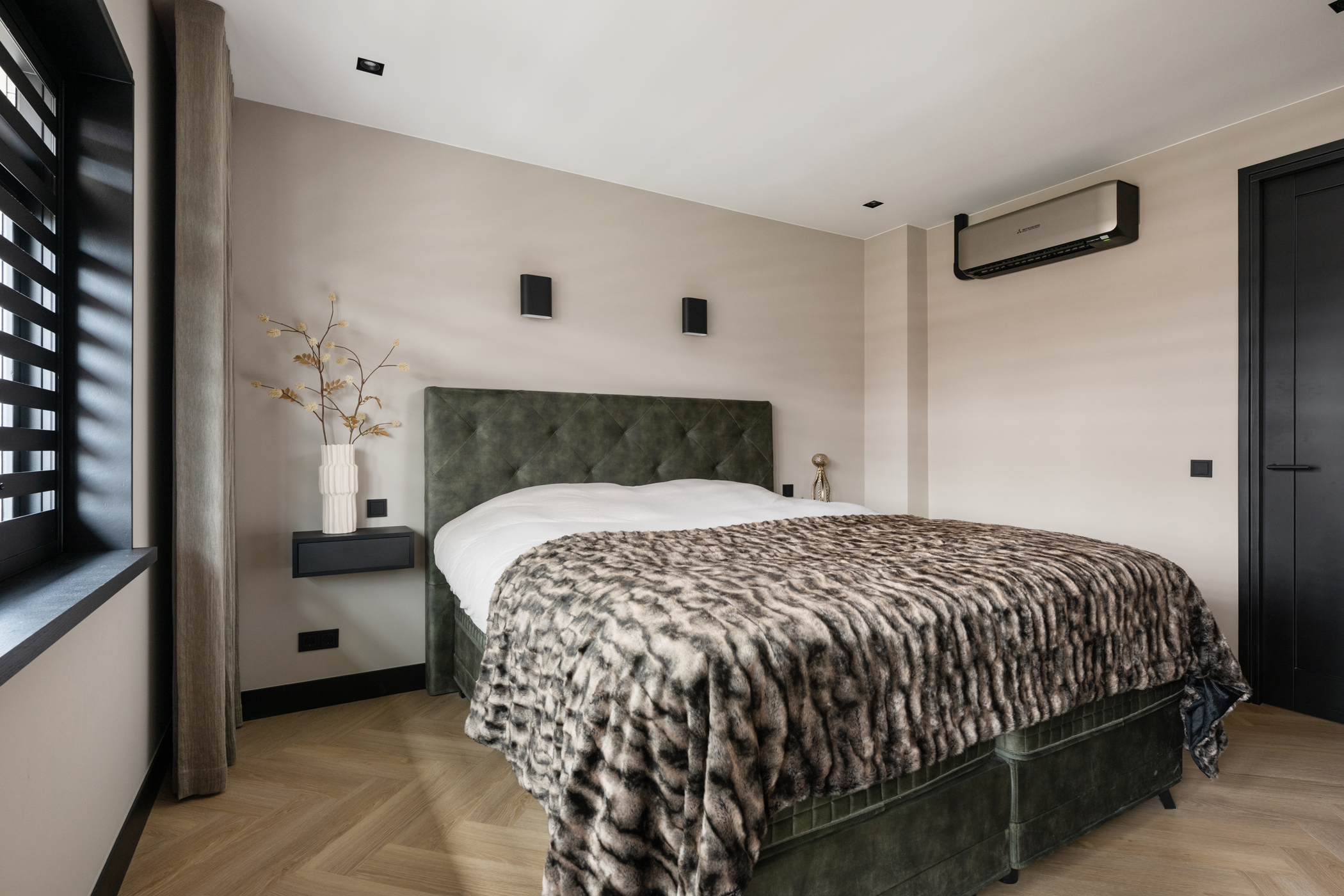 At the front you will find the third bedroom, equipped with air conditioning and built-in wardrobes hidden behind a stylish slatted wall.