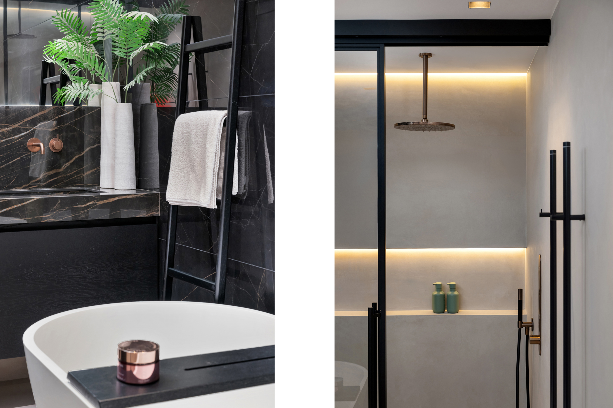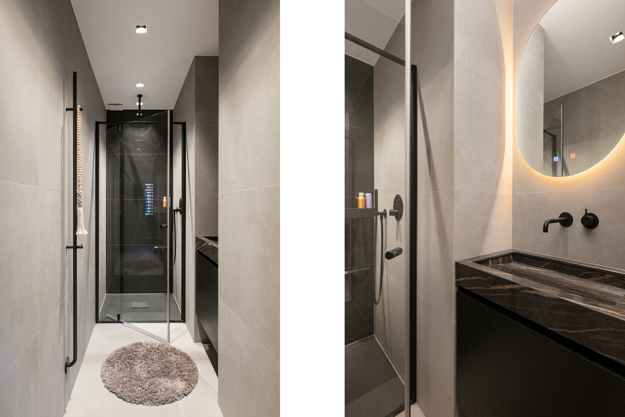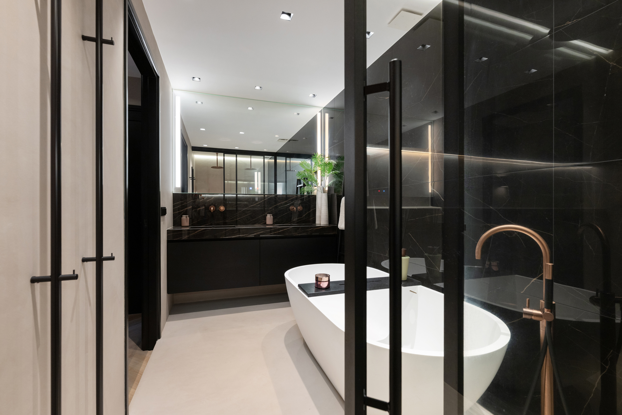 The luxurious bathroom is a true wellness space and includes a double walk-in shower, bathtub, double washbasin, mirror with lighting and heating, electric towel warmers and underfloor heating.