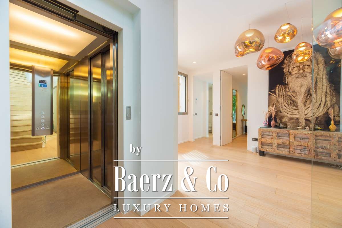 Residents have access to a private and heated pool, lush gardens, and seamless indoor-outdoor flow through immaculately presented living spaces. The villa is appointed with a fitted kitchen, underfloor heating, air conditioning, and an integrated alarm system. A lift, garage, and ample parking support a lifestyle of subtle convenience.