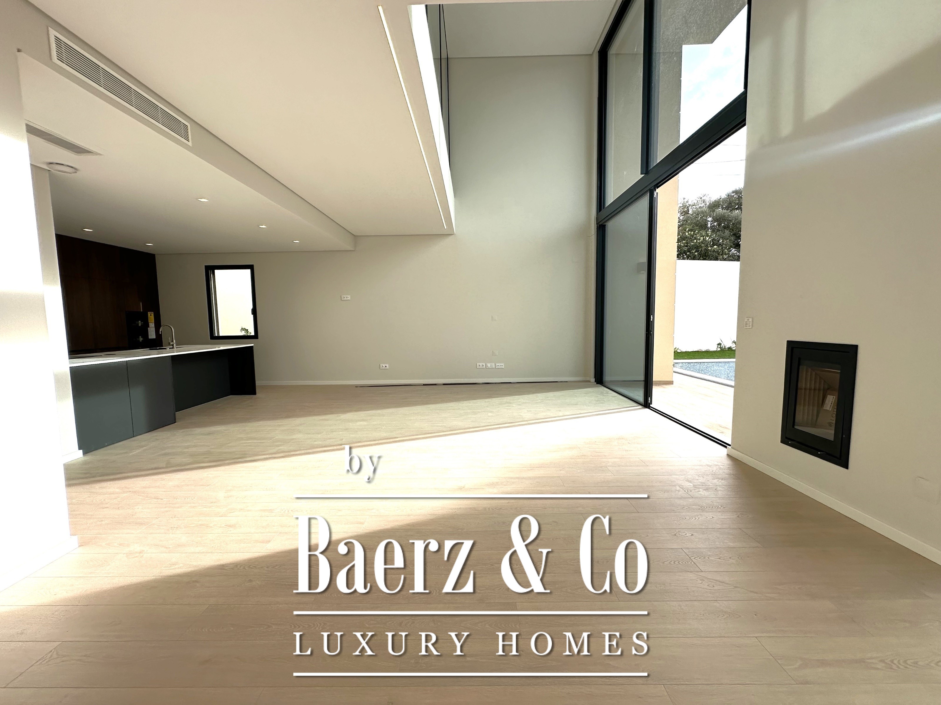 Villa Cascais captures the essence of contemporary architecture, situated within an intimate gated community of just four residences in Murchas. This villa, with its 570 m² of total living area and 212 m² of private gross space, draws light into every room, creating an atmosphere that feels both private and open. The main living room flows seamlessly into the kitchen, offering 62 m² of unobstructed space for gathering and daily life. On the same floor, a dedicated suite of 12 m² ensures privacy and comfort, complemented by an additional guest toilet.