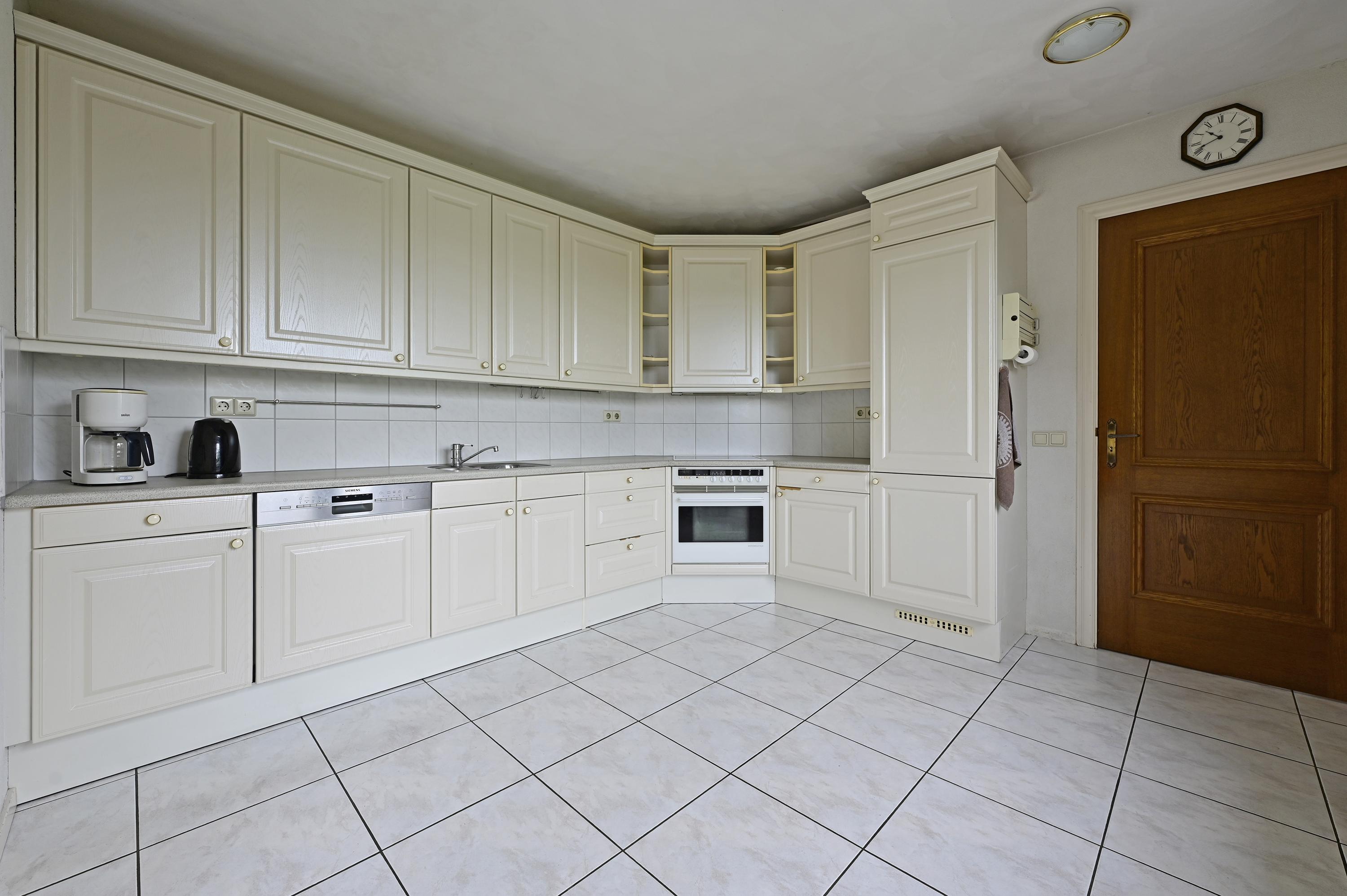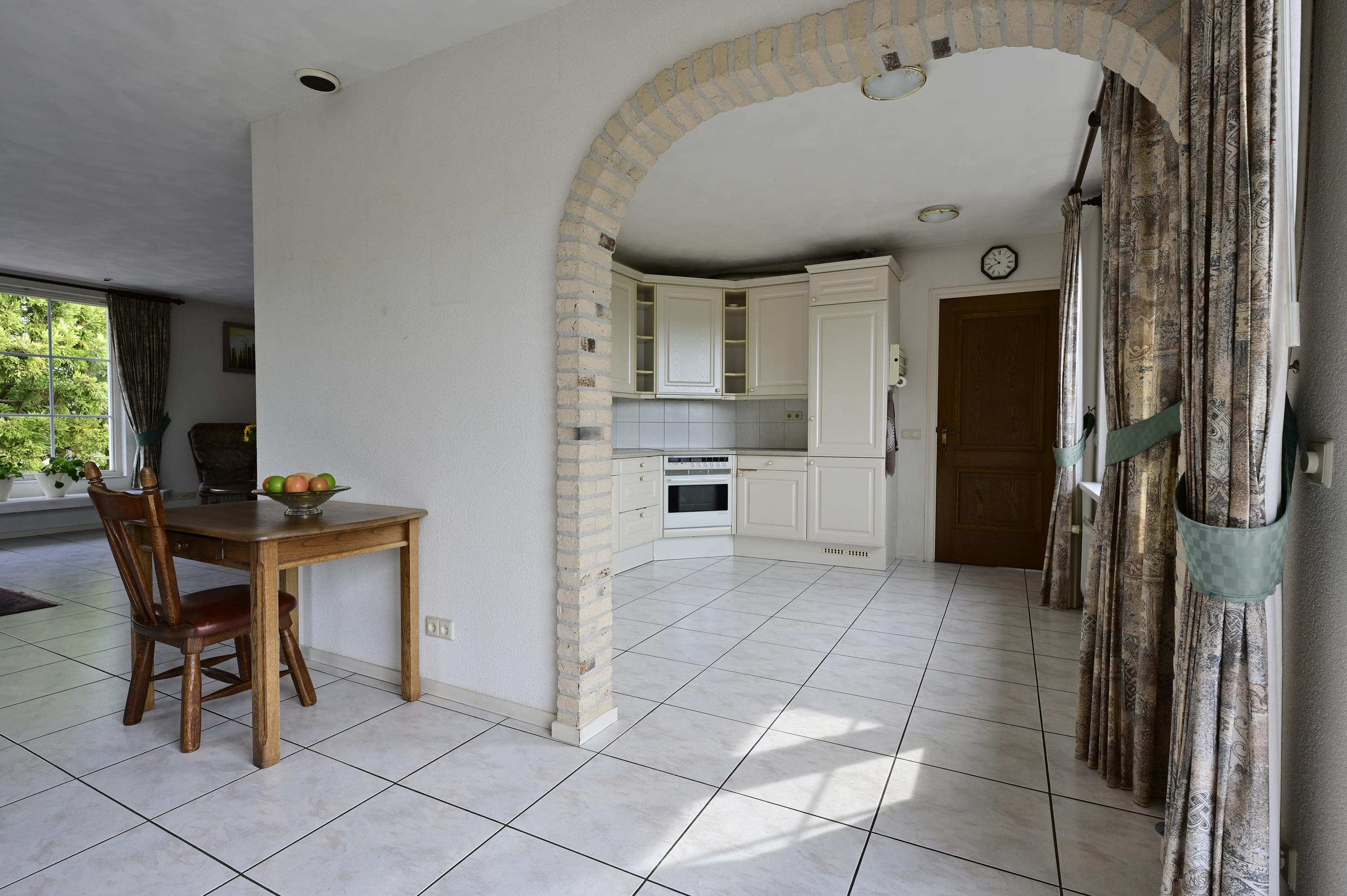 An elegant archway connects the dining area to the bright, spacious kitchen, which features twin casement windows overlooking the rear garden. The kitchen is fitted with ample cabinetry and integrated appliances: dishwasher, oven, electric hob with extractor, and fridge/freezer. Adjoining is the practical utility room with built-in cupboard (housing the underfloor heating distribution system), additional storage, laundry connections, an extra sink, and a door to the terrace.