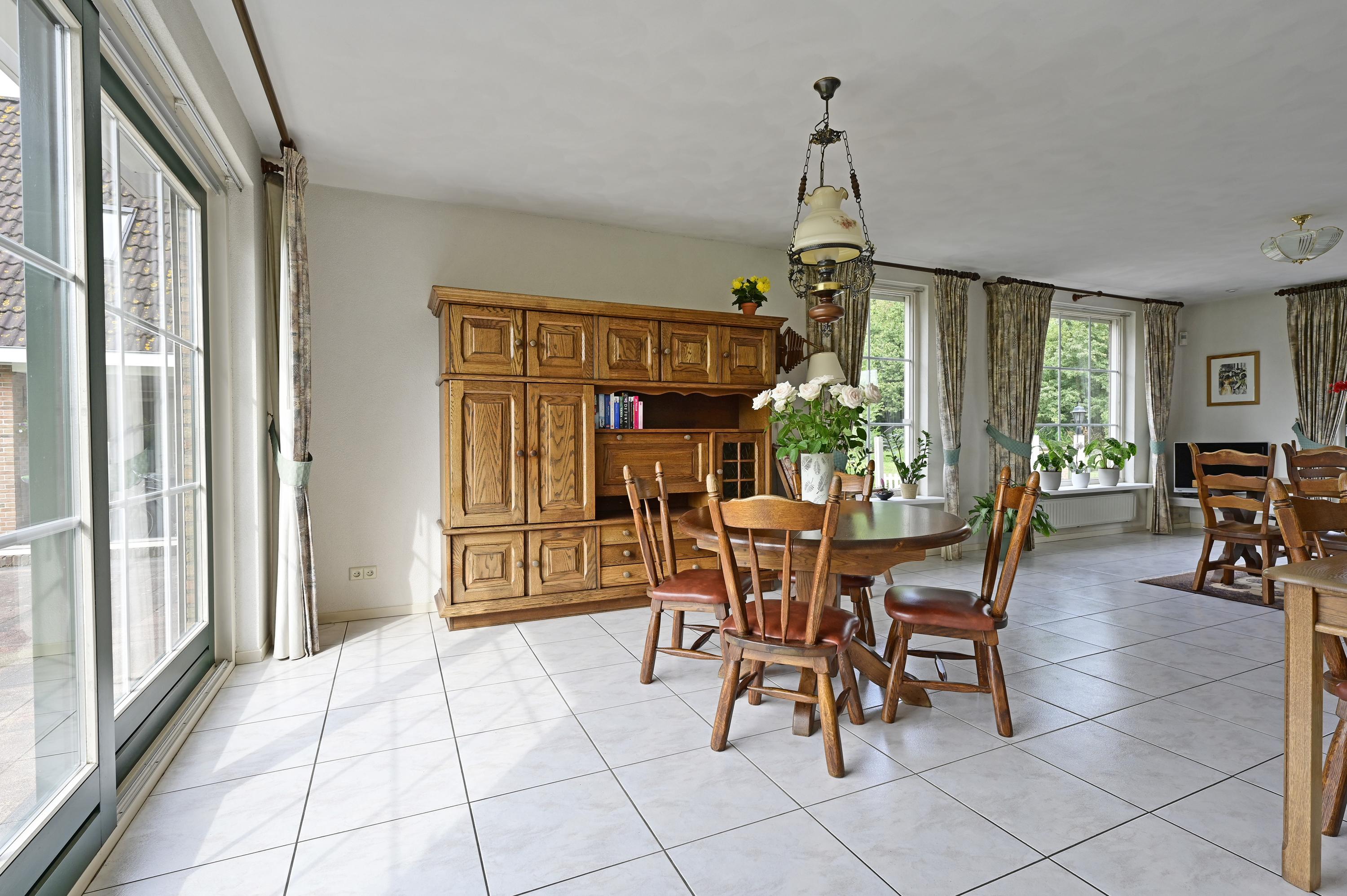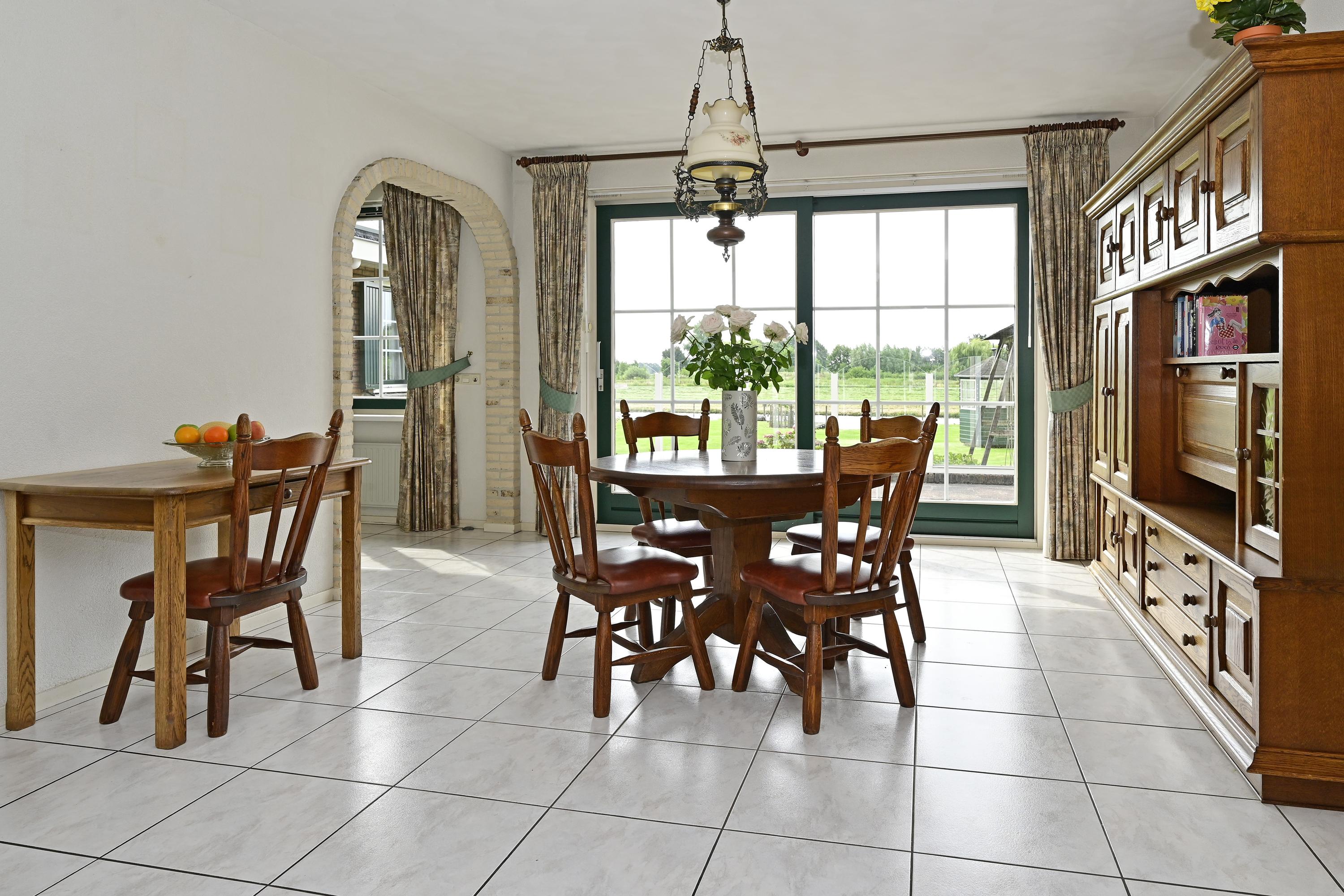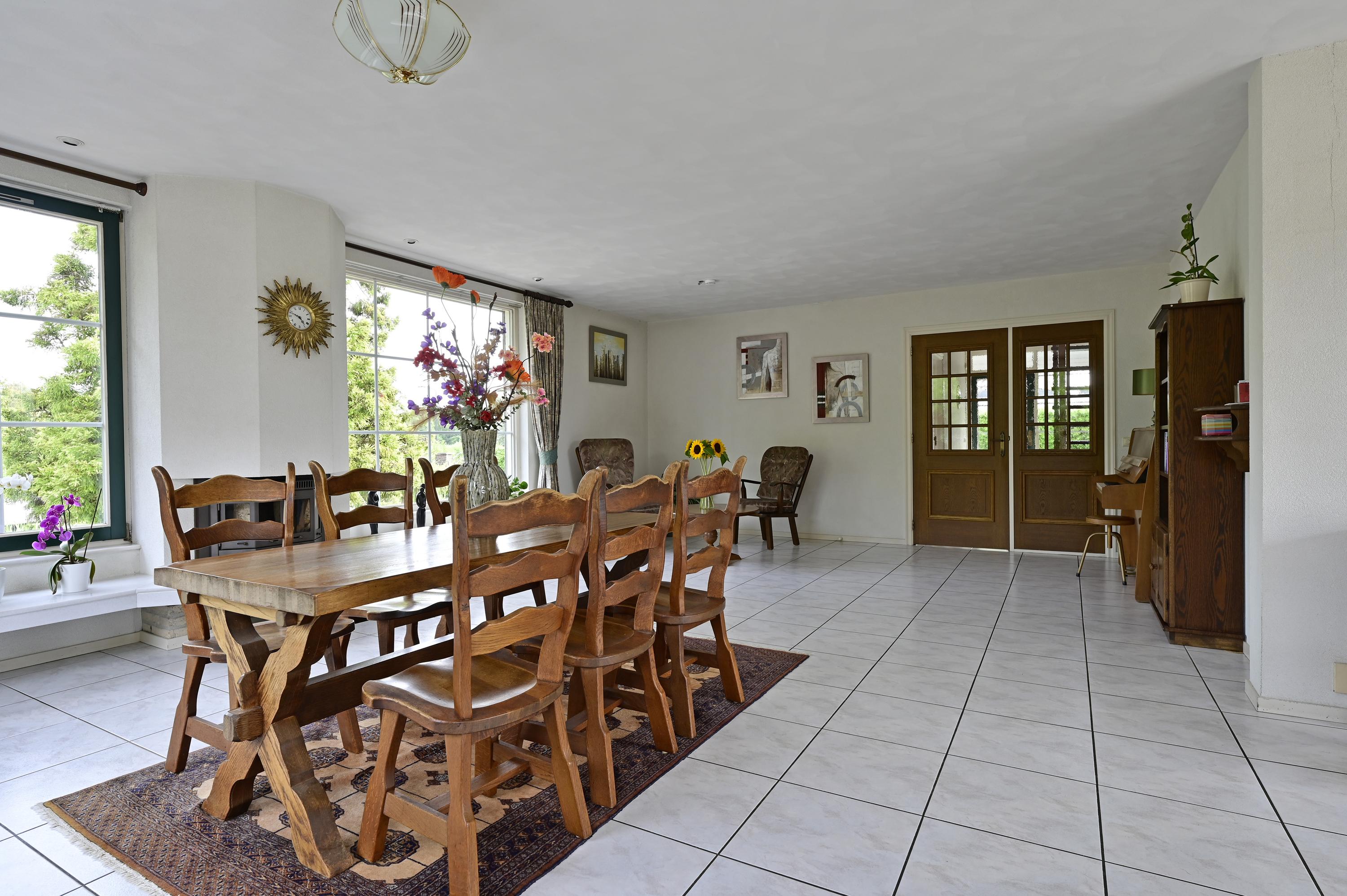 A handsome wooden-glass partition with matching door opens into the atmospheric L-shaped living room. Expansive windows flood the space with daylight and frame views of the front and side gardens. A marble hearth with a closable wood-burning fireplace forms the inviting centerpiece of the lounge. At the rear, ample space is available for a large dining table, directly beside the French doors opening onto the elevated, pile-founded terrace – with breathtaking views across the garden, water, and polder landscape.