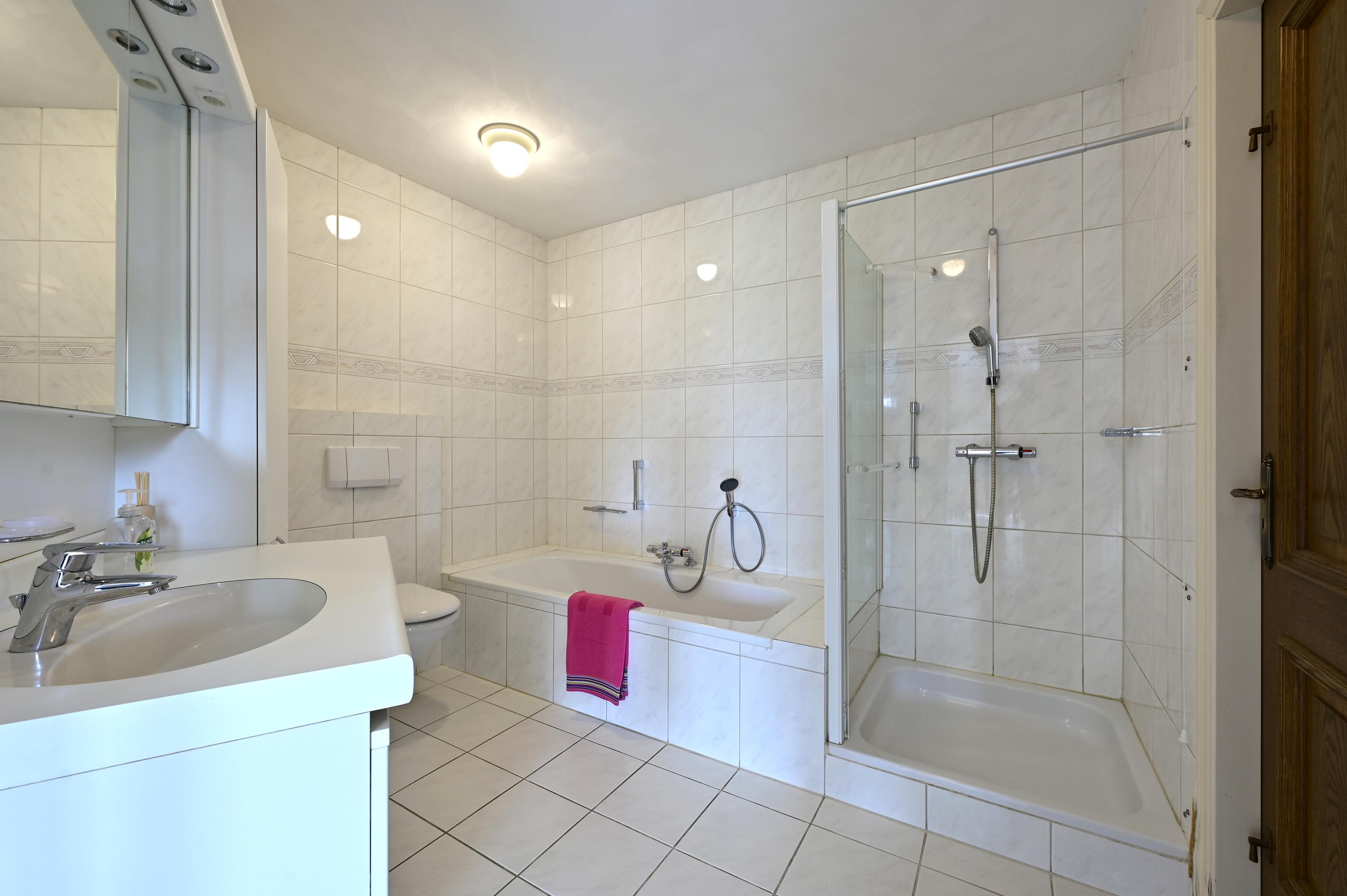 The hall provides access to a large, light-tiled bathroom featuring a shower cabin, bathtub, toilet, vanity unit with mirrored cabinet, and mechanical ventilation. This bathroom is accessible both from the central hall and directly from the adjacent bedroom – highly practical. The adjoining bedroom is generously proportioned, with four operable windows overlooking both the driveway and rear garden. A solid wooden sliding door gives access to a comfortable walk-in closet with window.