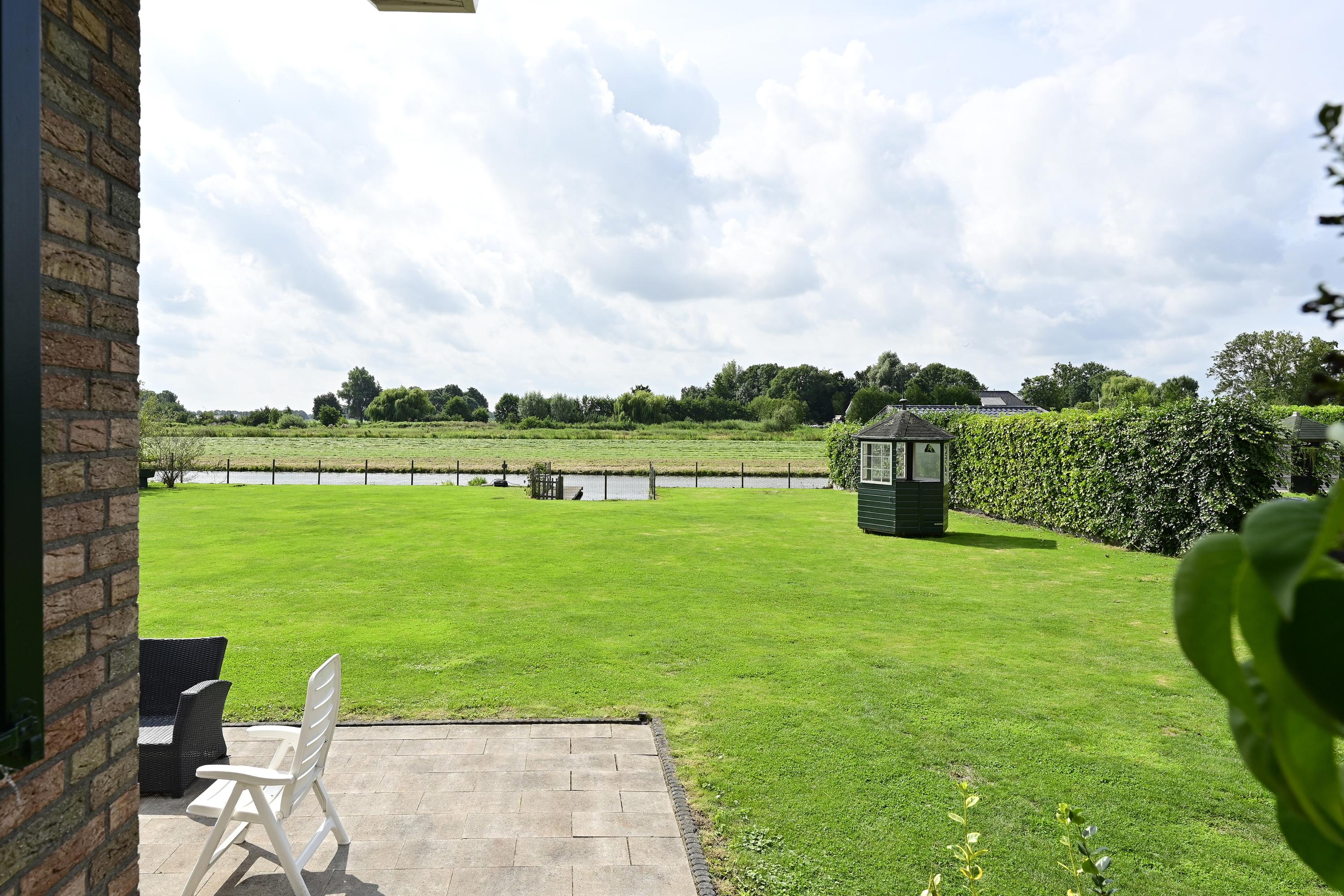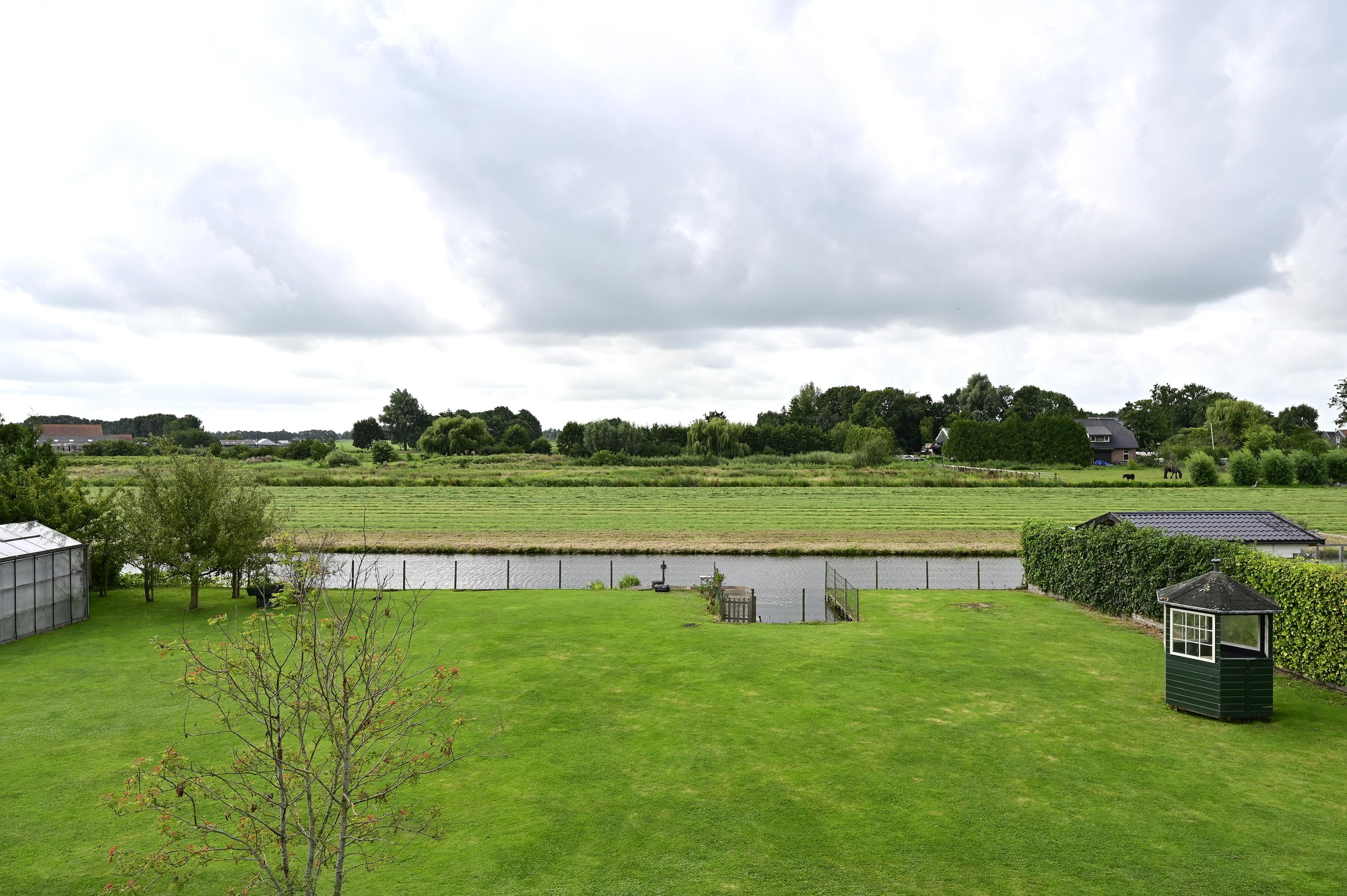 Behind the house, a spacious terrace invites you to create a seating area, while steps lead up to the elevated, pile-founded terrace adjoining the house. Enclosed with a glass windscreen, this sheltered spot is perfect for al fresco dining or lounging, with breathtaking views over the garden, water, and Dutch landscape.
