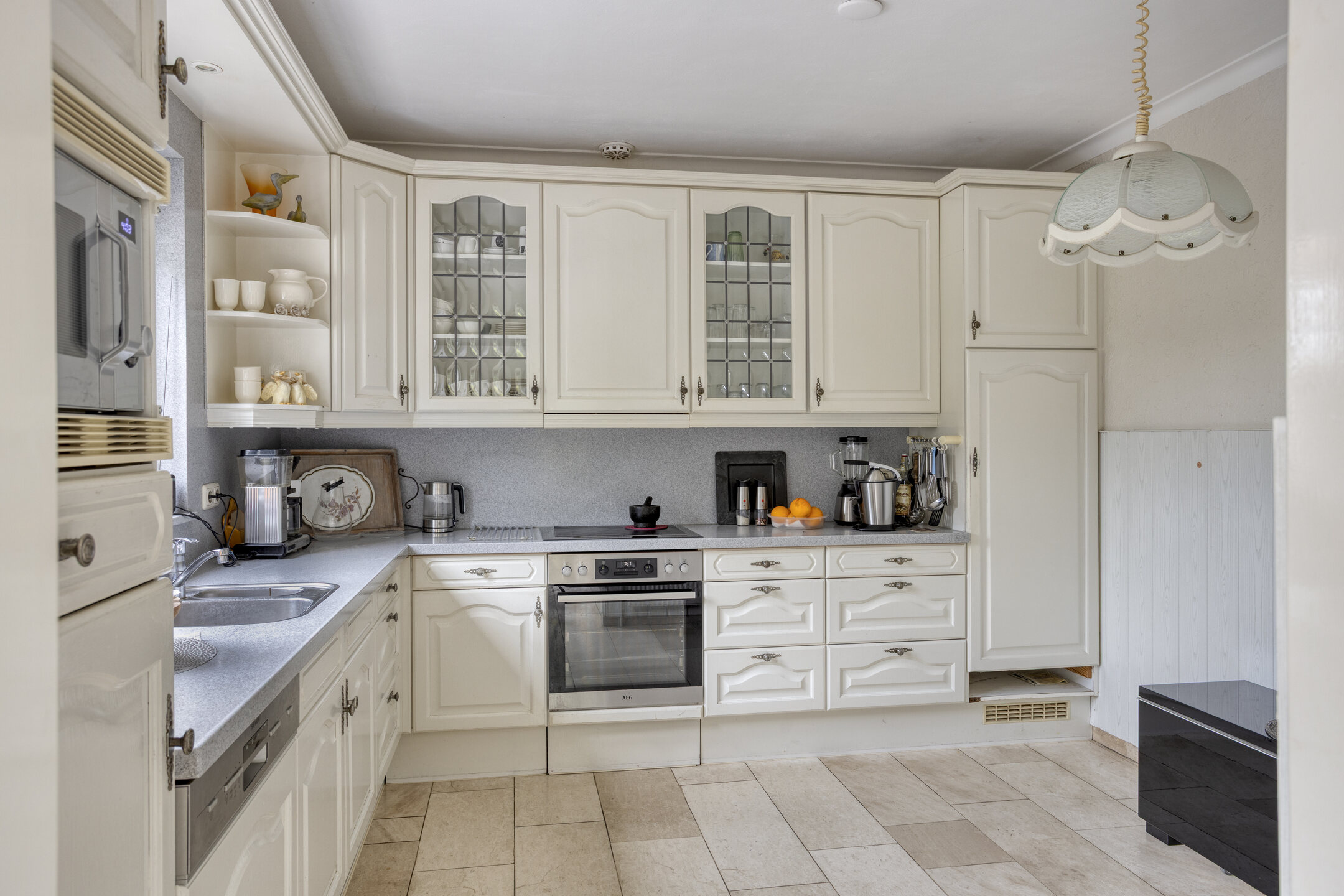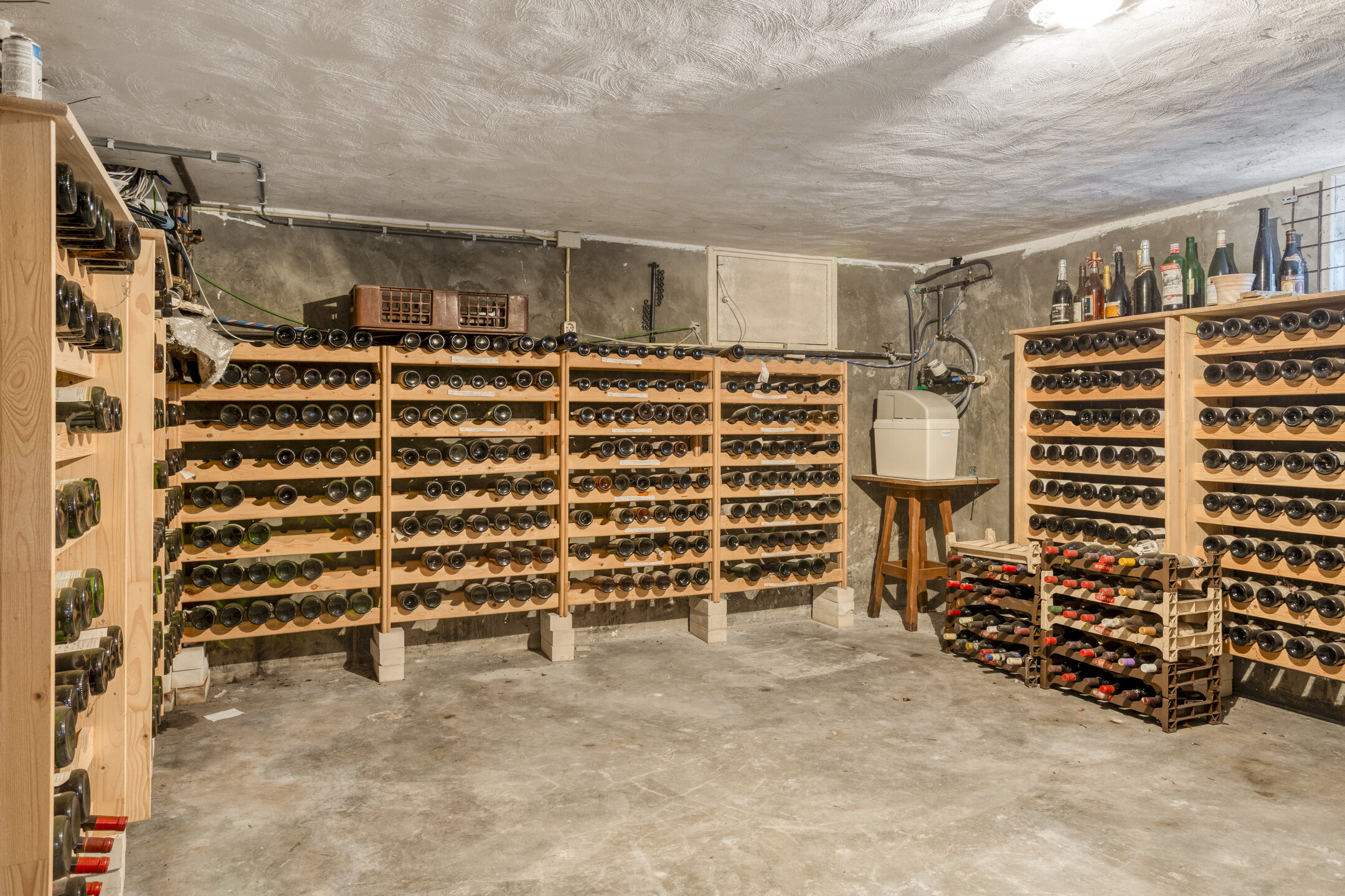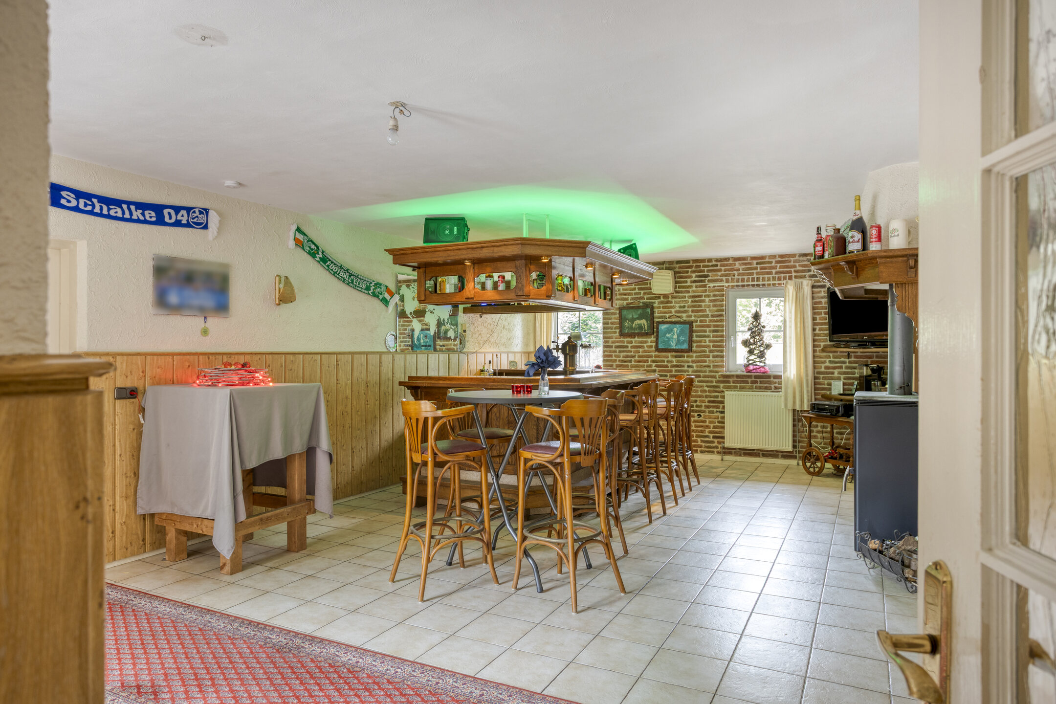 Ground floor: spacious hall/entrance with staircase, toilet with washbasin, meter cupboard, practical utility room, ideal wine cellar, pleasant living room with fireplace, abundant natural light, and garden doors opening to the sun terrace. Cozy country kitchen with built-in appliances, atmospheric “brown café” of approx. 48 m², additional office of 20 m², integral double garage with tiled floor, storage room, second toilet, sauna with shower, and access to the pleasant conservatory.