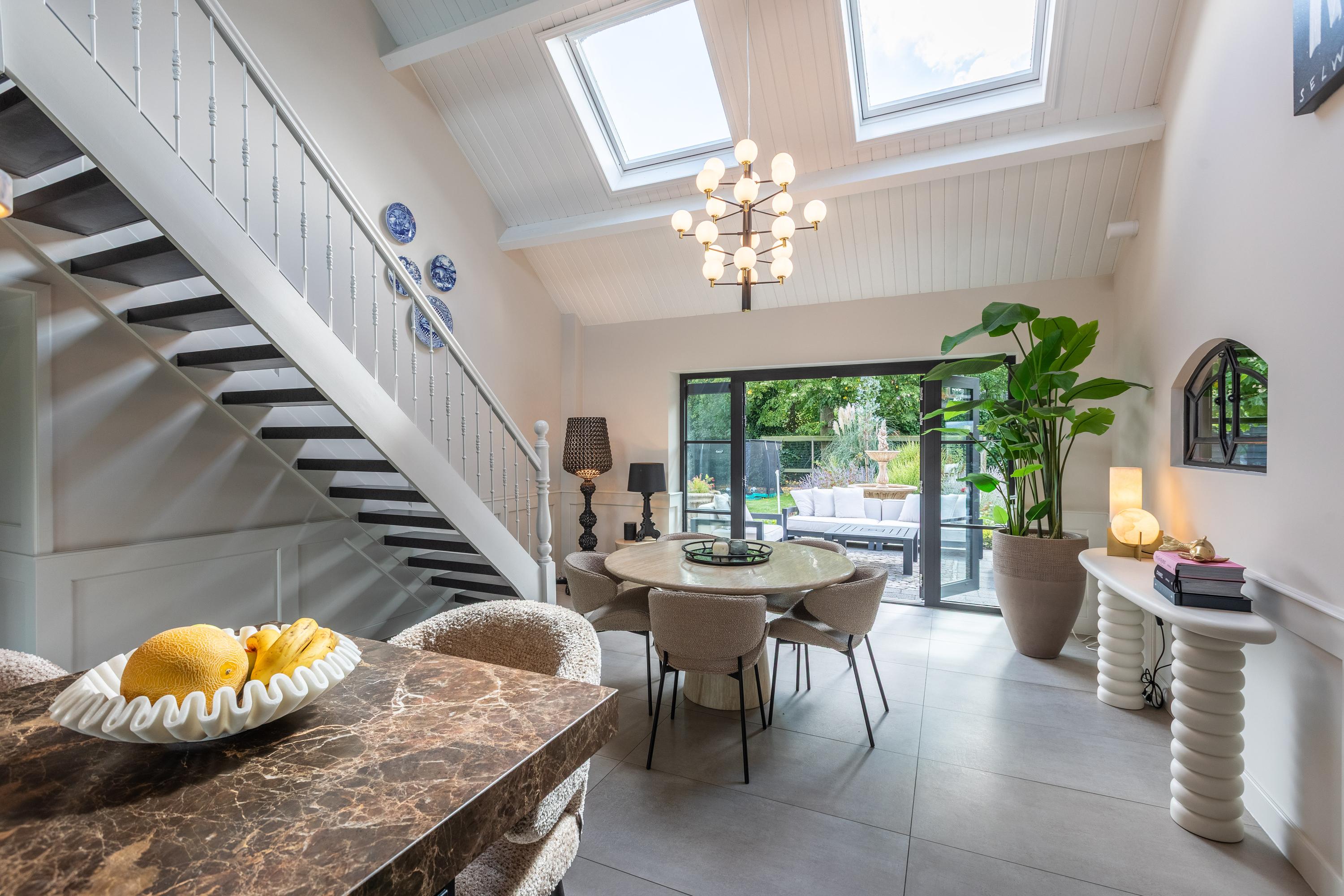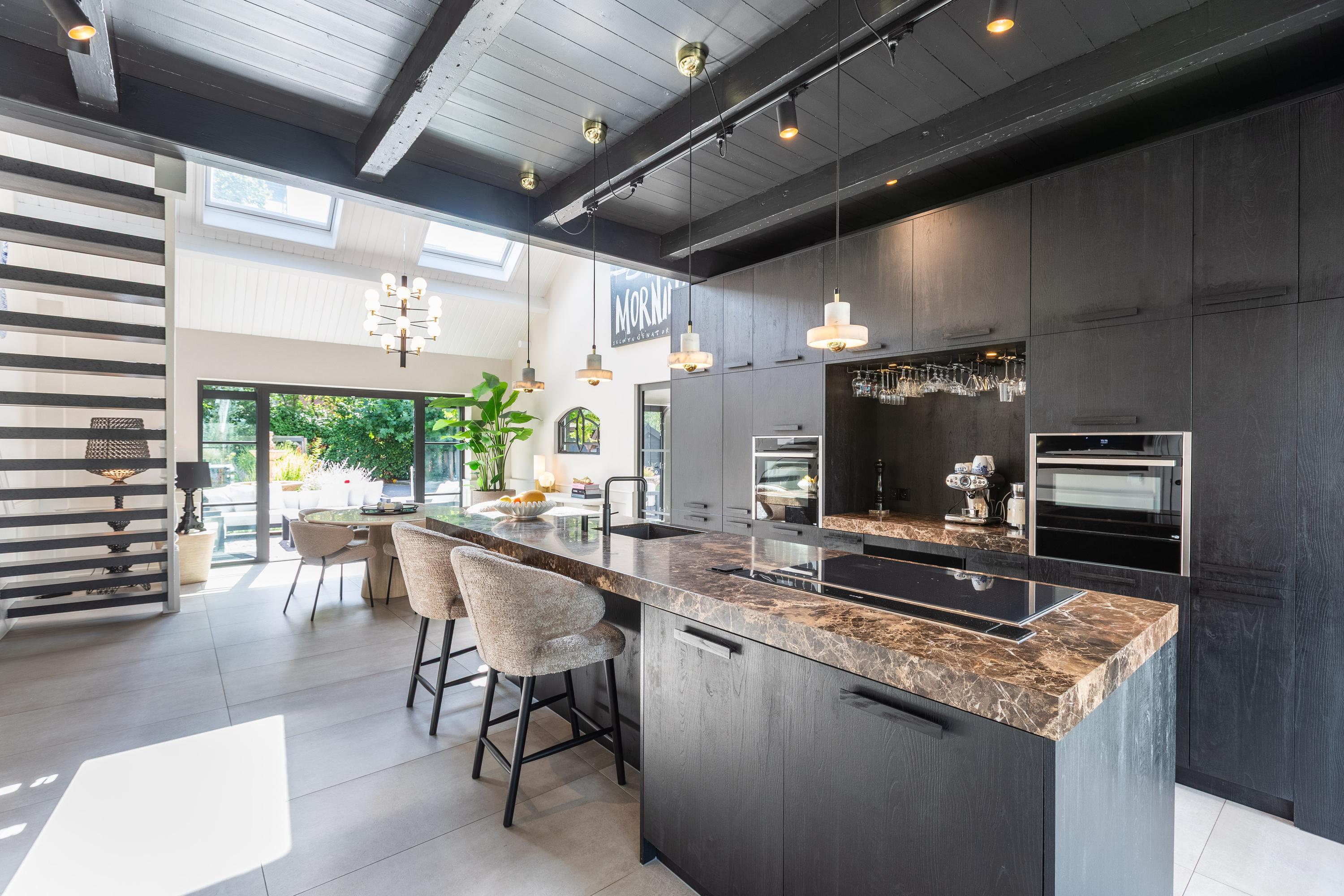The entrance is centrally located and provides access to a spacious hall with a cloakroom and toilet. From here, you enter the impressive kitchen/diner of approx. 45 m², luxuriously equipped with a cooking island and high-quality built-in appliances. Thanks to the high ceiling and mezzanine, you can enjoy a wonderful sense of space here.