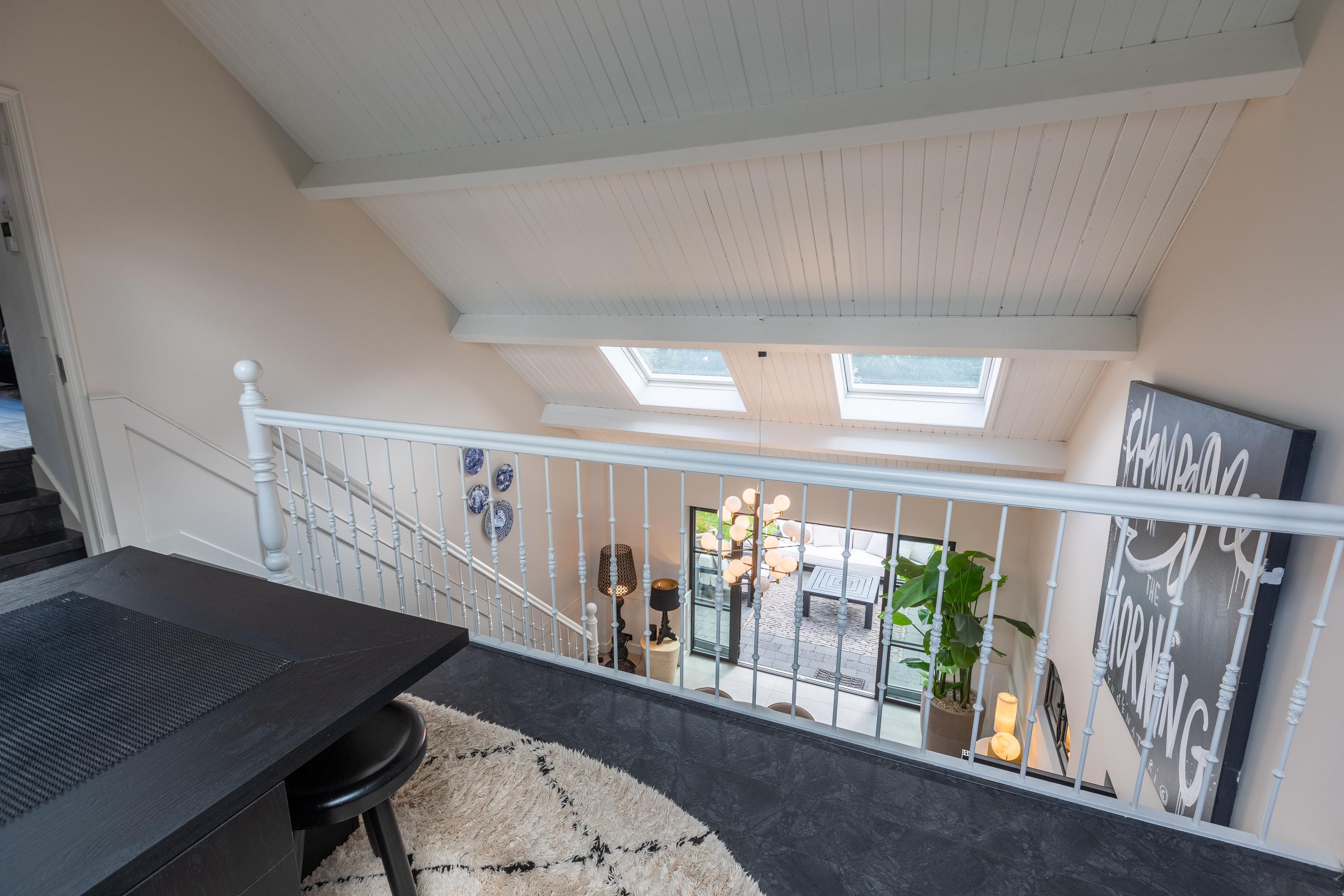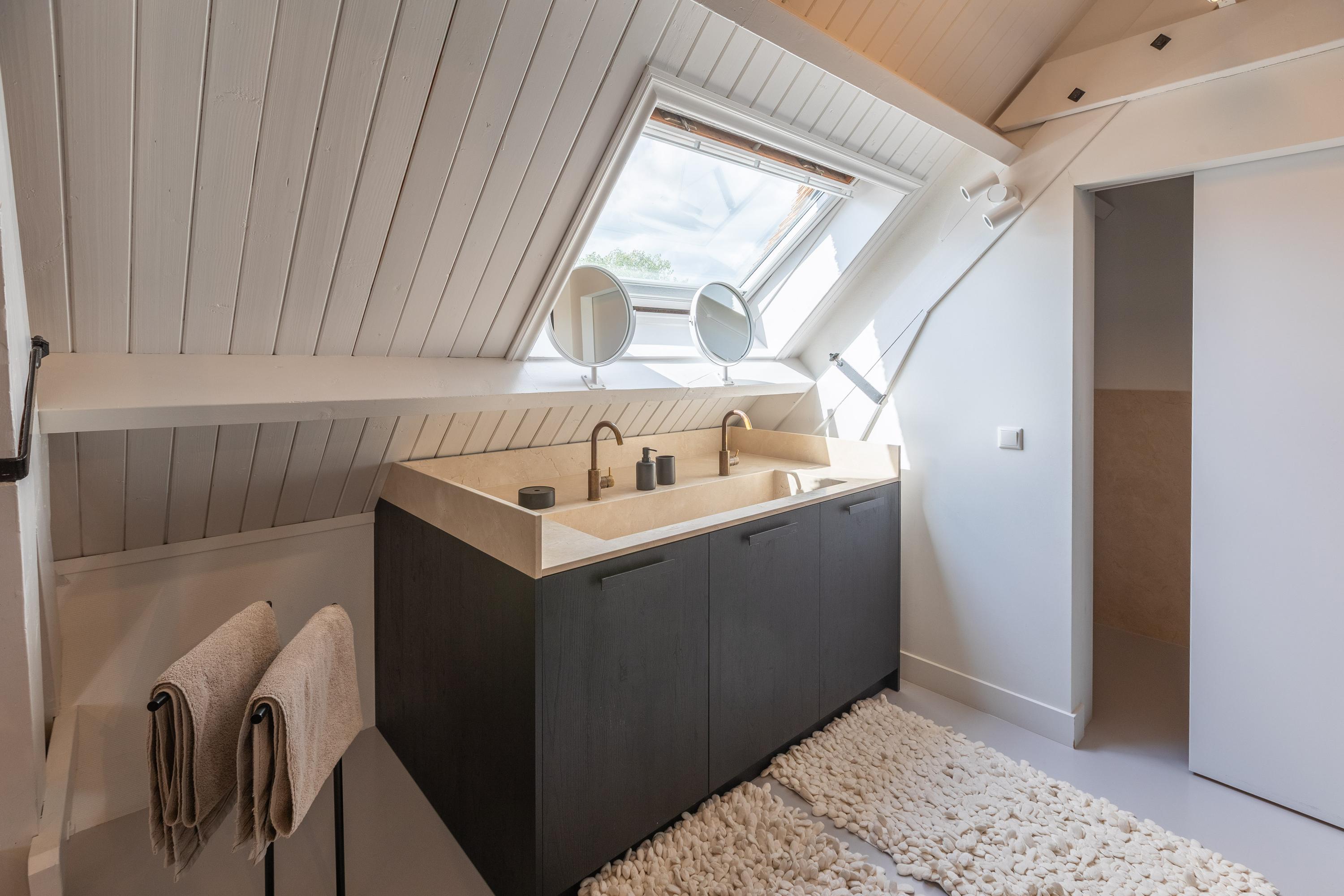 A spacious landing above the kitchen provides access to the master bedroom (approx. 65 m²) with air conditioning and characteristic wooden beams, a luxurious en-suite bathroom with freestanding bath, walk-in shower, toilet, and double sink, plus a walk-in closet with dormer window and views of the greenery of Midden-Delfland.