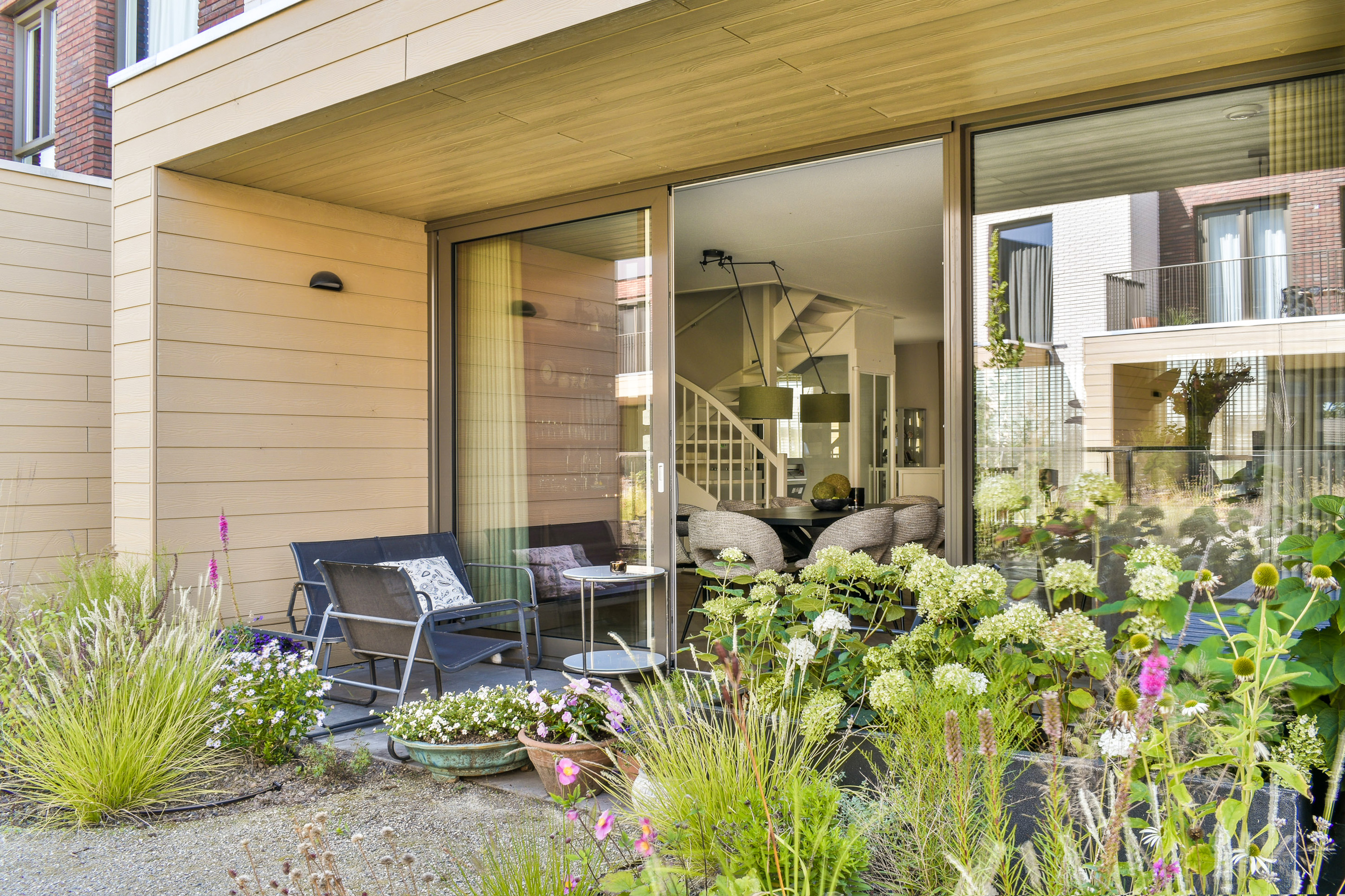 Terrace 1 (~1.71 x 4.99 m): Located at the rear and accessed via sliding glass doors. Equipped with lighting and power outlets. Overlooks a beautifully maintained shared garden.