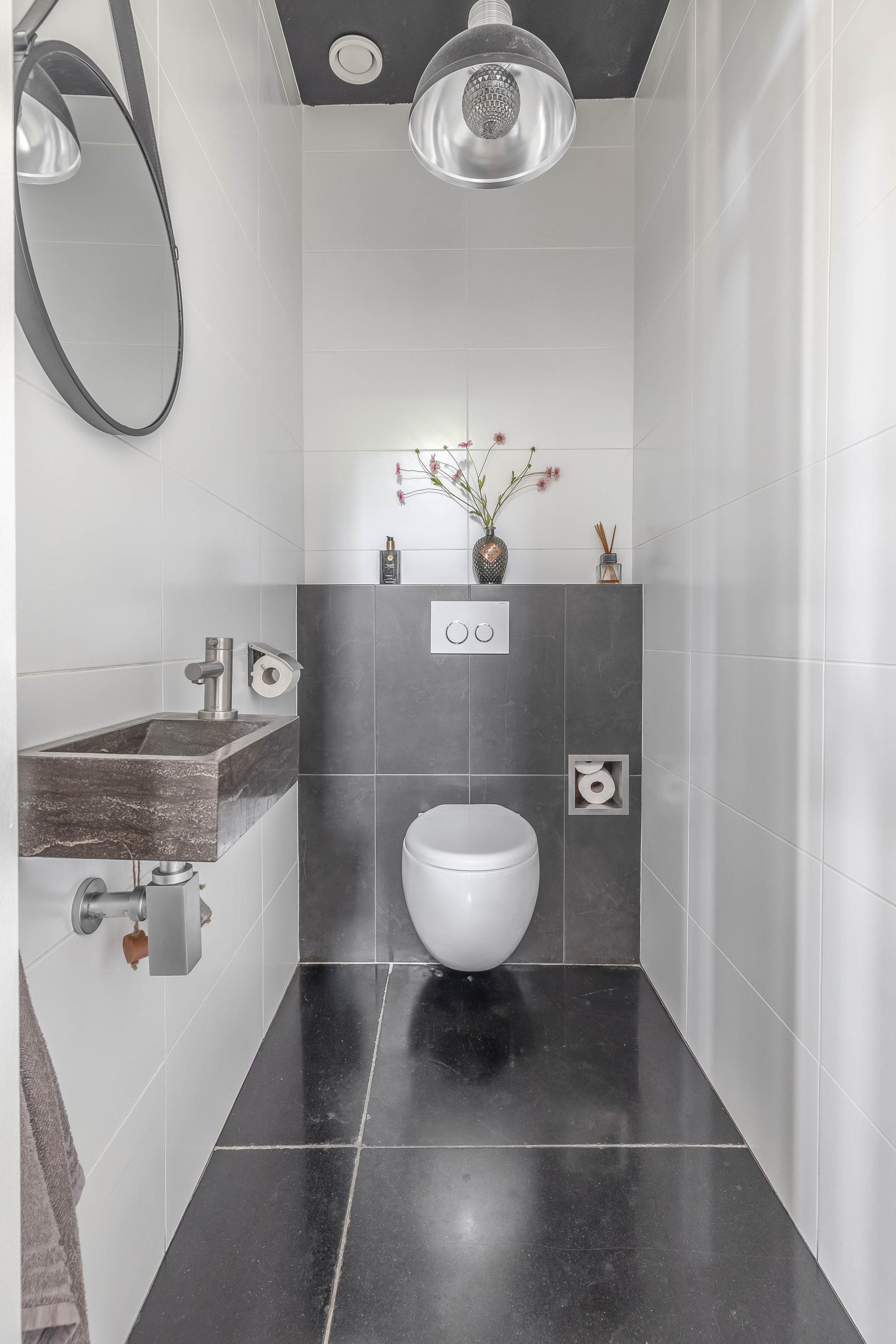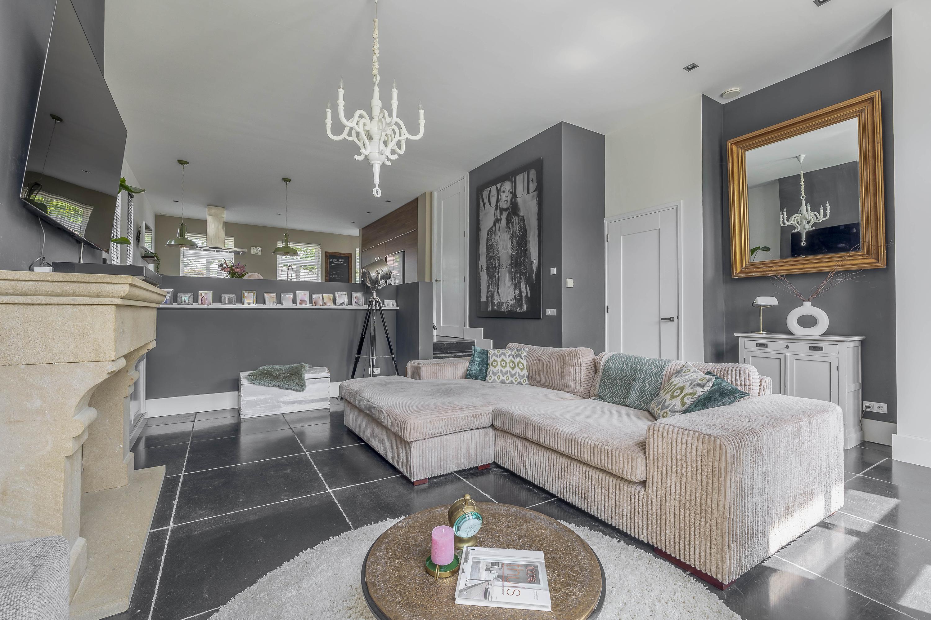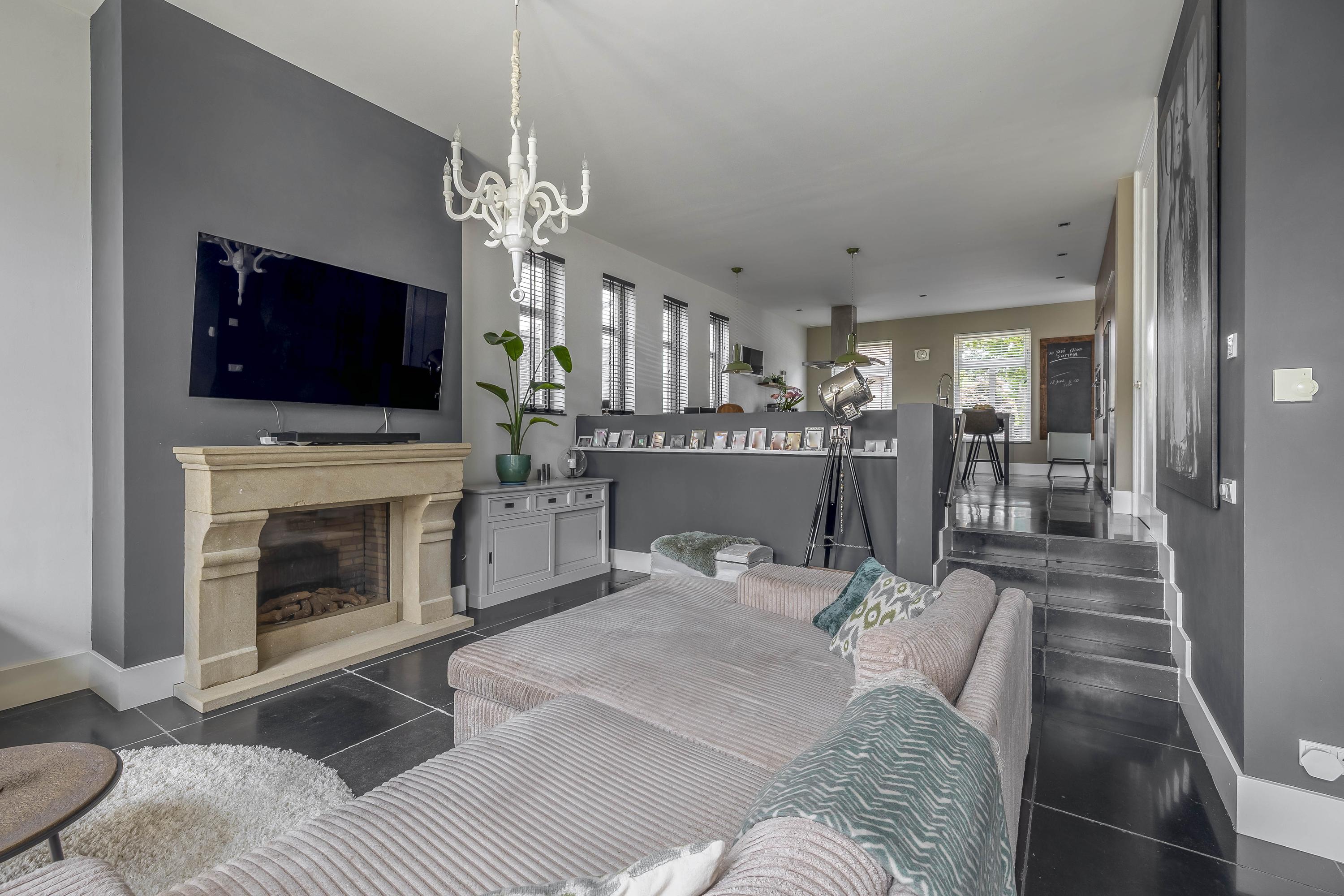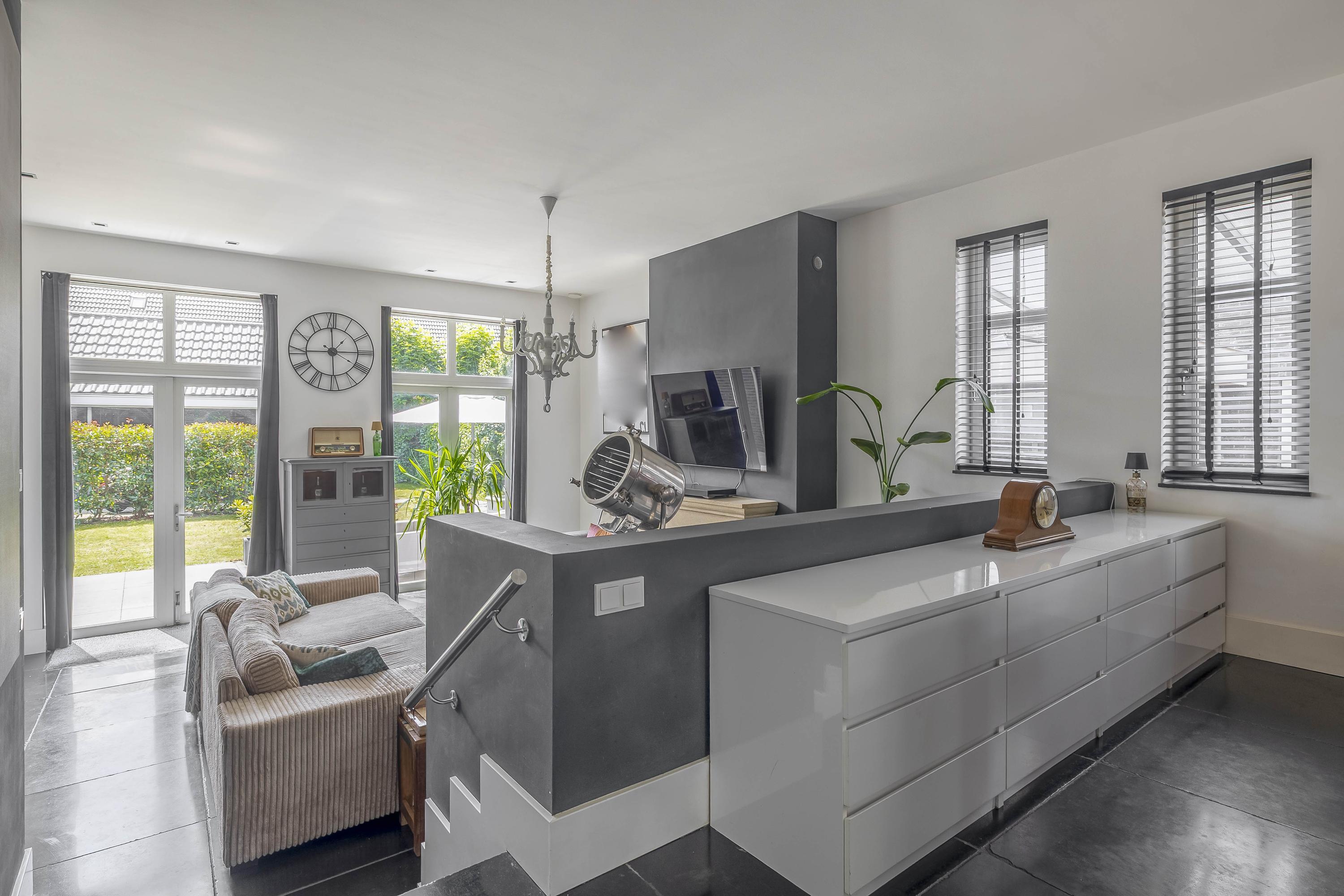 Through the spacious entrance with beautiful tiled floor, modern toilet and extensive meter cupboard, you enter the kitchen at the front of the house. This stylish and complete kitchen is the heart of the house and features a kitchen island, luxury appliances and plenty of workspace. Thanks to the raised floor level, you have a beautiful view of the street.
