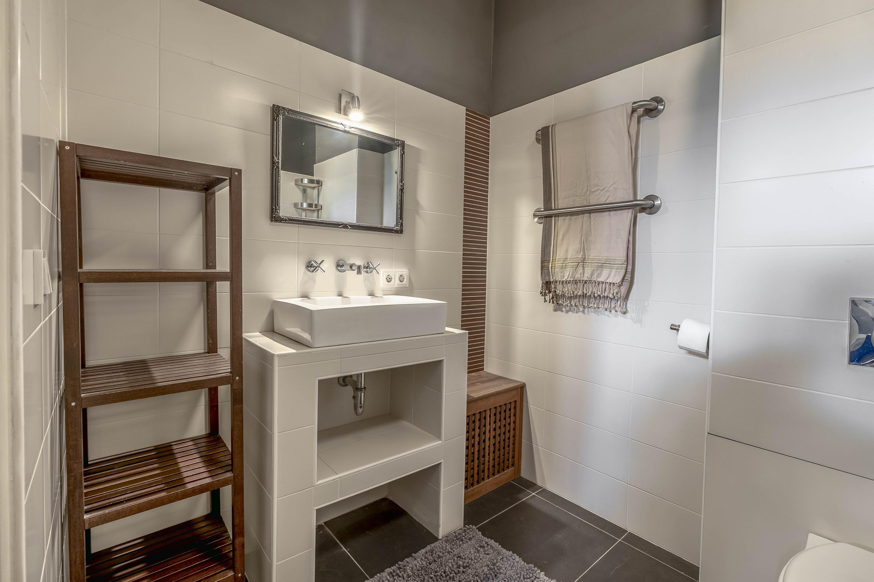 The partially tiled bathroom is equipped with a walk-in shower, wall closet and a washbasin shelf with basin.