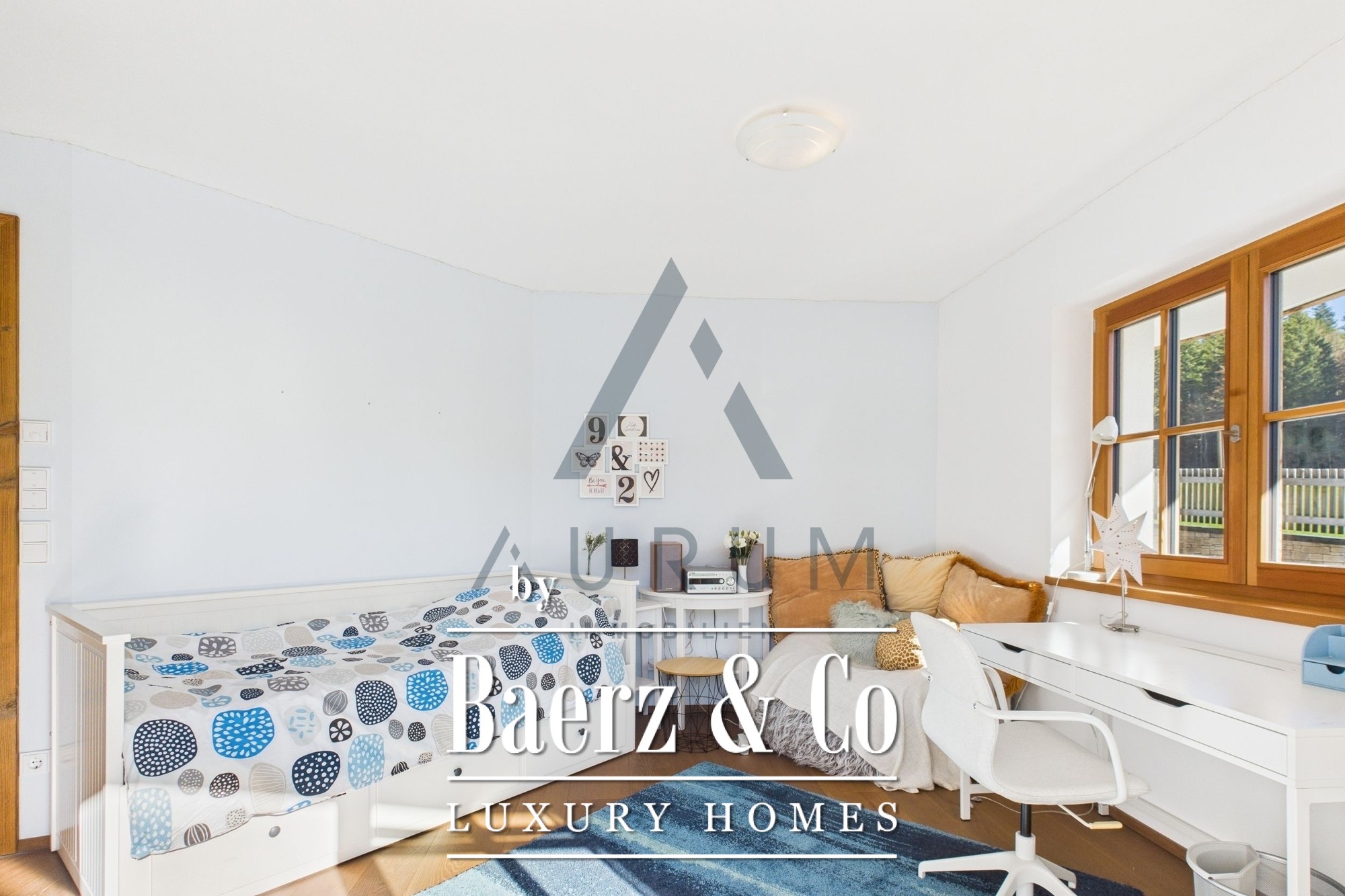 Within its 241 m² living area and 314 m² total usable space, four bedrooms and three bathrooms are complemented by two guest WCs, an office, and a wellness suite featuring a Klafs sauna with sanarium function. The open living, dining, and kitchen zone is underscored by exposed reclaimed wood roof trusses, an open fireplace, and seamless flow onto 172 m² of terraces and balconies. Finishes include oak flooring, electric blinds, and a fitted kitchen equipped with appliances from Gaggenau, Miele, and Bora.