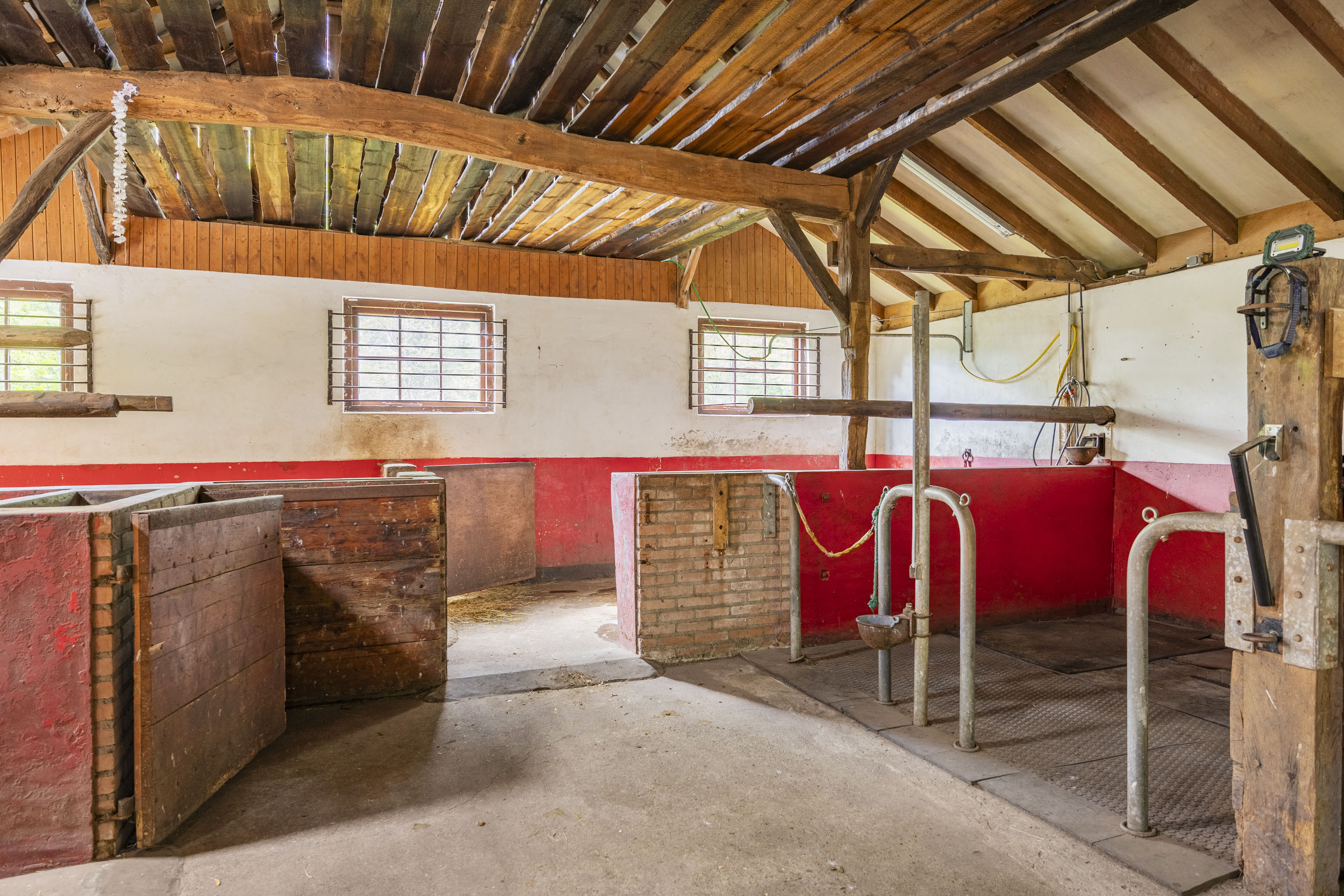 The back of the farmhouse remains structurally original, featuring beautiful wooden beams and a traditional stable door (the so called ‘niendeur’). Where cows once stood, there are now five horse stables, a tack room and additional facilities including an office, shower and laundry connections.