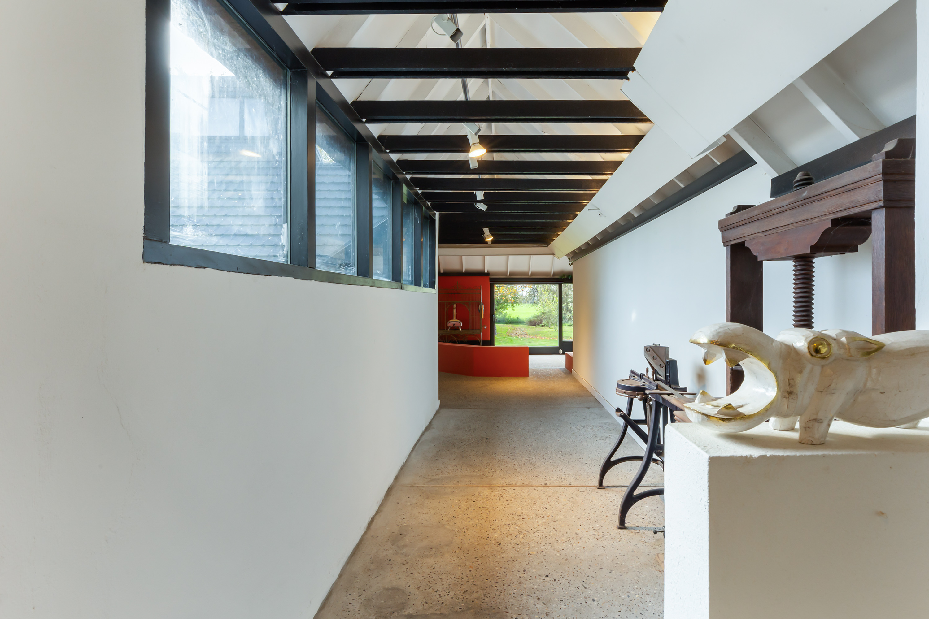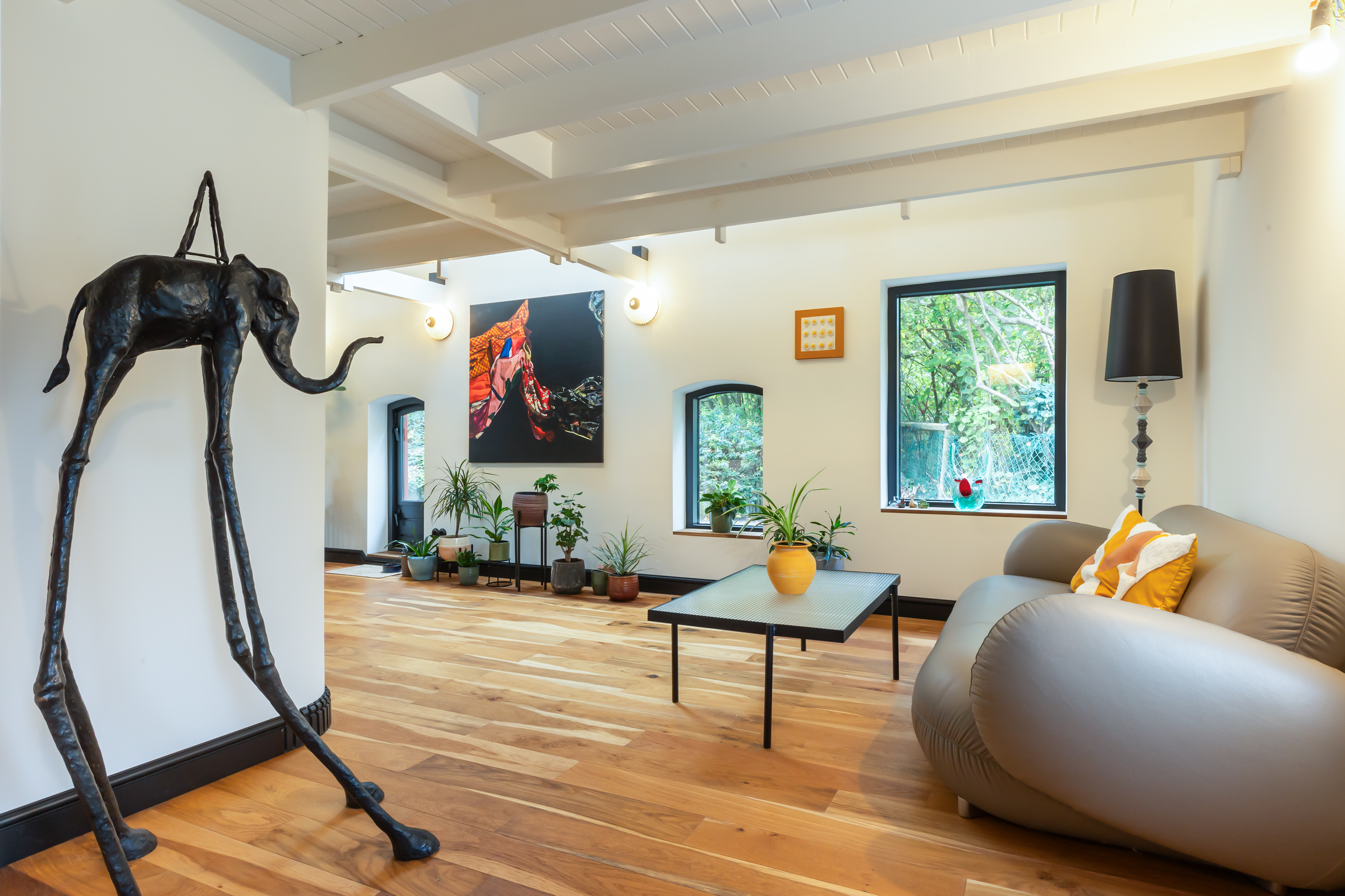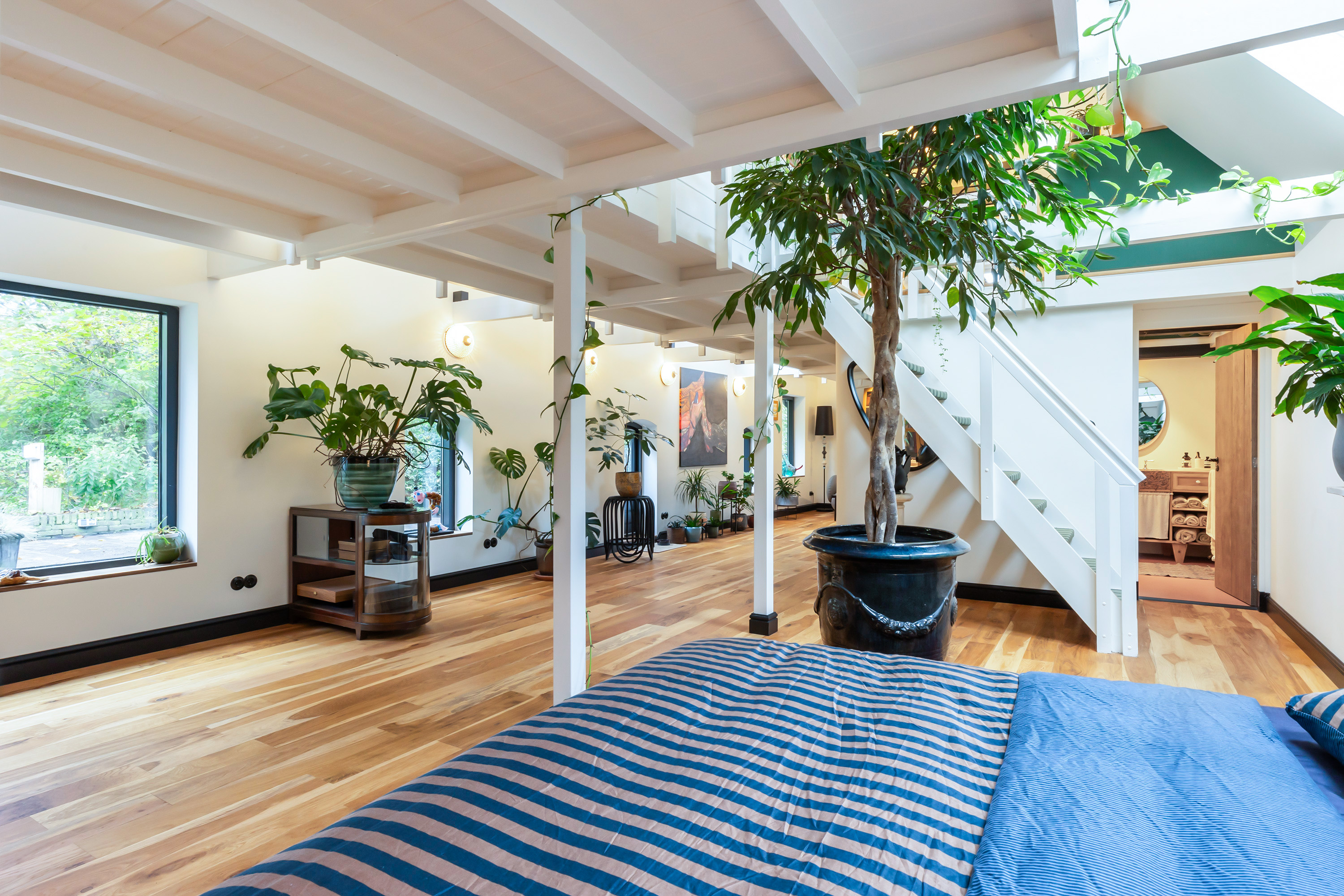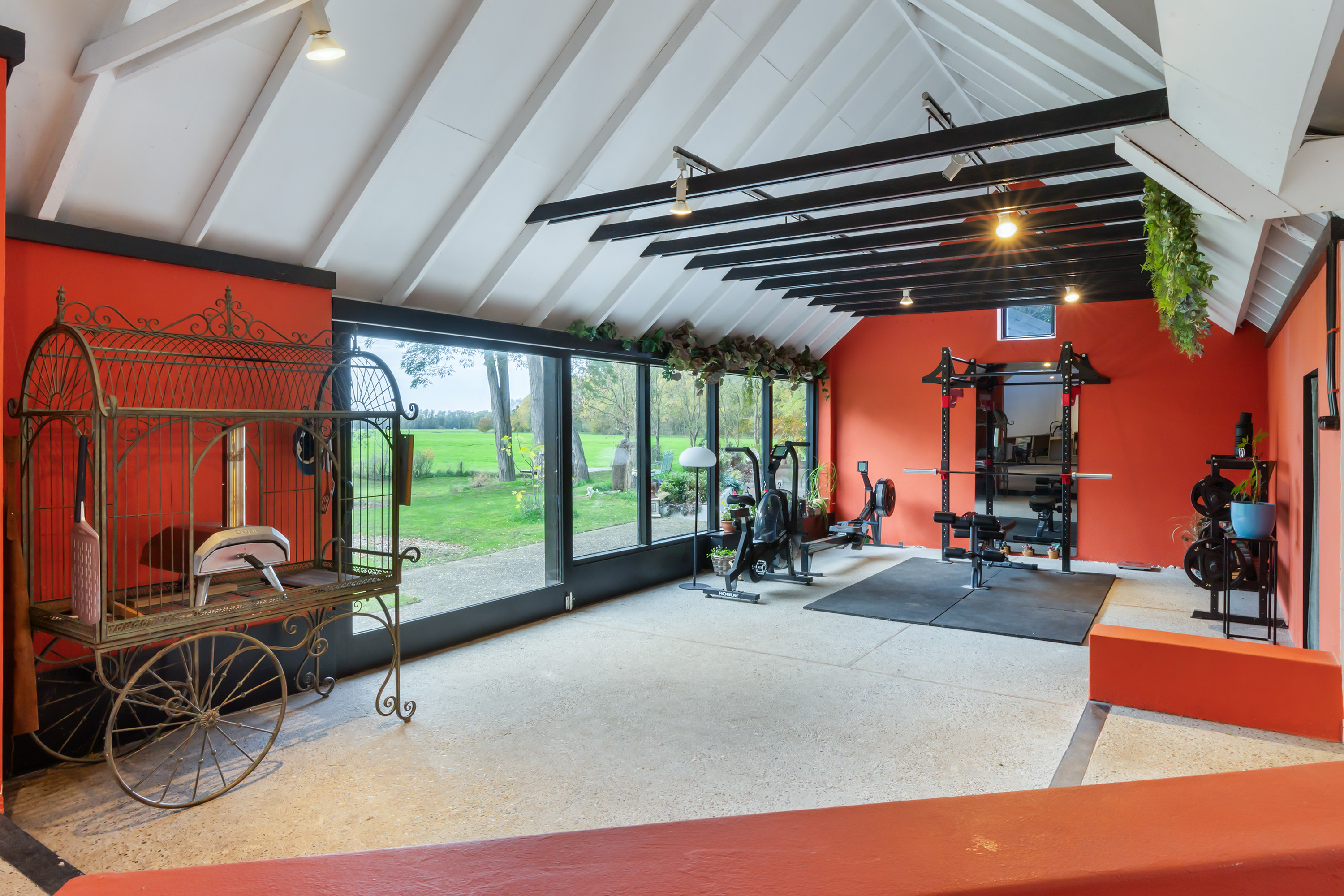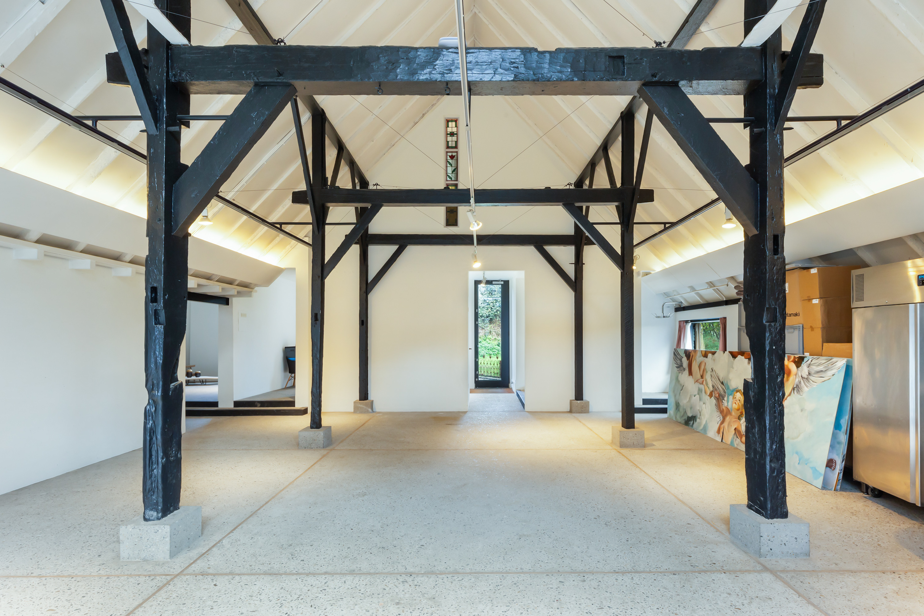 The adjoining commercial space offers further scope for atelier, showroom or guest accommodation, its black timber trusses and generous windows showcasing craftsmanship and presence. Outside, the garden merges with farmland and includes a gazebo, floating terrace and secluded deck, offering a sanctuary of privacy. Mature trees and thoughtful landscaping enhance the sense of calm.