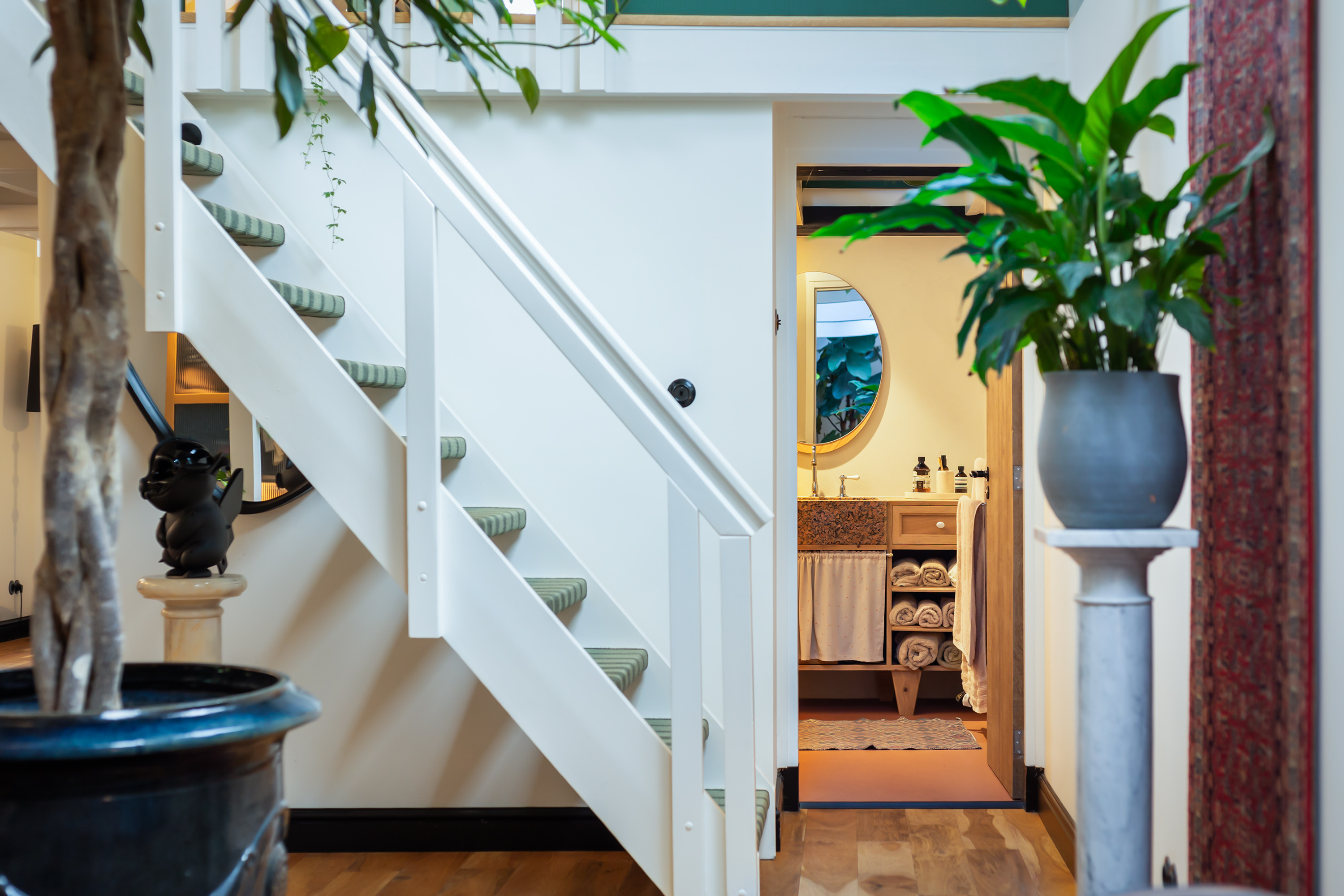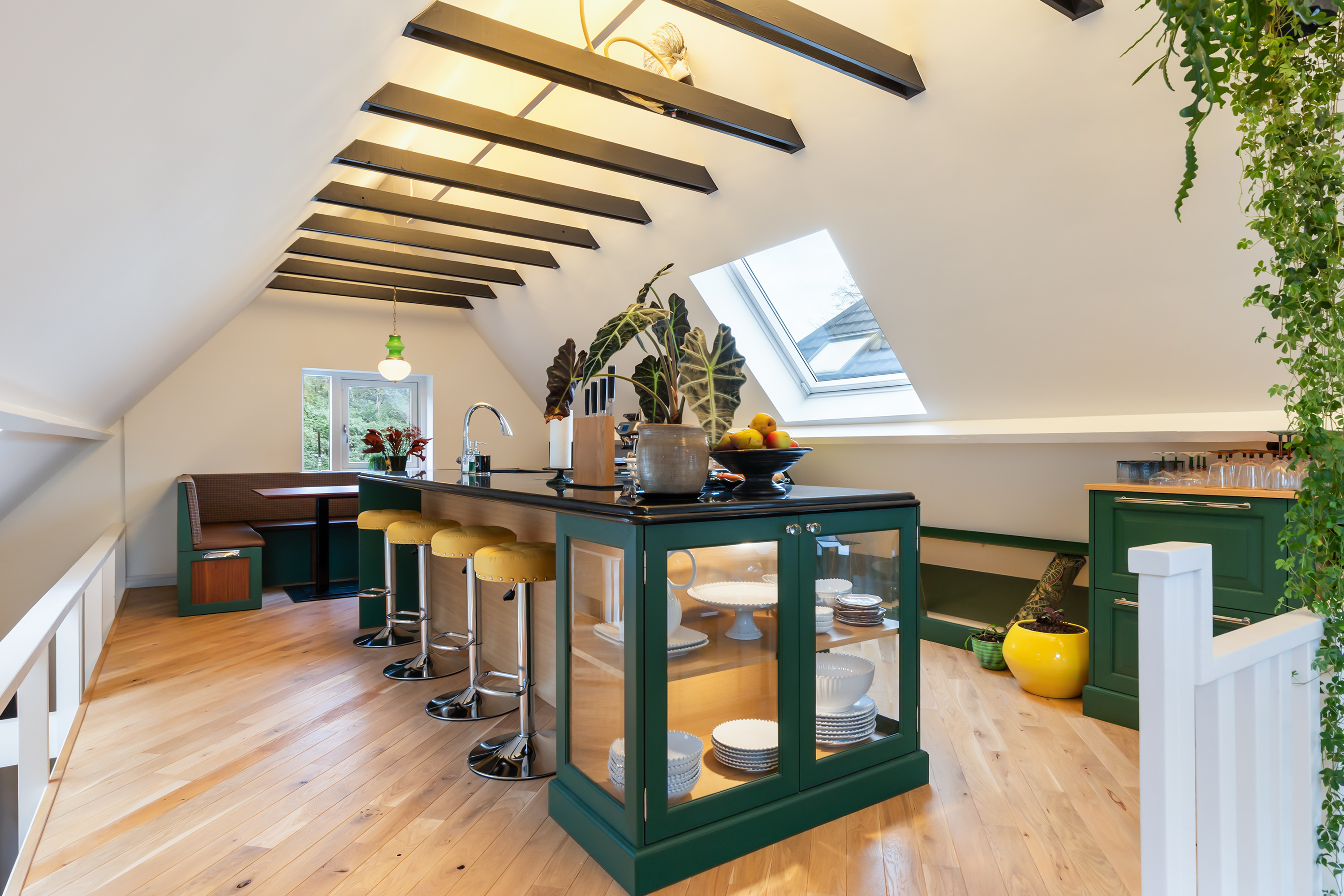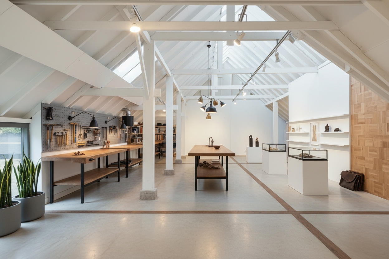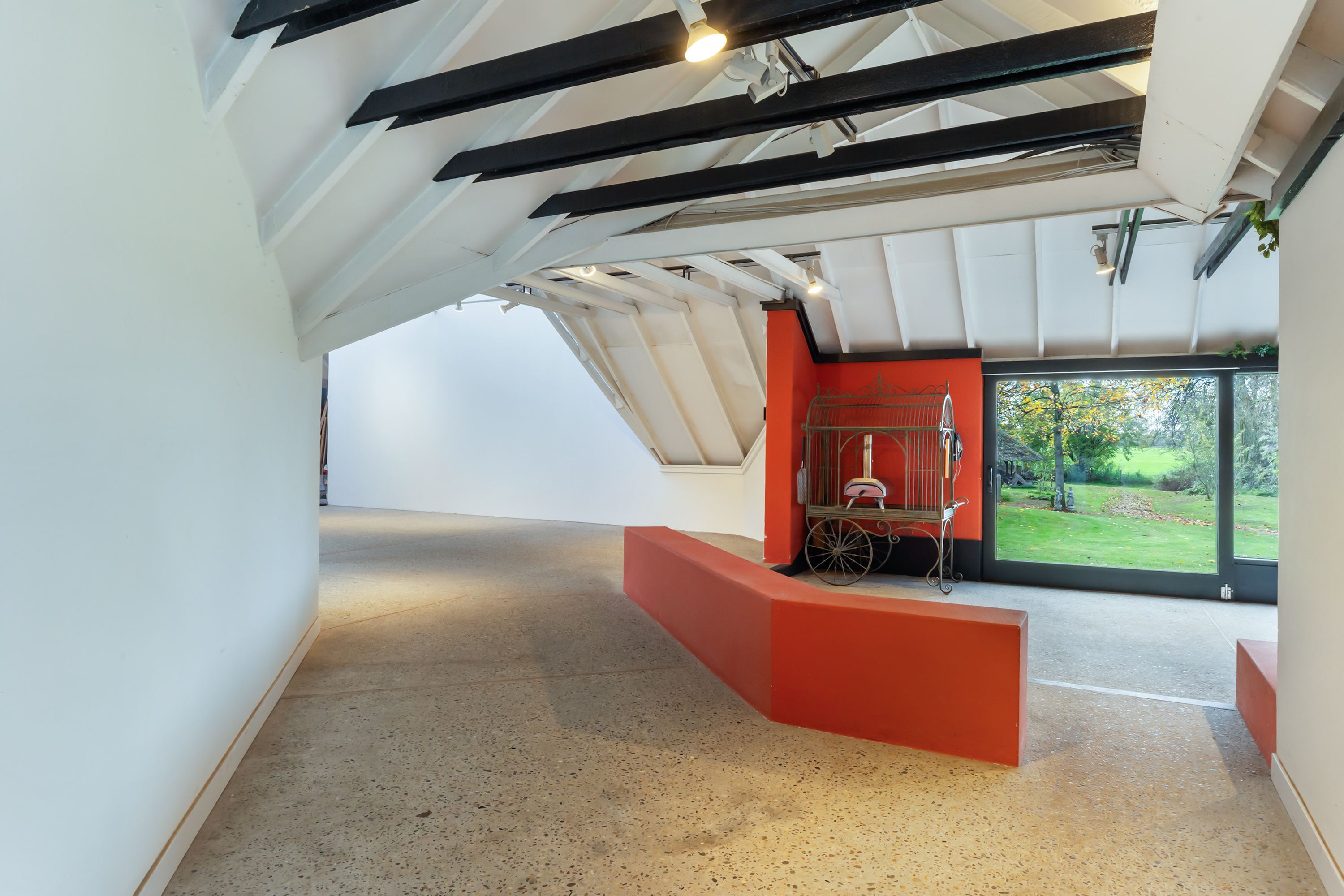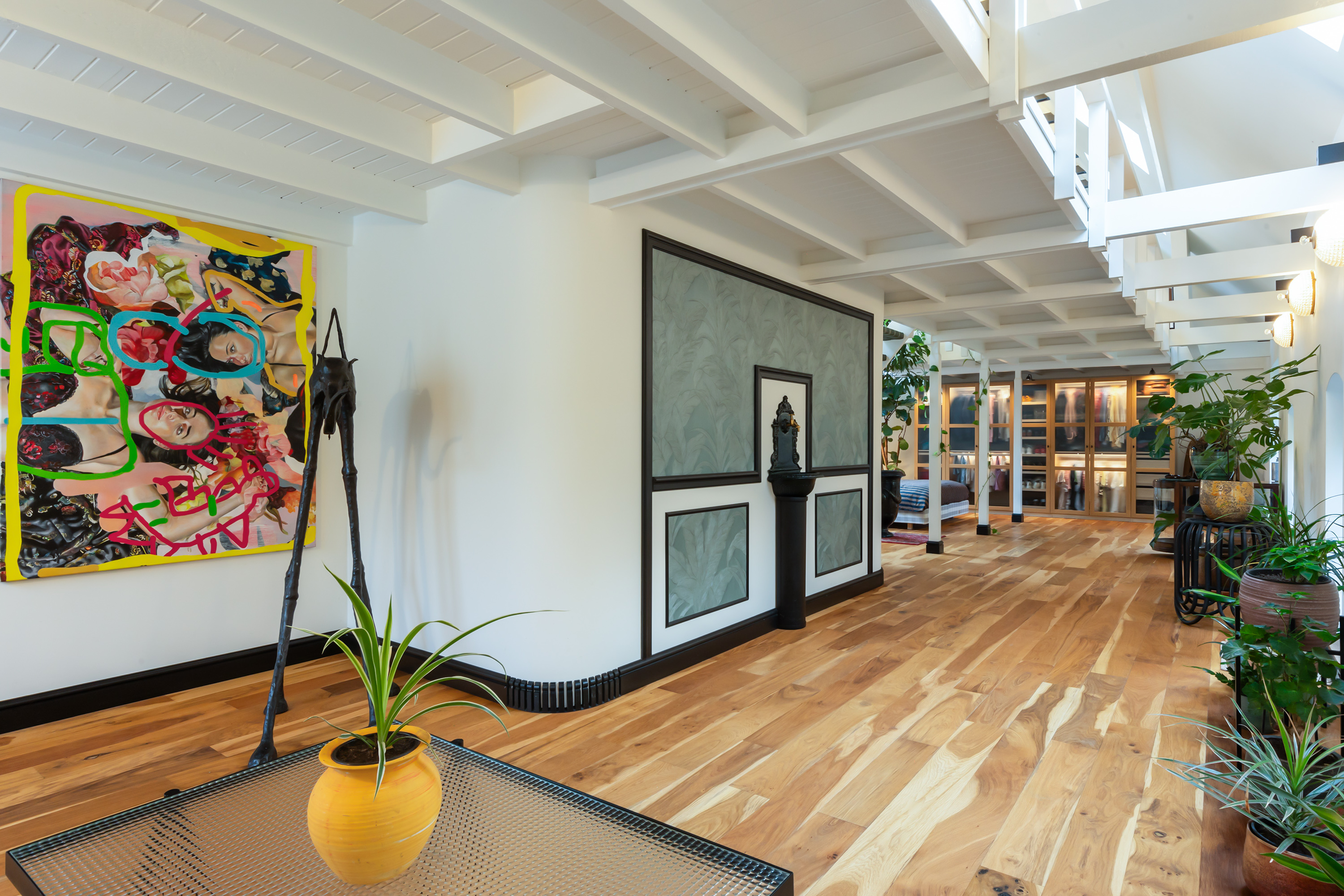 The adjoining commercial space offers further scope for atelier, showroom or guest accommodation, its black timber trusses and generous windows showcasing craftsmanship and presence. Outside, the garden merges with farmland and includes a gazebo, floating terrace and secluded deck, offering a sanctuary of privacy. Mature trees and thoughtful landscaping enhance the sense of calm.