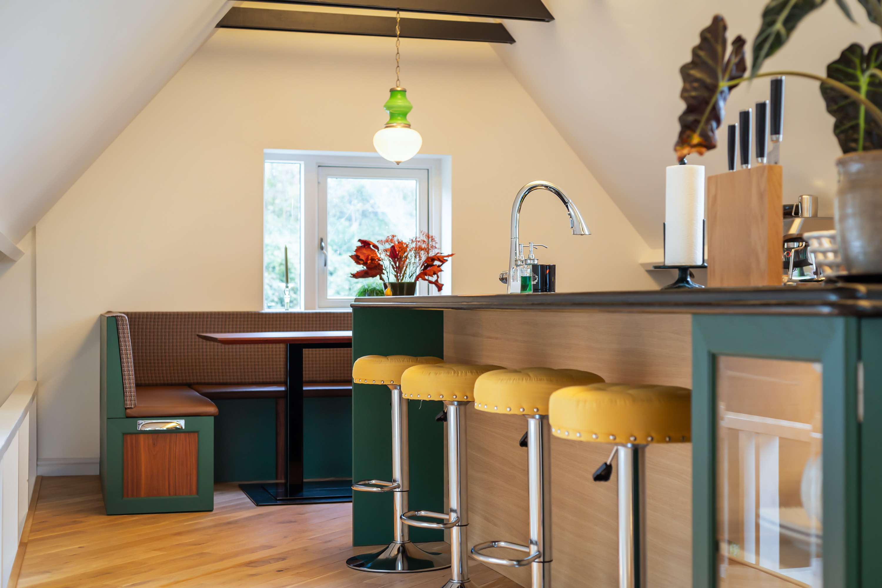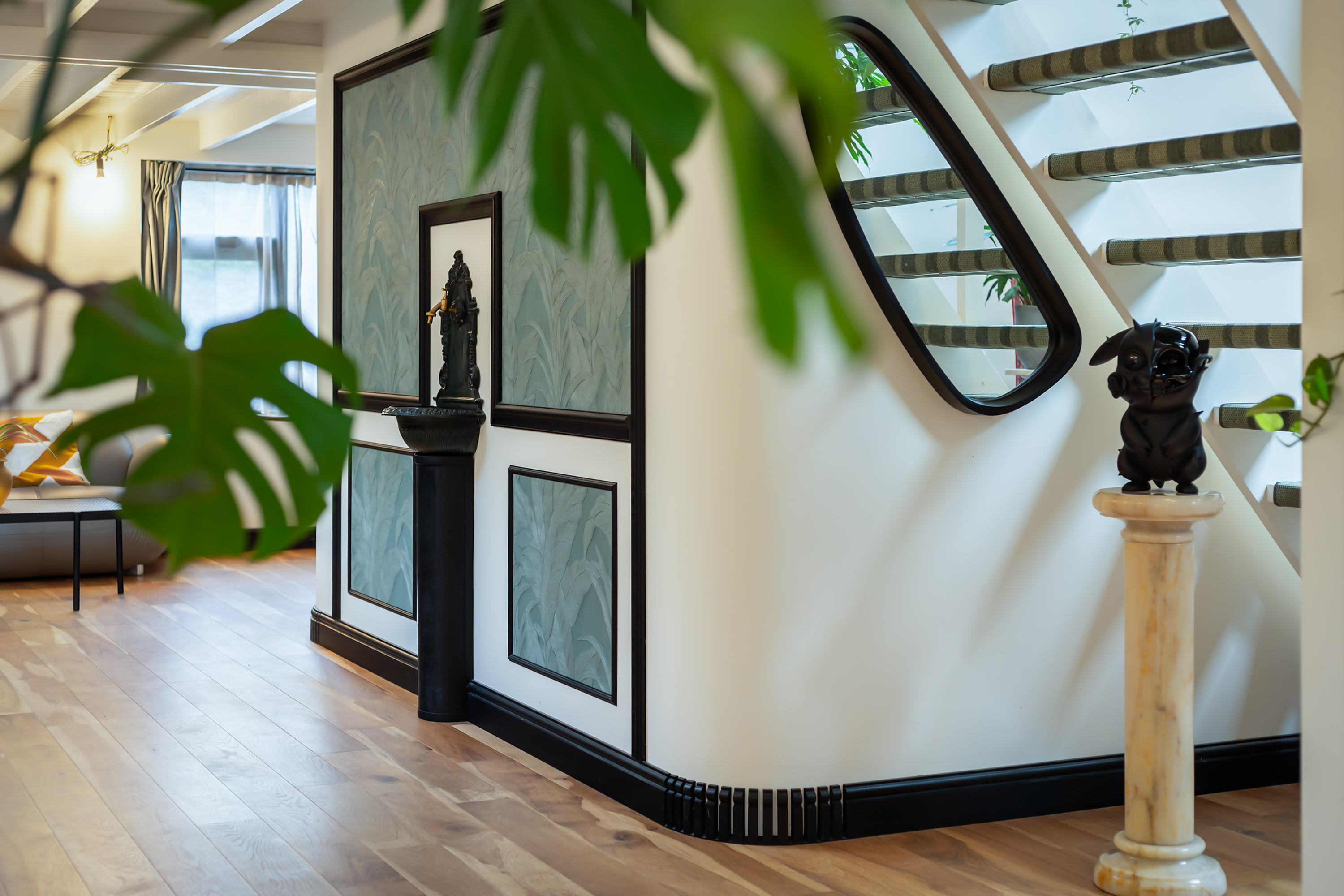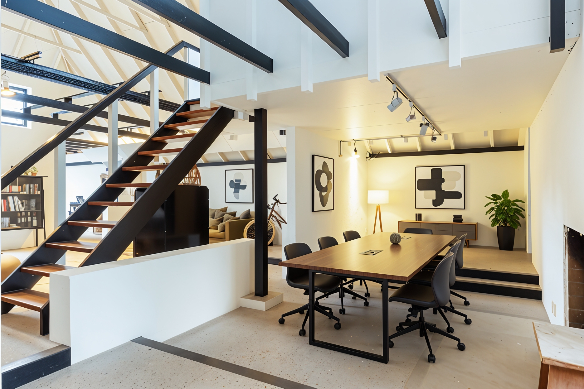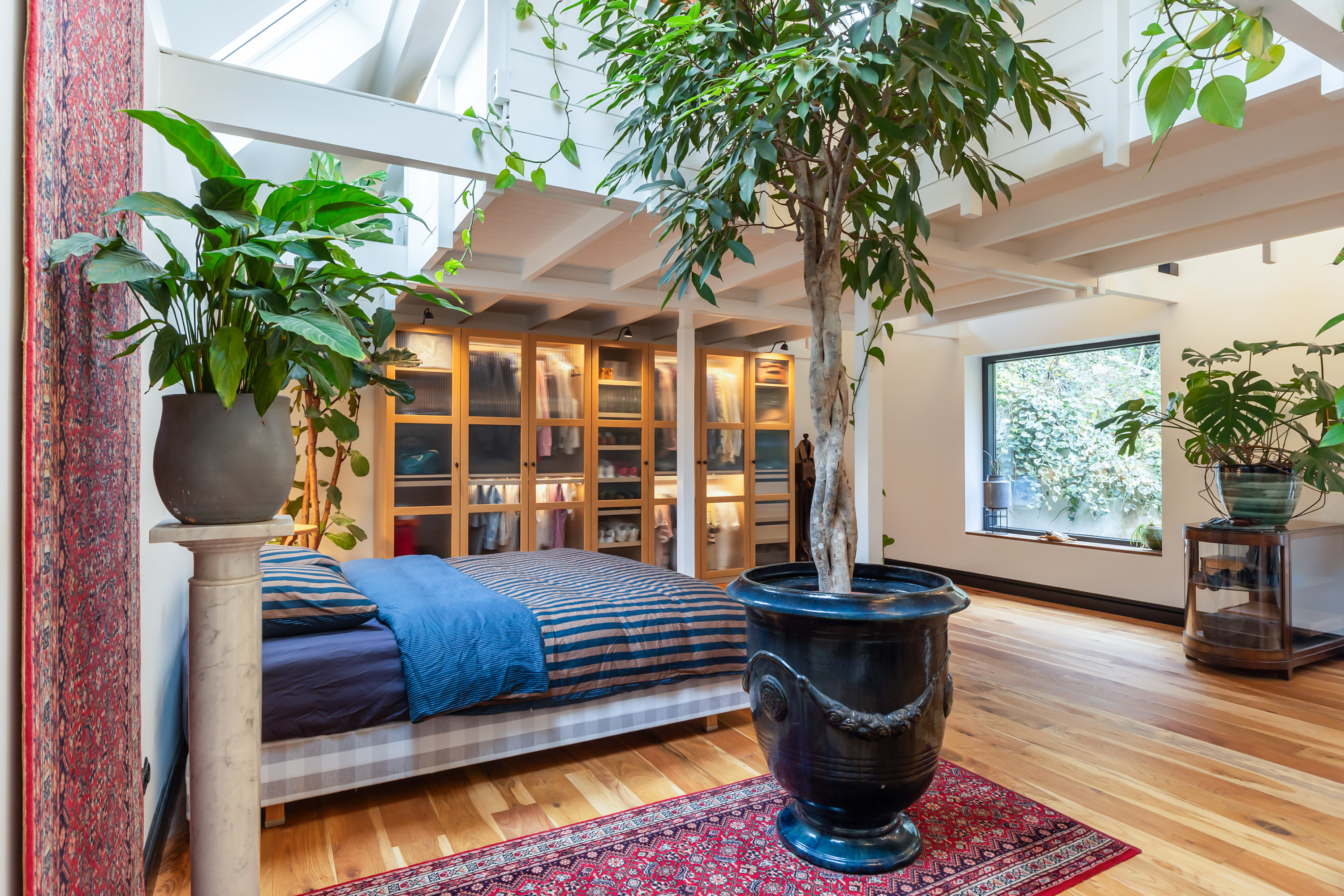 The adjoining commercial space offers further scope for atelier, showroom or guest accommodation, its black timber trusses and generous windows showcasing craftsmanship and presence. Outside, the garden merges with farmland and includes a gazebo, floating terrace and secluded deck, offering a sanctuary of privacy. Mature trees and thoughtful landscaping enhance the sense of calm.