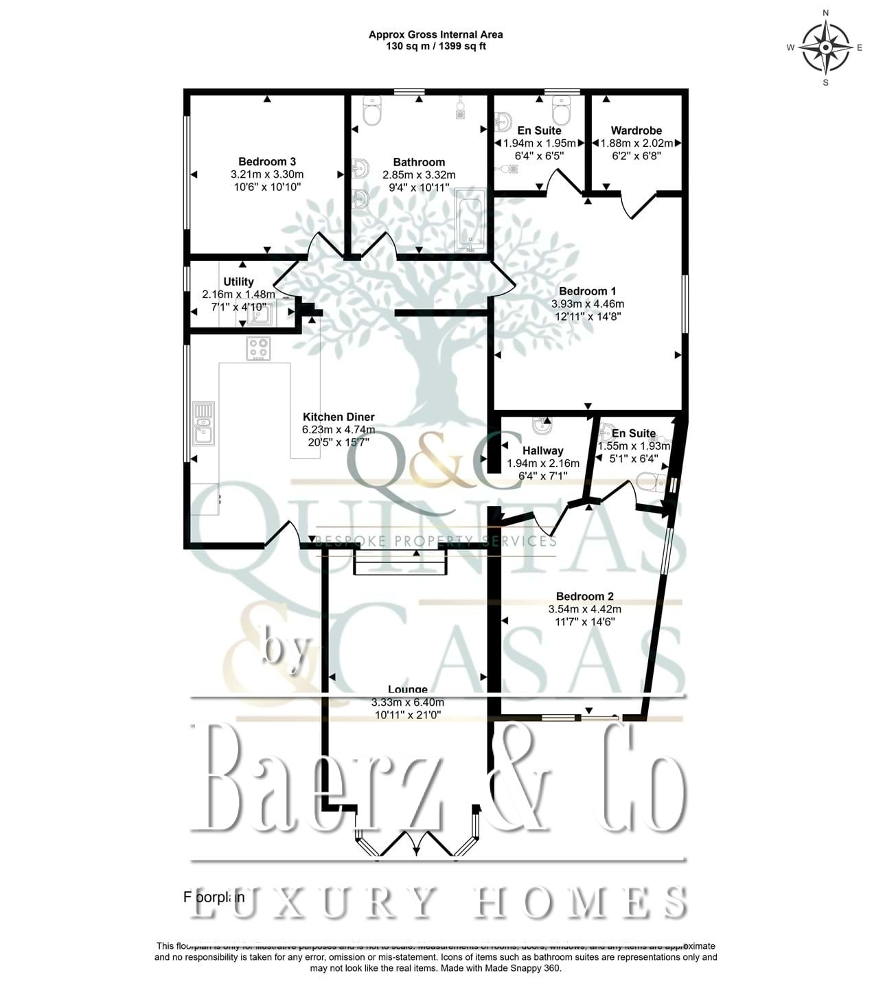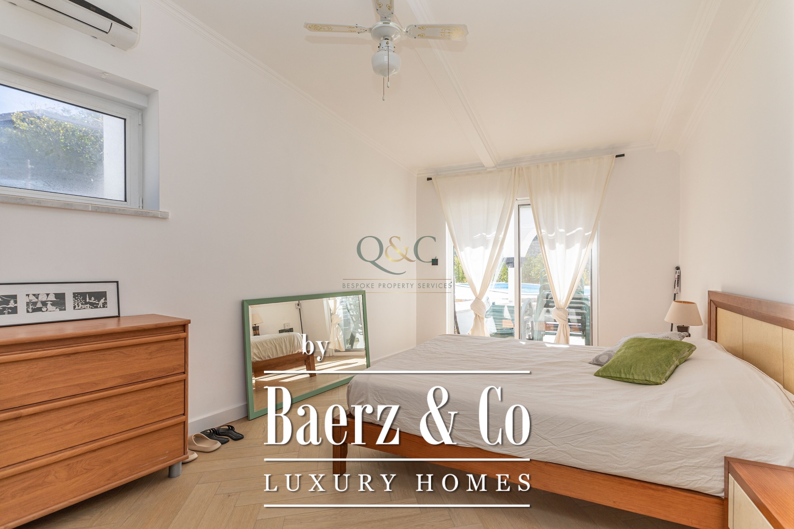 There are three generous double bedrooms, including two with recently refurbished en-suite bathrooms. The primary suite features a walk-in wardrobe and dressing area, while the third bedroom offers double doors leading straight to the swimming pool terrace. A large family bathroom includes a bath, substantial walk-in shower, and double vanity. Utility needs are met with a dedicated laundry room, storage spaces, and an equipped kitchen.