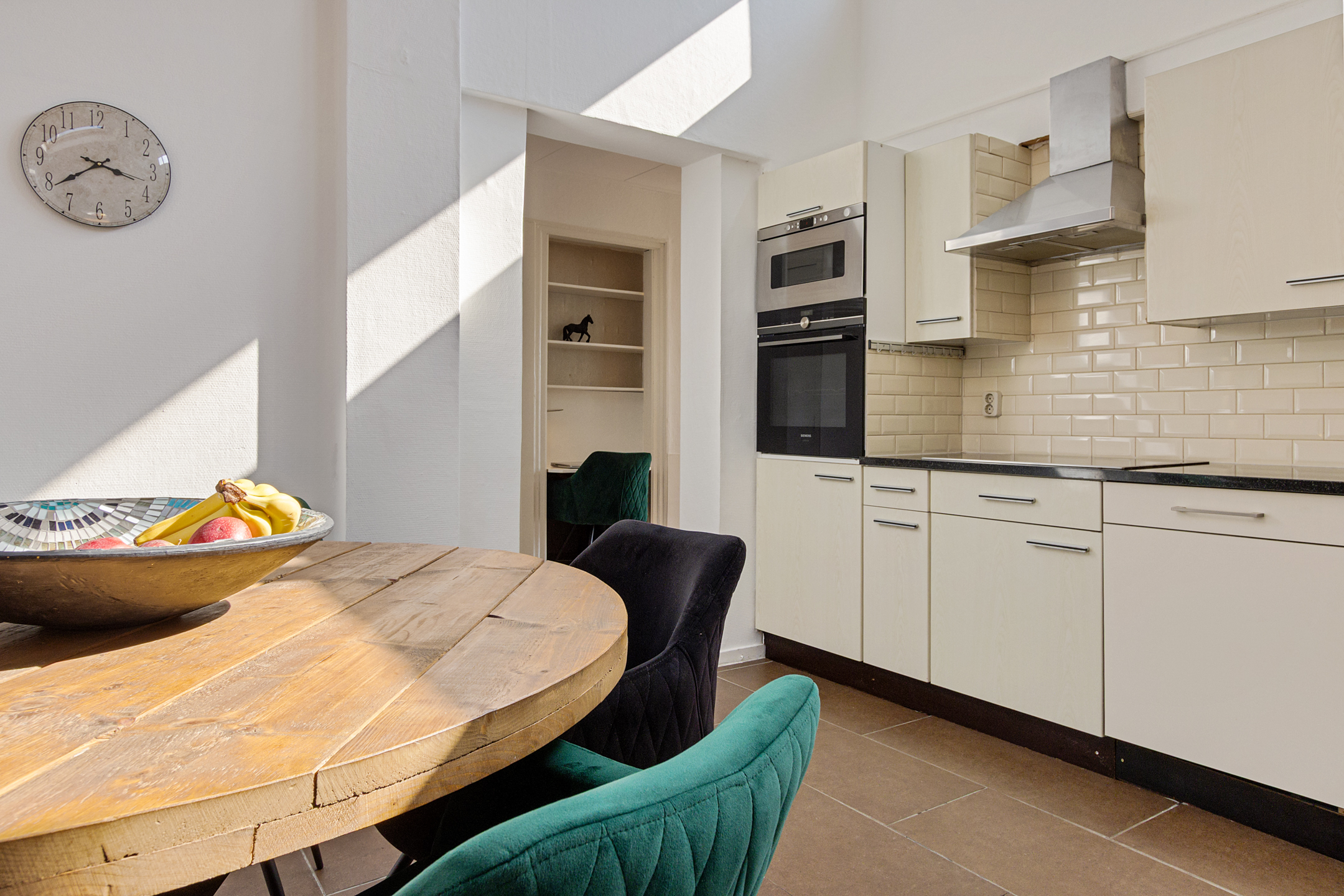 The cosy kitchen is finished in light tones and equipped with appliances from 2024.
