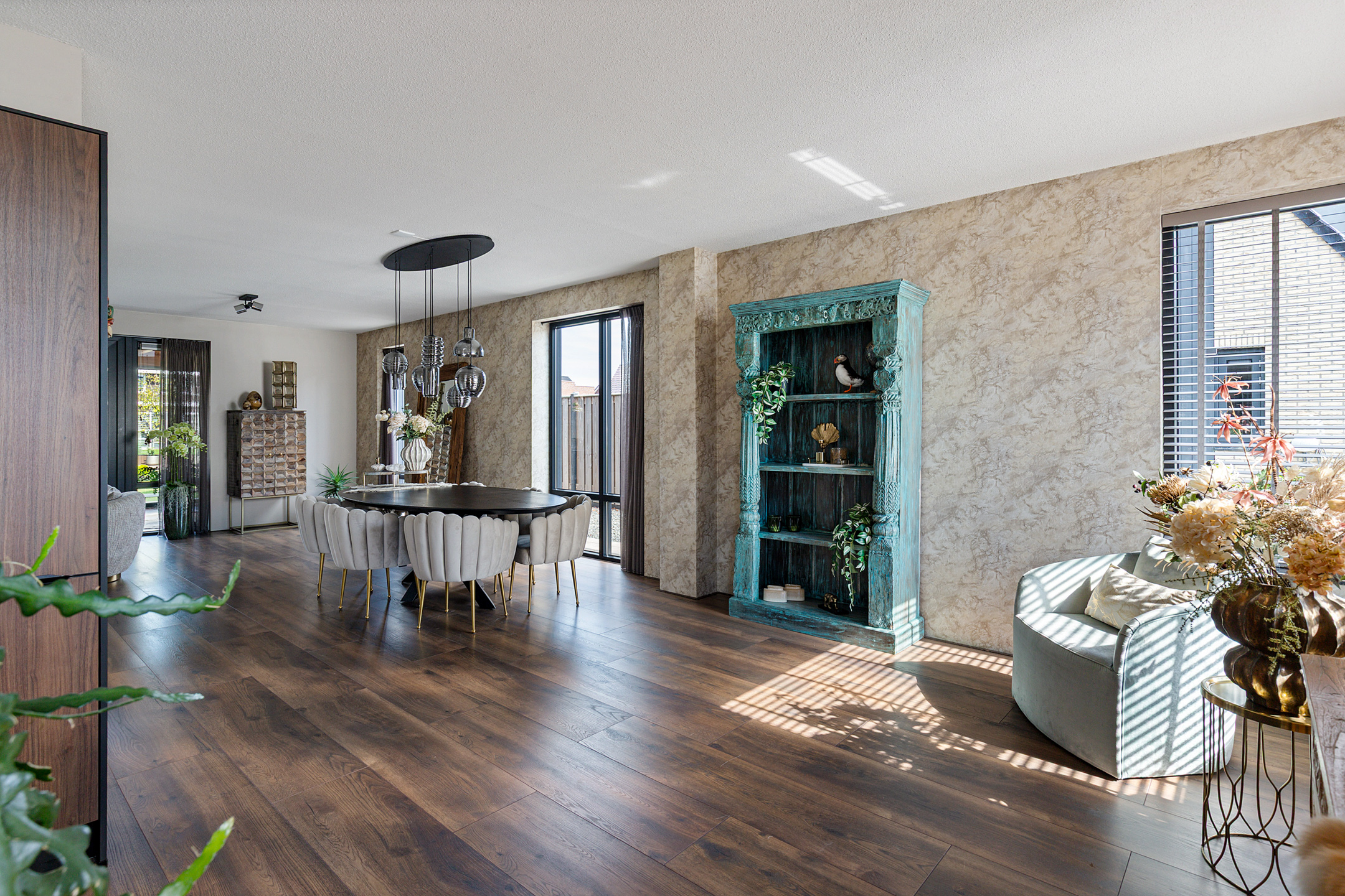 The utility room houses the advanced heat pump system with 190-litre boiler and laundry connections. The whisper-quiet air-source heat pump is discreetly placed outside. Throughout the ground floor, a refined laminate floor with underfloor heating and cooling ensures both style and comfort.