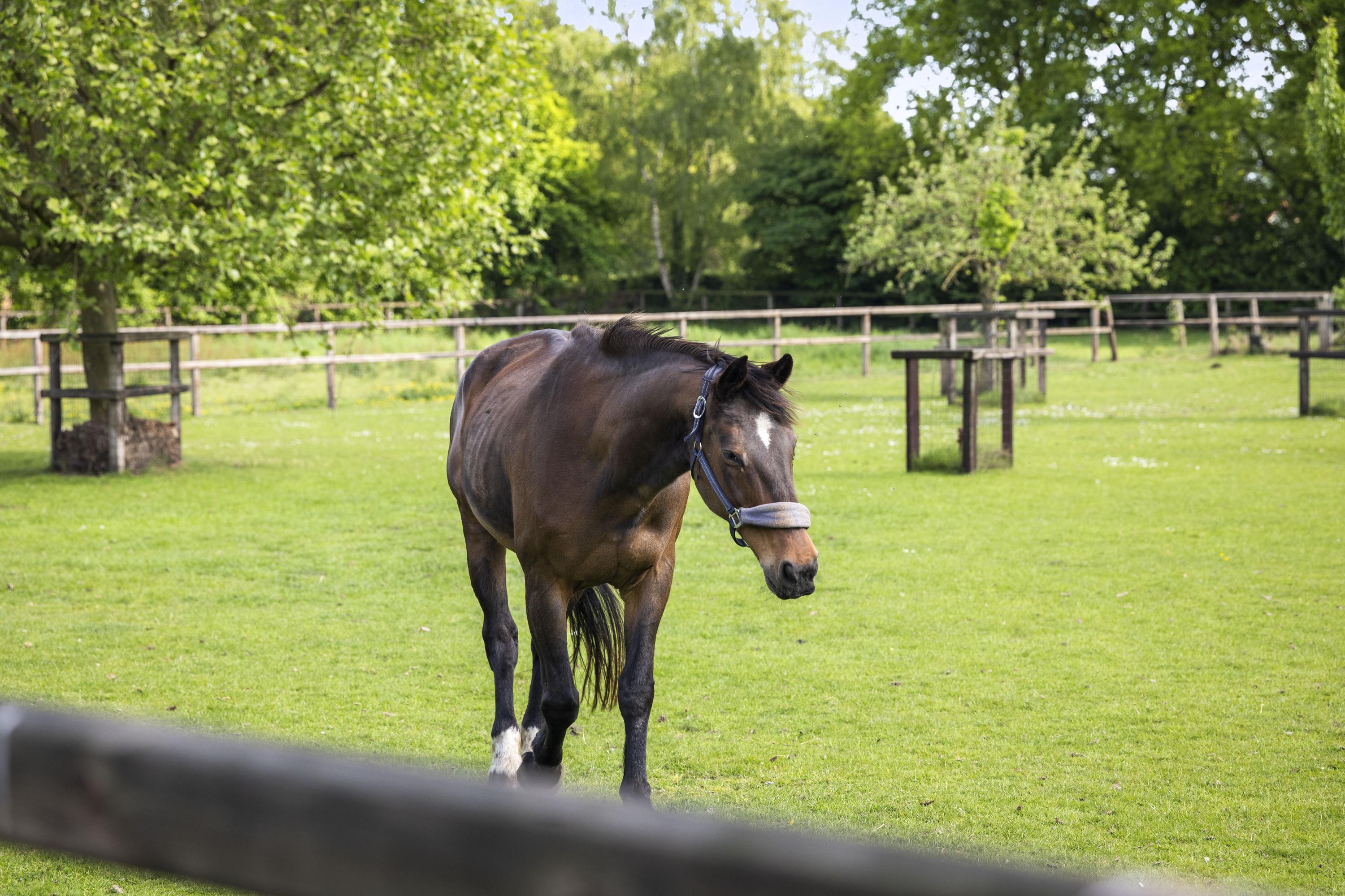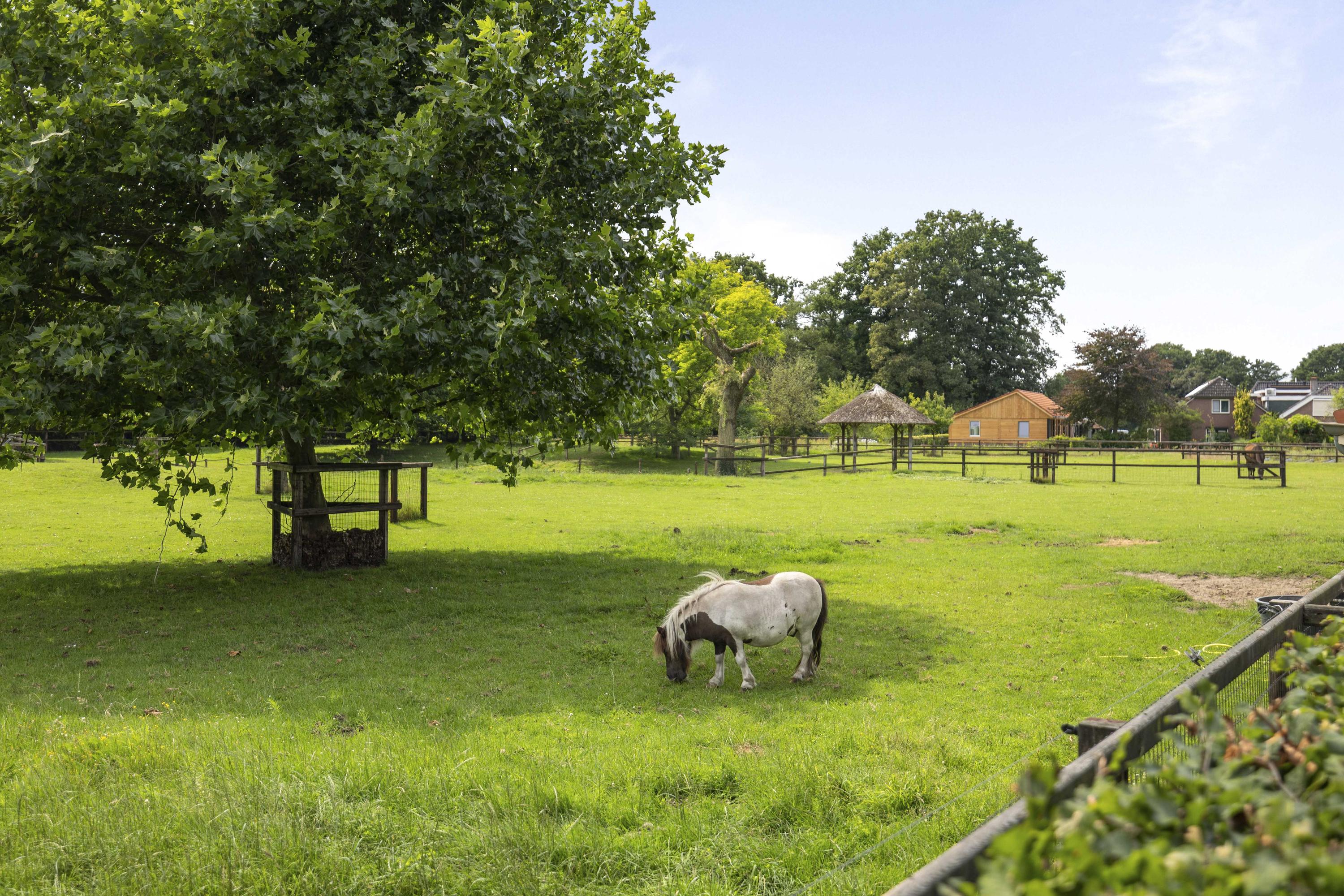 At the rear of the garden is the orchard with a four-legged haystack. The solar panels are also located here. This part of the grounds is divided into two paddocks with a shallow pond in between.