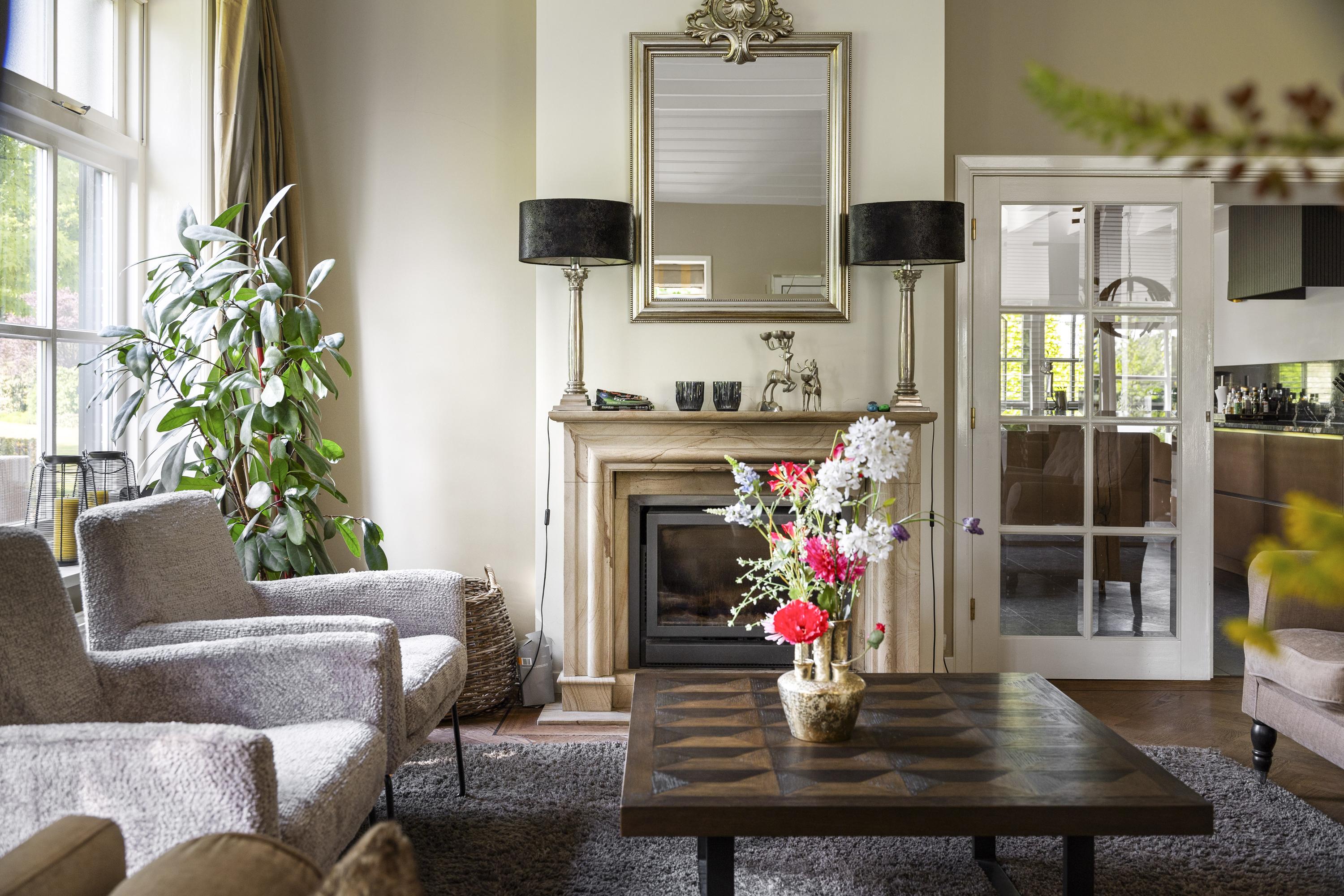 On the right is the kitchen, the beating heart of this house. The design is truly beautiful: traditional craftsmanship by Lodder Keukens from Barneveld, equipped with all modern conveniences. Every door, drawer, and function has been carefully considered. The kitchen has an L-shaped layout and is very spacious, so there is plenty of work space and room for all your guests at the large dining table.