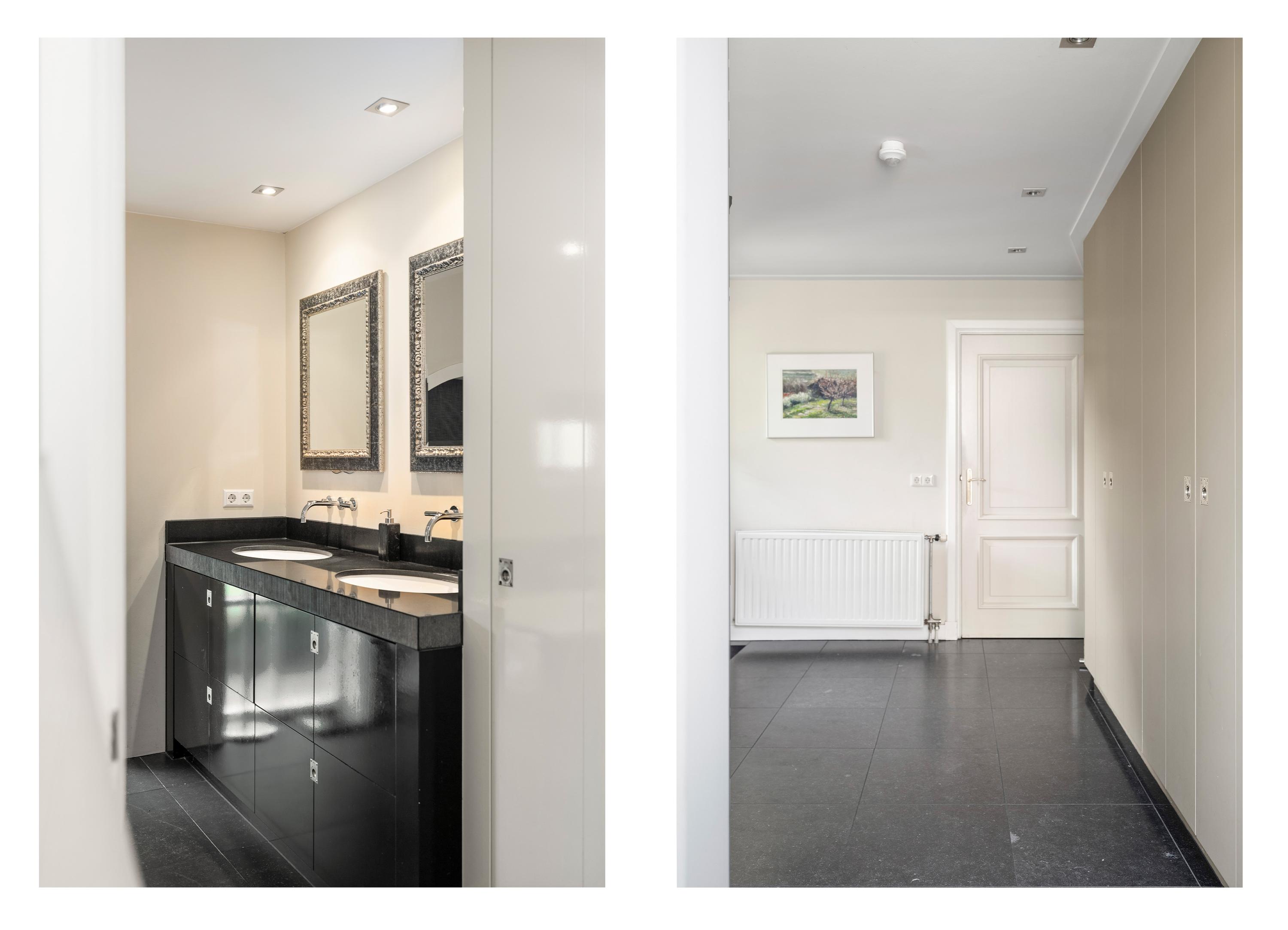 The fronts are copper-colored, which creates a beautiful interplay with the marble countertops and the sleek appliance wall. The kitchen is equipped with built-in appliances such as a dishwasher, refrigerator, and freezer. Furthermore, there is an induction hob (90 cm), a coffee machine (Gaggenau), a 4-in-1 boiling water tap (Quooker), and a generous wine climate cabinet (Liebherr).