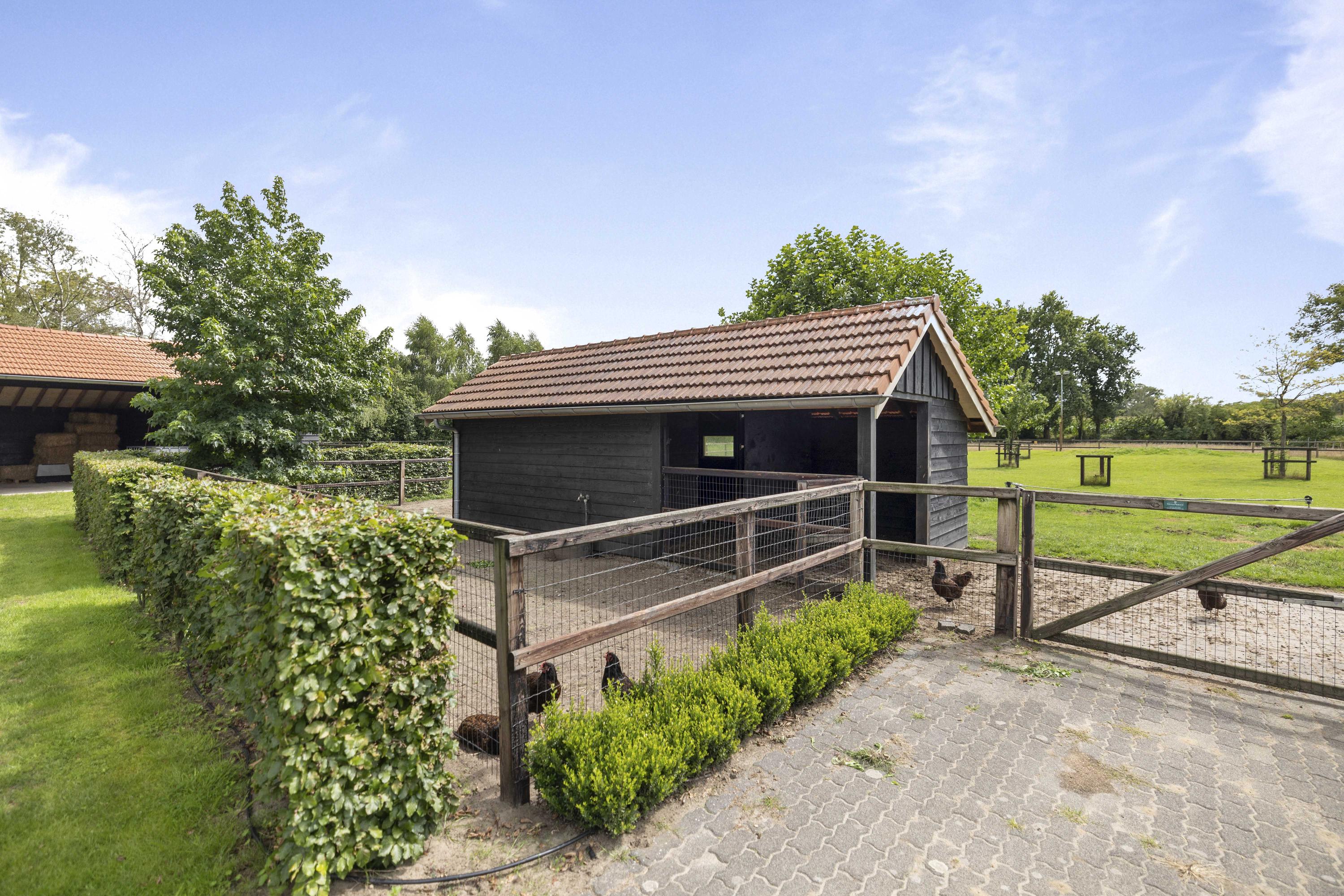There is also a classic chicken coop—made of black rebated cladding with a red roof—with two stalls, a storage room, and a shelter for the horses.