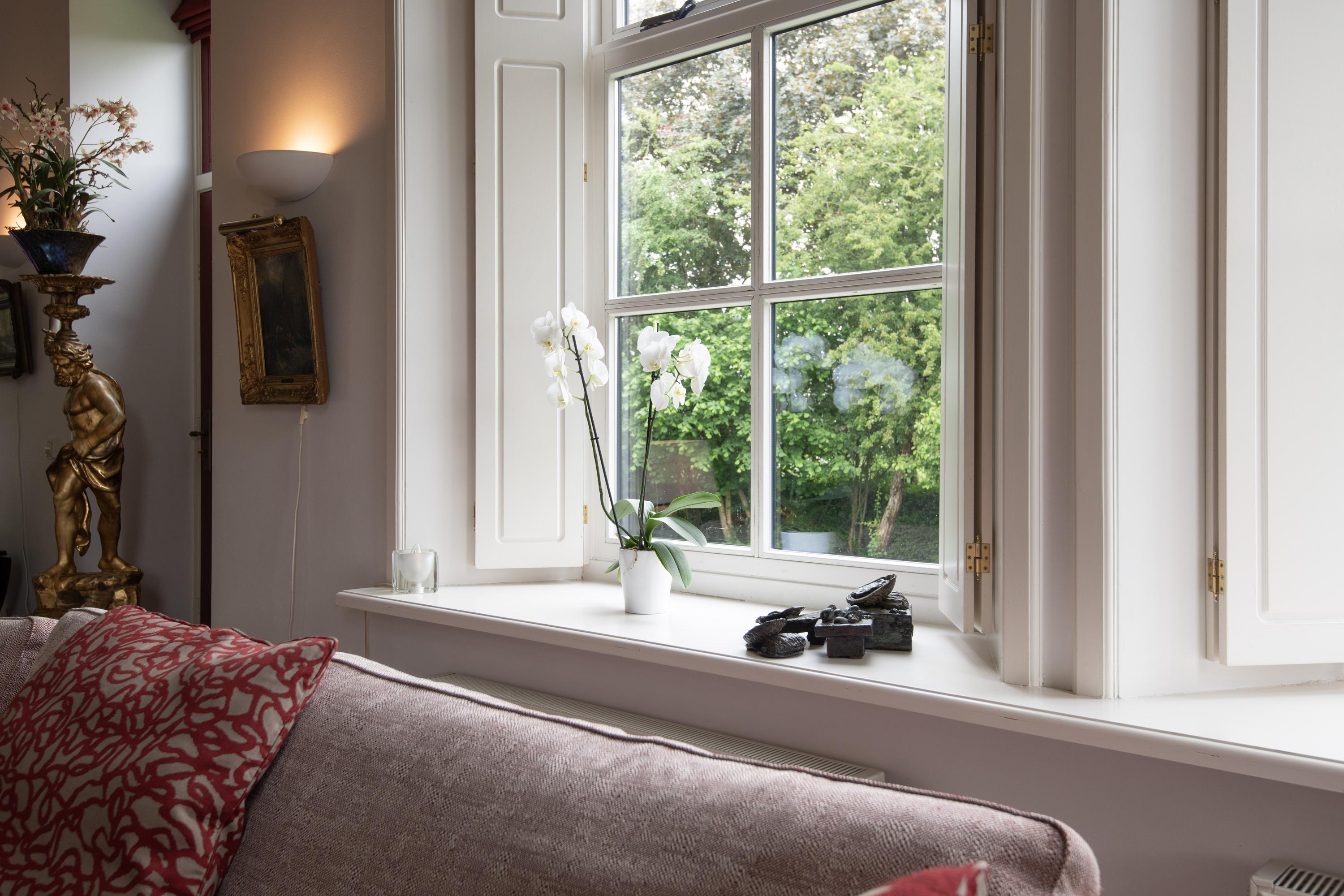 The original front door is located centrally in the front house but it is no longer used. The daily entrance is on the driveway side. The entrance is spacious and furnished with closets and a toilet. From the adjacent hallway is access to the living room. This sunny room with many skirted windows, flanked by interior shutters, breathes -with the almost three-meter high beamed ceiling- a pleasant atmosphere. In addition to the luxurious ceramic floor with underfloor heating, there is a natural stone fireplace with an open gas fire. In the living room are two passages that offer a view of the adjacent dining kitchen. This space offers access to the south-facing terrace through double French doors. Three mature Plane trees act as natural umbrellas there in the summer.