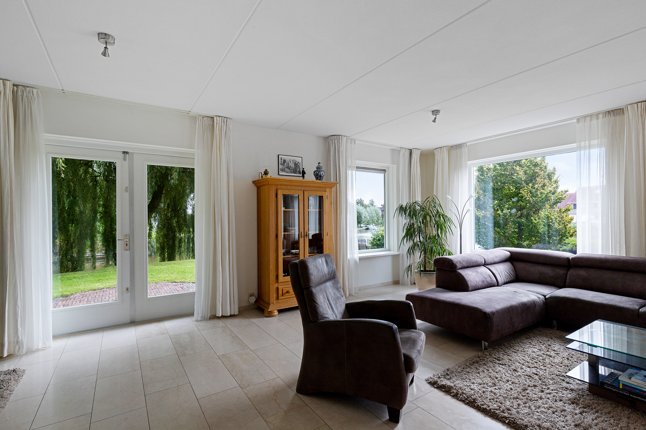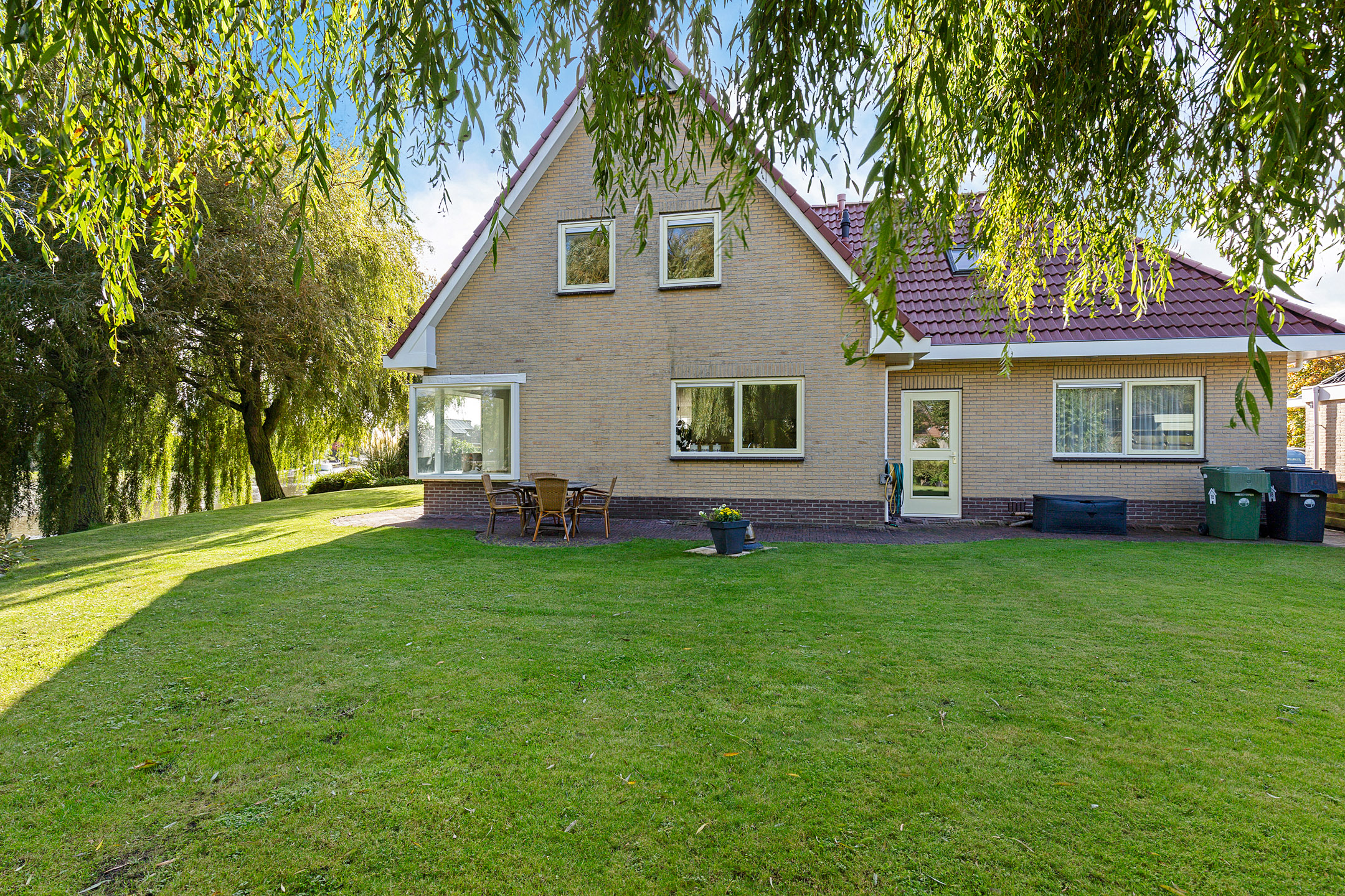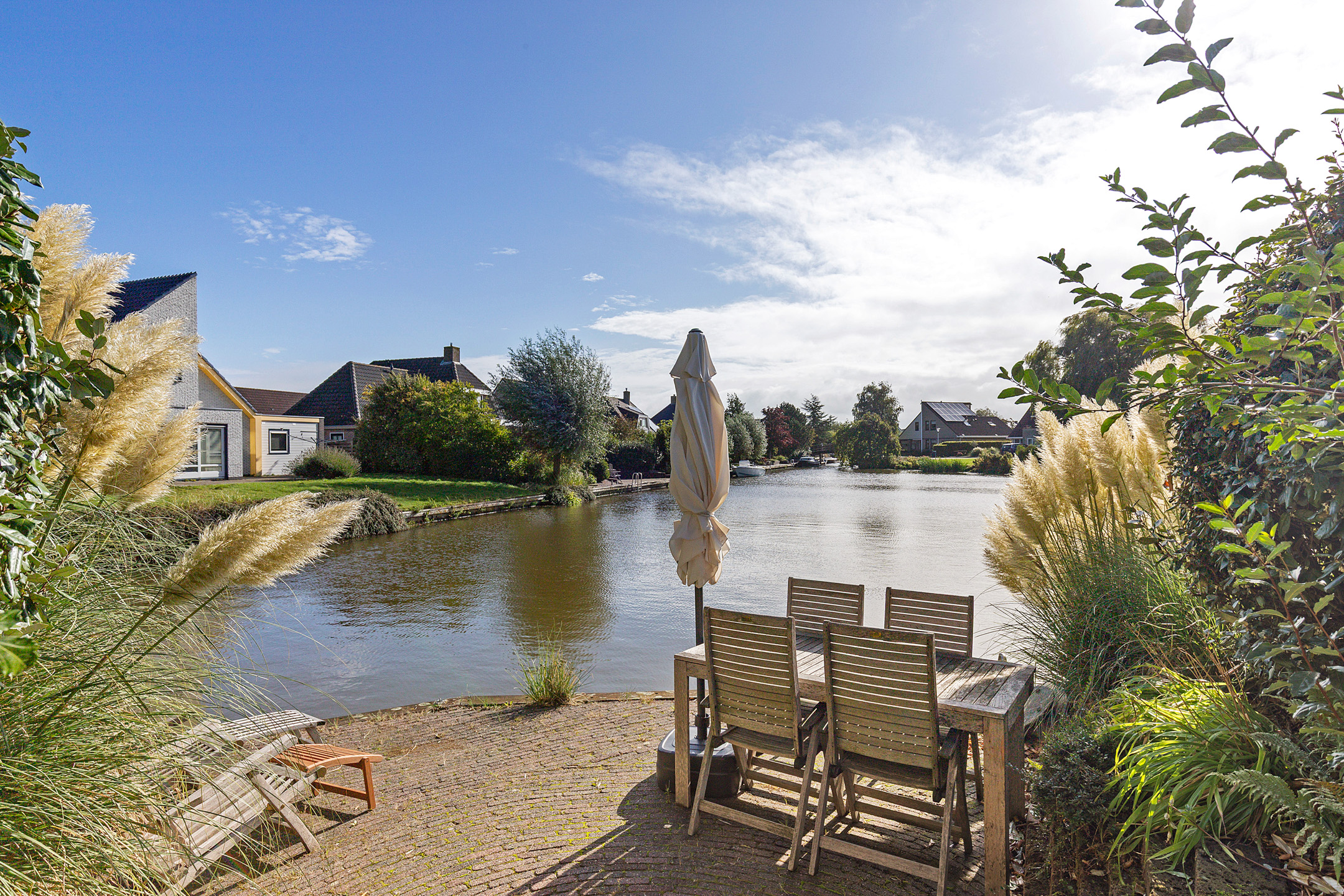 The beautifully landscaped garden with mature trees, shrubs, borders, and terraces ensures privacy and offers both sunny and shaded spots throughout the day. A sunken south-east facing terrace directly on the water, complete with a private swimming ladder, is the perfect place to enjoy your morning coffee or relax all day while watching boats pass by. The waterway is a branch of the famous *Bolswardervaart*, part of the historic Eleven Cities Route, and is accessible by boat.